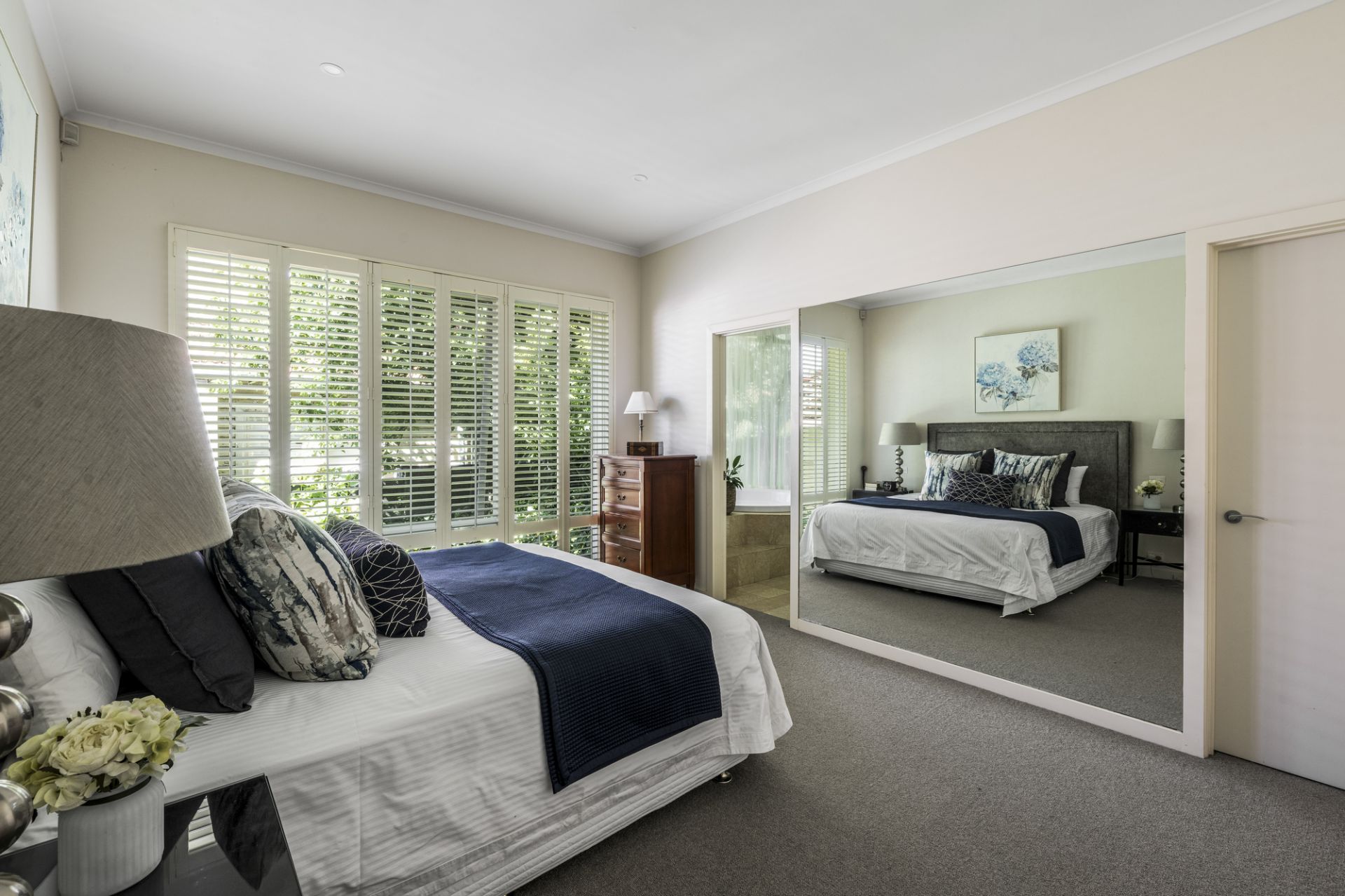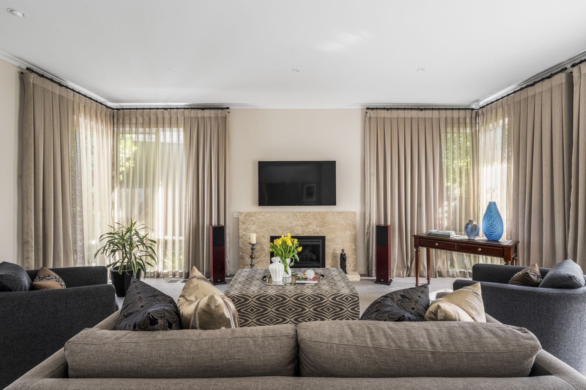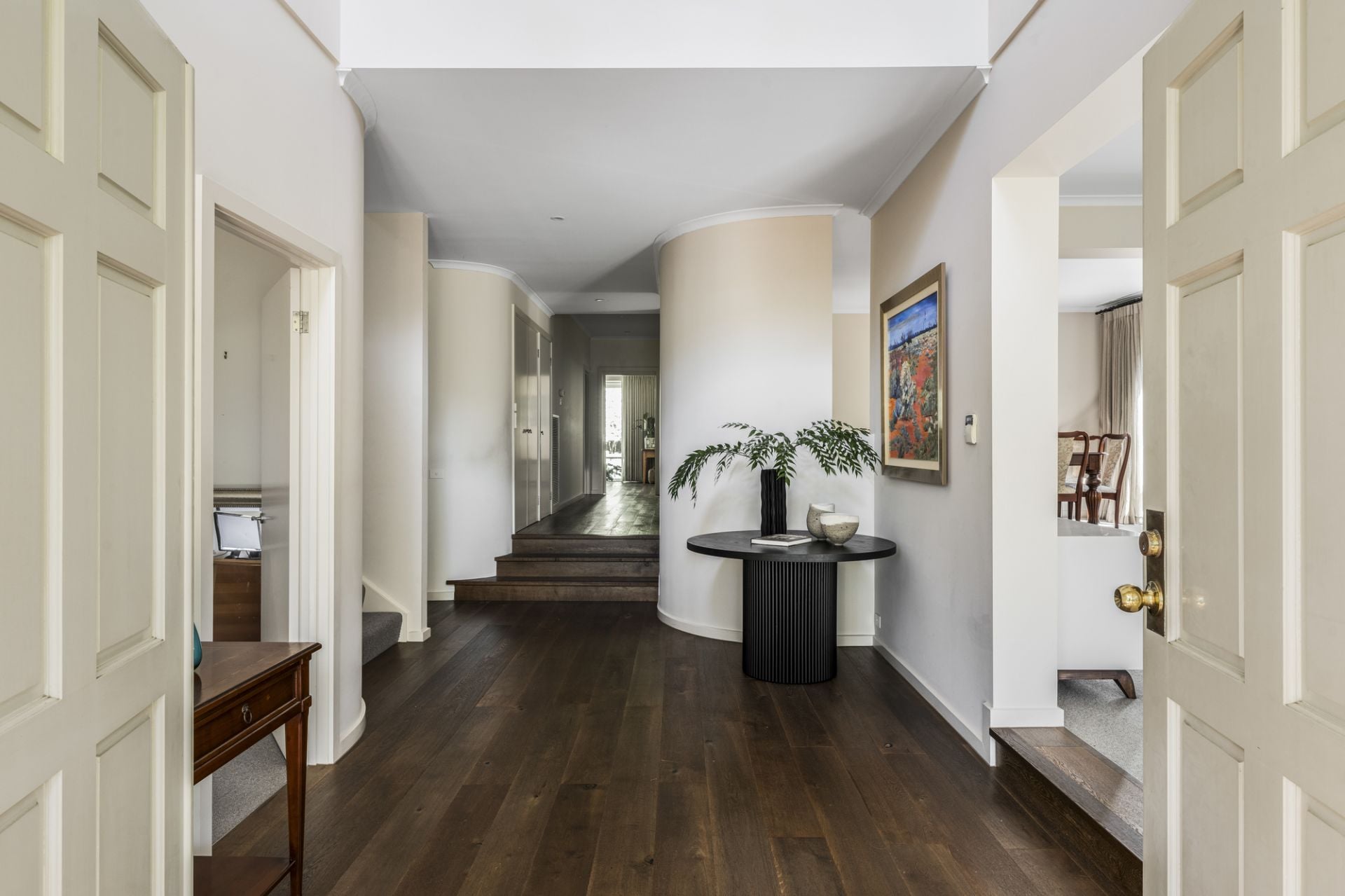 Architectural columns and curves frame an imposing façade setting a tone of sumptuous elegance that extends throughout from a two-level void entrance to the ground-floor’s large sitting room (HeatnGlo gas fireplace), formal dining room and executive study all overlooking picturesque garden. Further is a superb main bedroom suite (walk-in robe and marble-lined ensuite with a circular spa bath and a frameless-glass shower) followed by a chic powder room and a laundry.