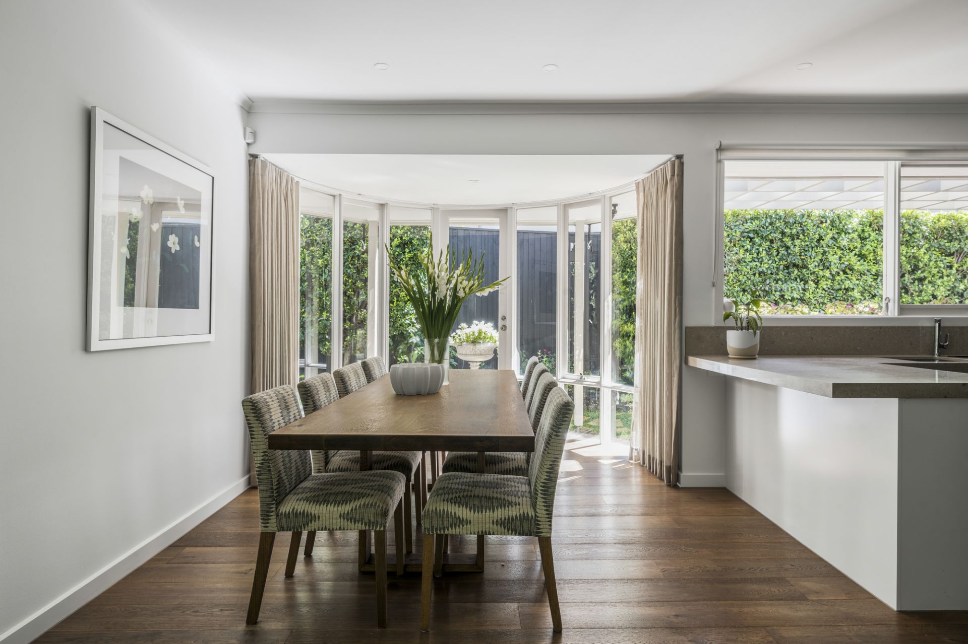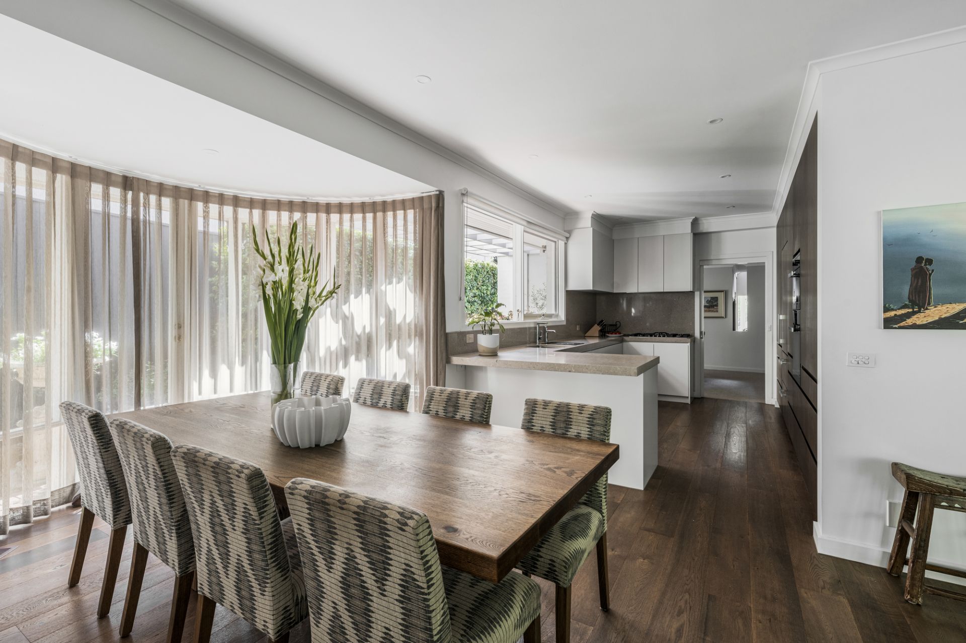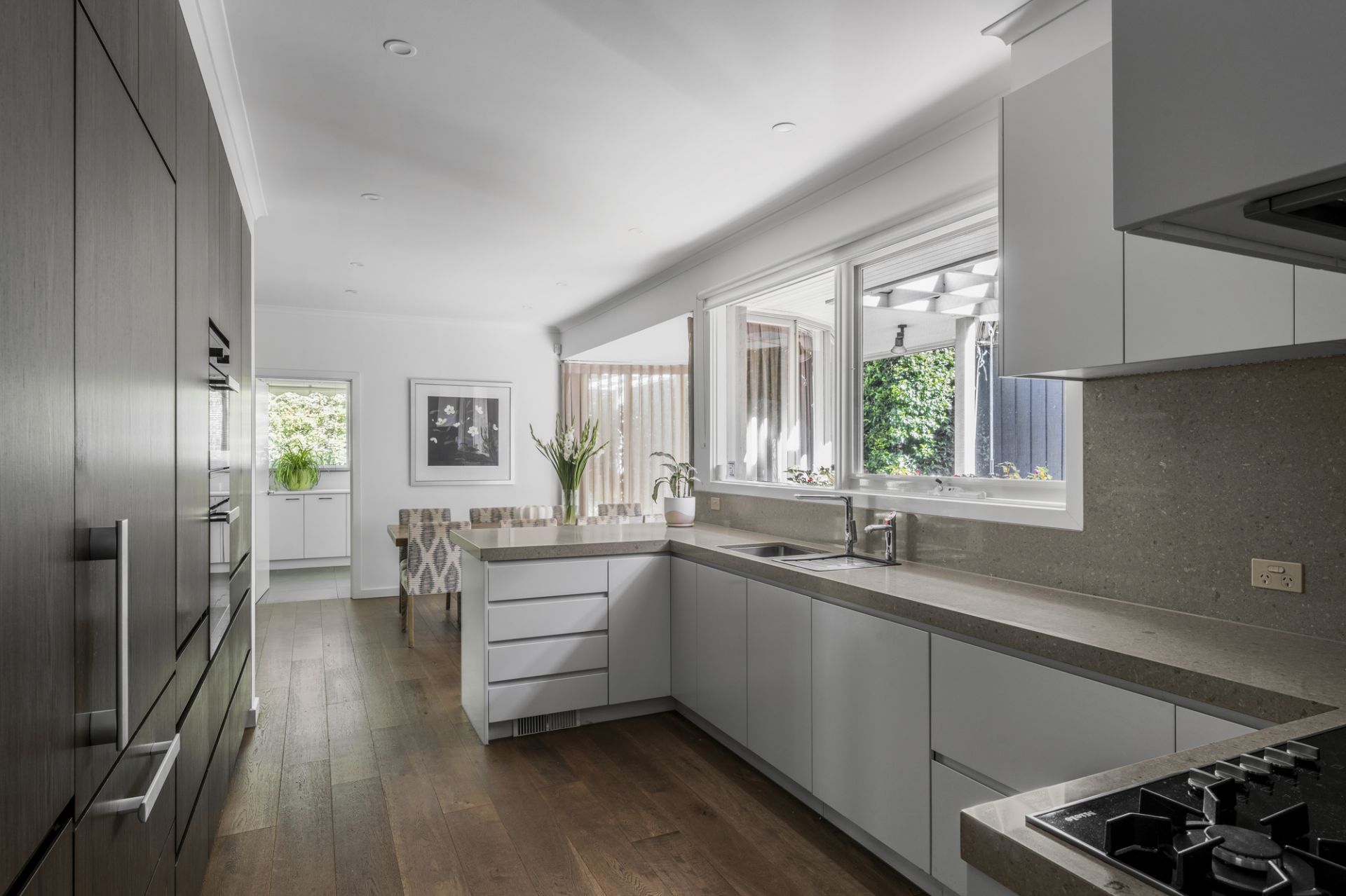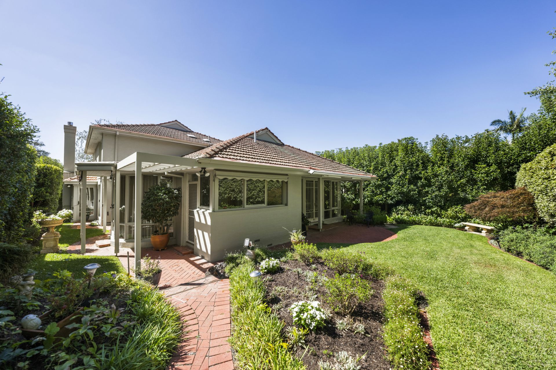 Additional accommodation is located on the first-floor and complemented by a stylish family bathroom and ensuite which features three sizable bedrooms with built-in robes including a huge third with shared access to the ensuite. At the rear is a stunning chef’s kitchen integrating Miele appliances, Liebherr fridge/freezer and a Zip tap, that flows to a bay window dining area and living room with a speaker system opening to a leafy garden oasis with a retractable-awning alfresco terrace.