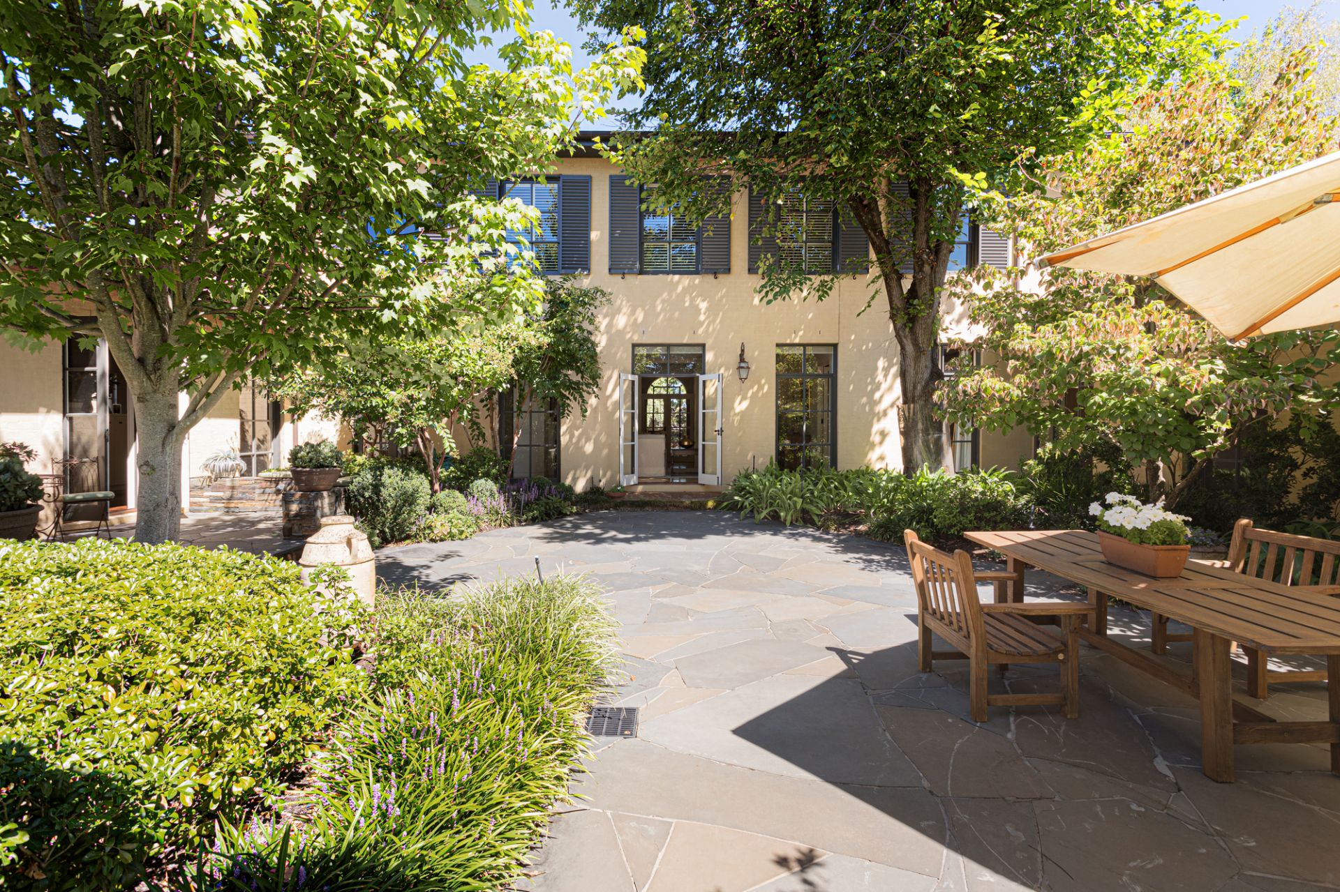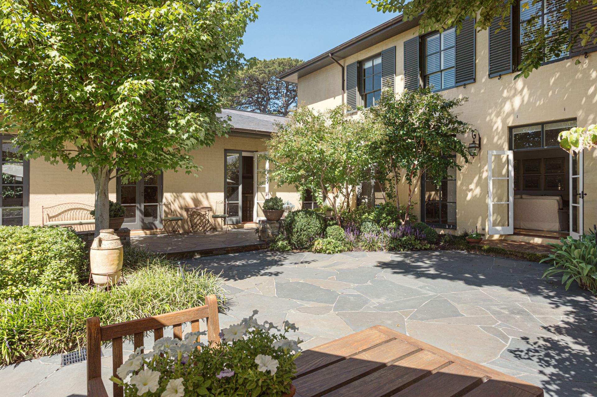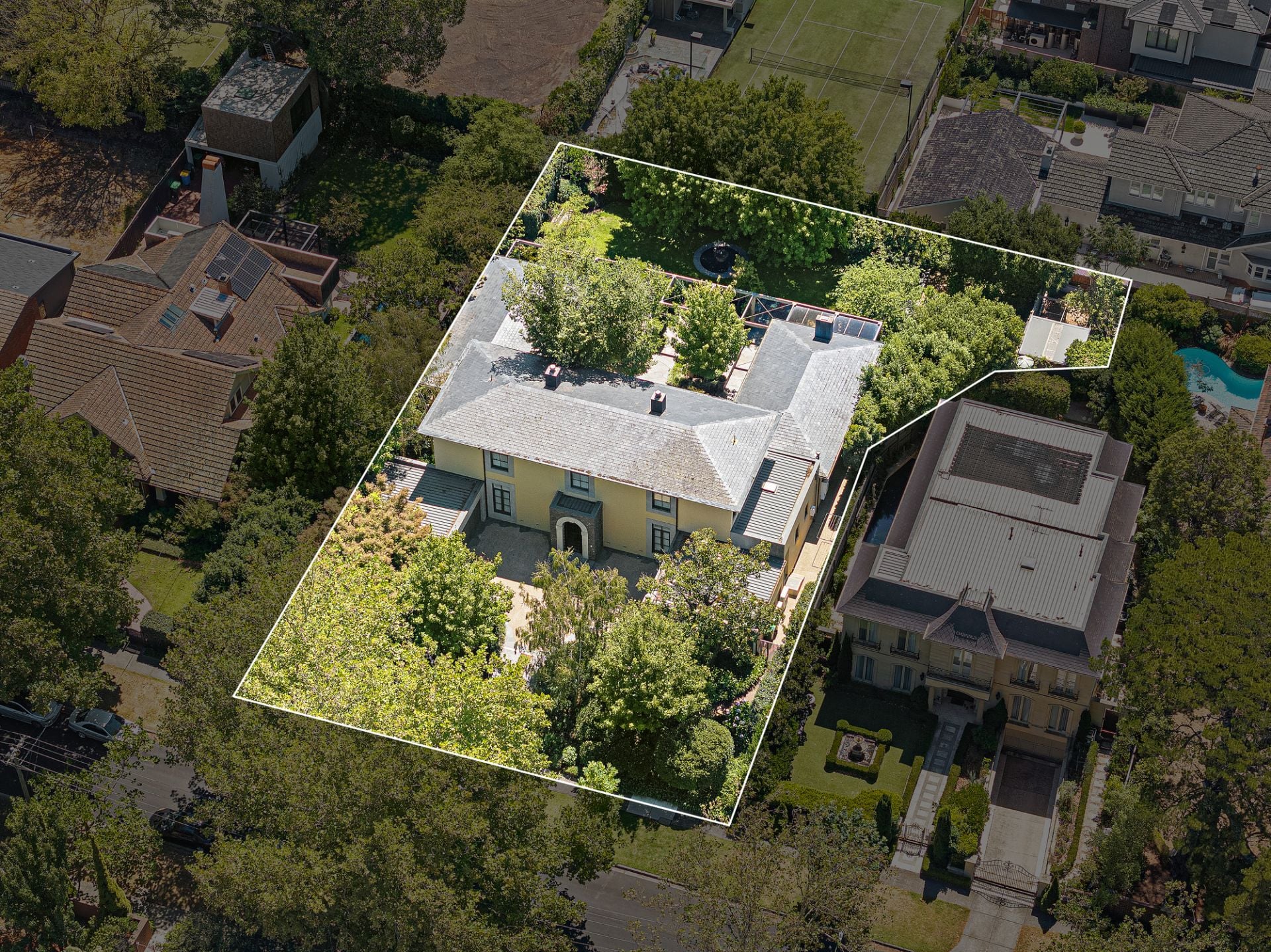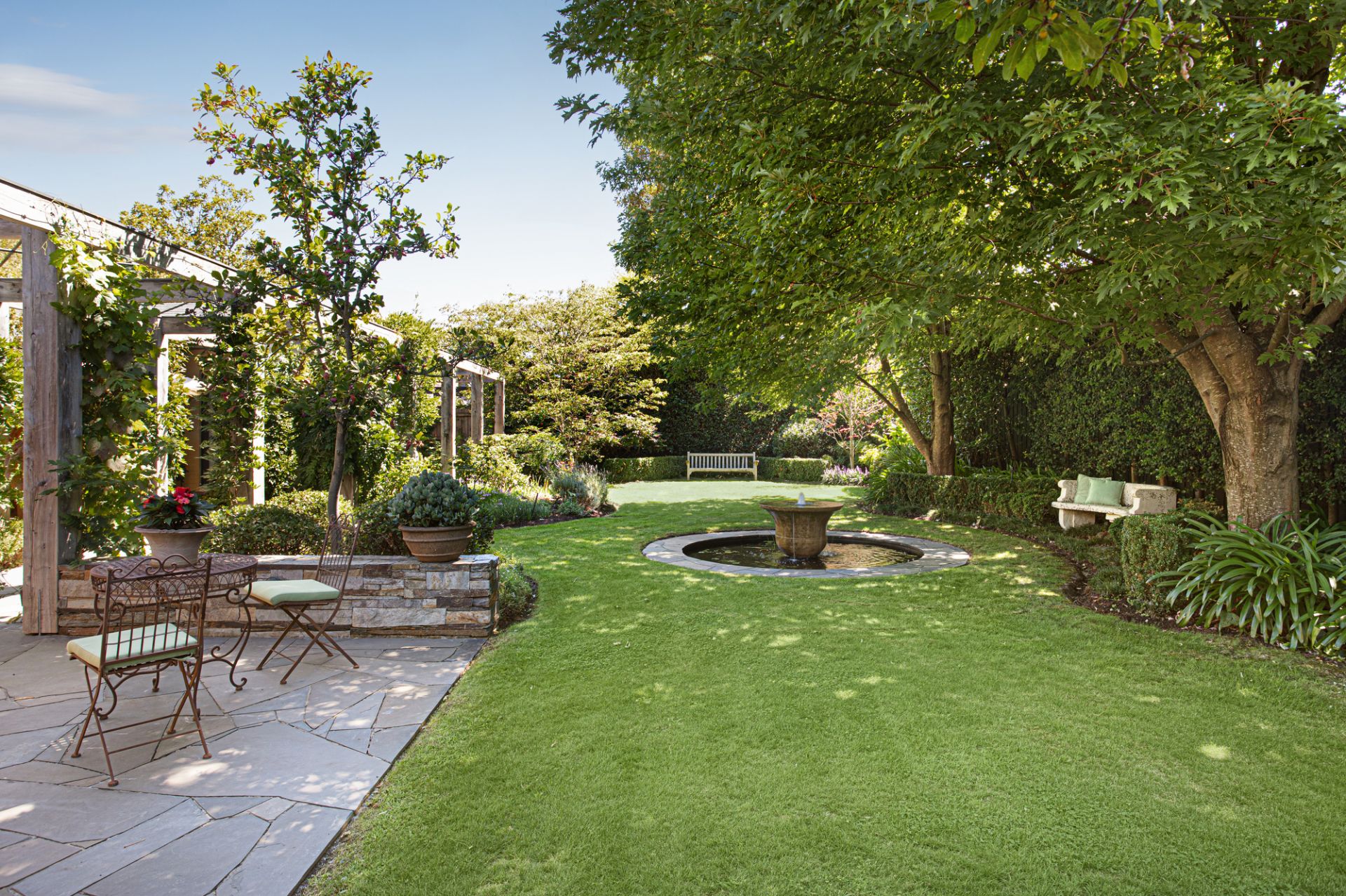 A sanctuary of leafy elegance unfolds in the substantial north-rear garden with Edna Walling-inspired dry-stone walls, rolling pathways and lush established plantings create an enchanting, private retreat. Sprawling crazy slate paving extends beneath a towering timber pergola framing an alfresco entertaining terrace designed for large-scale gatherings and garden parties overlooking a circular pond and fountain, and a finely-manicured lawn.