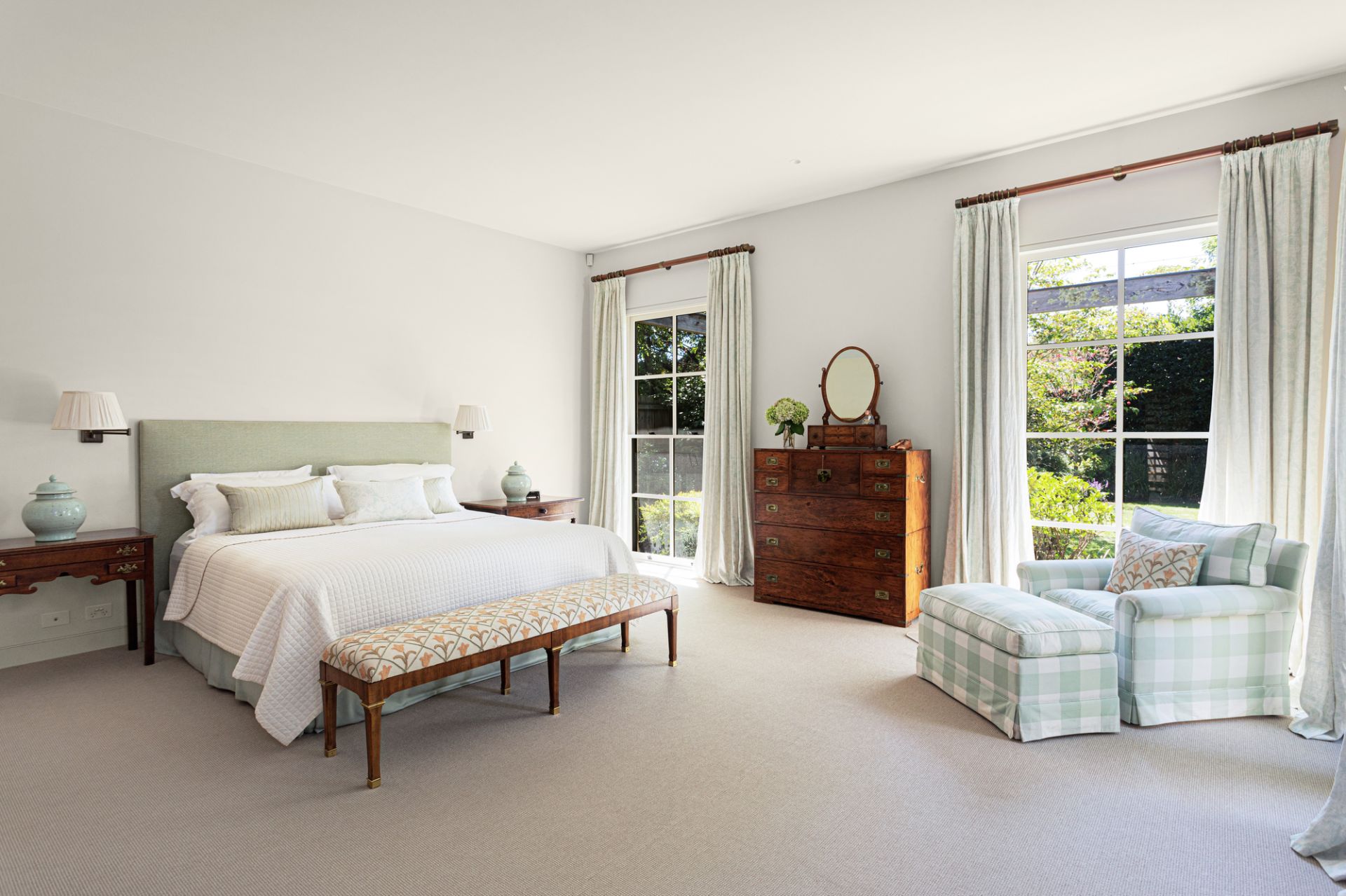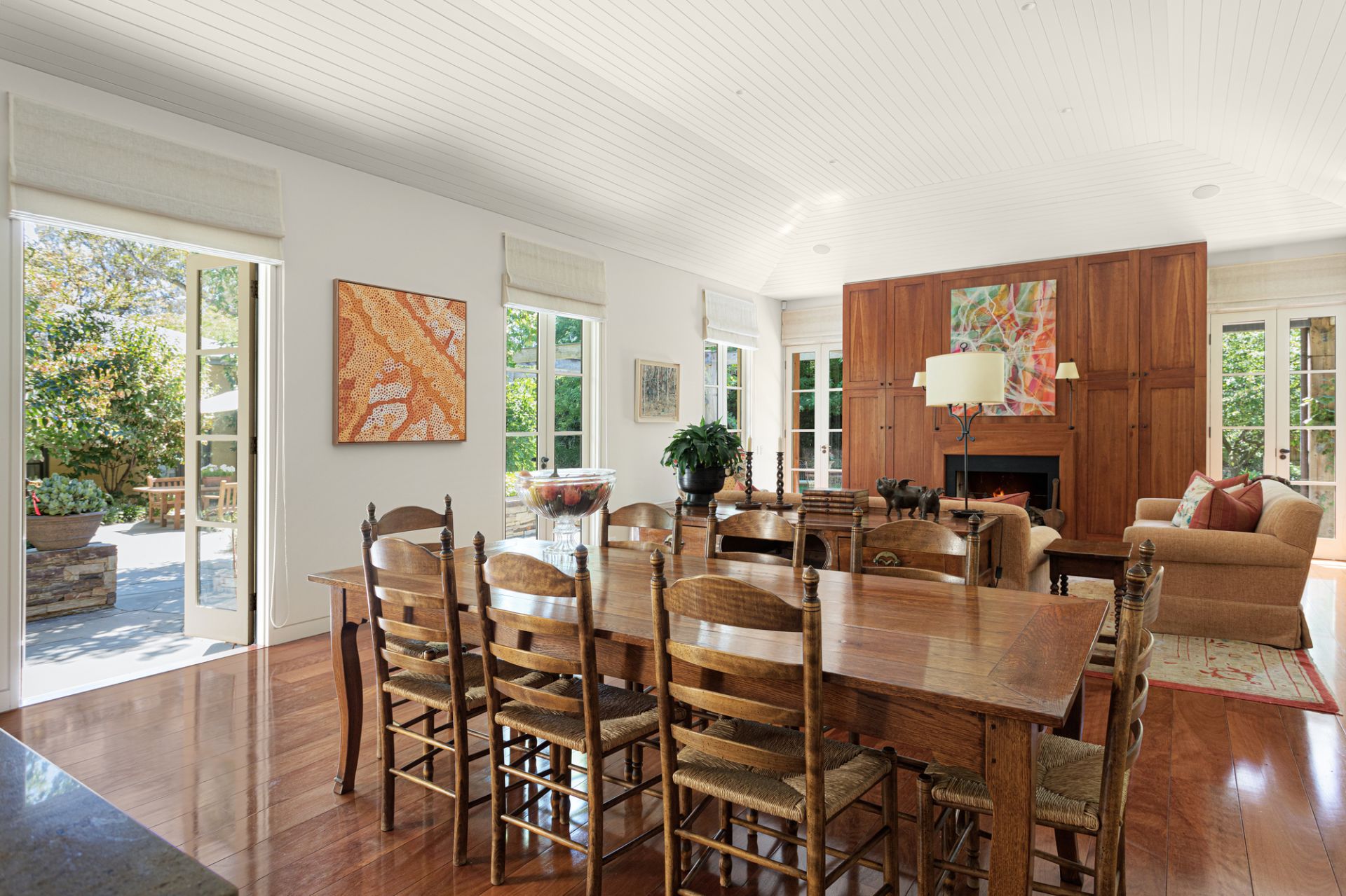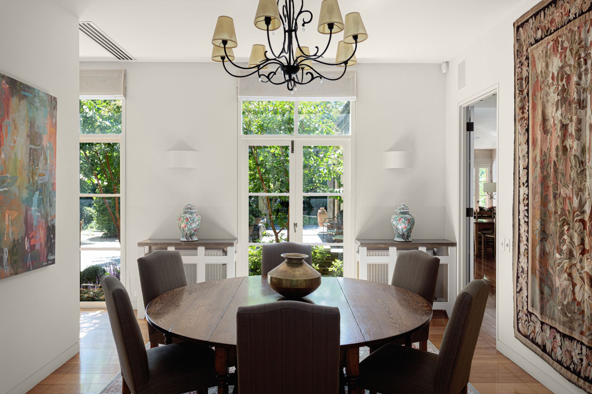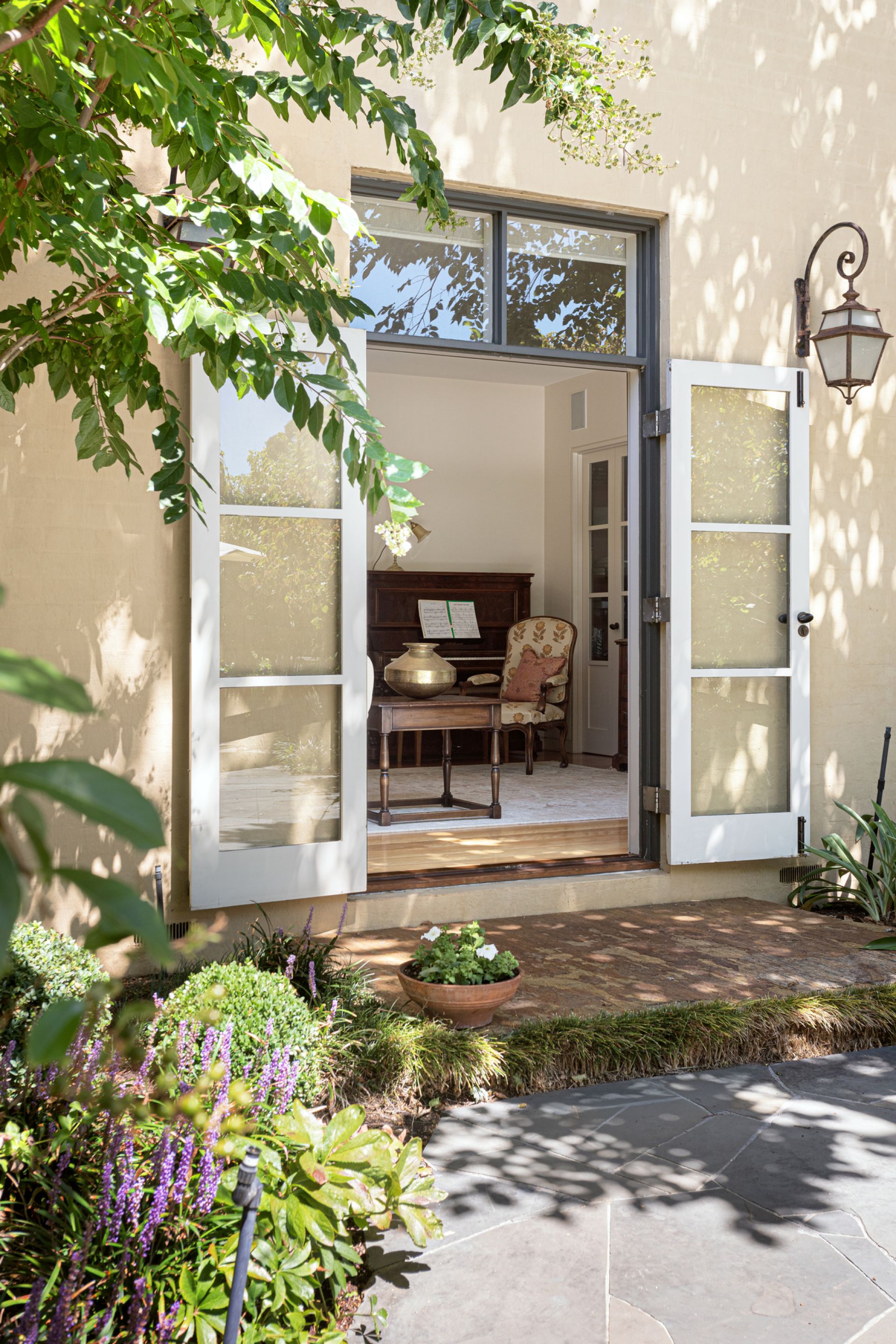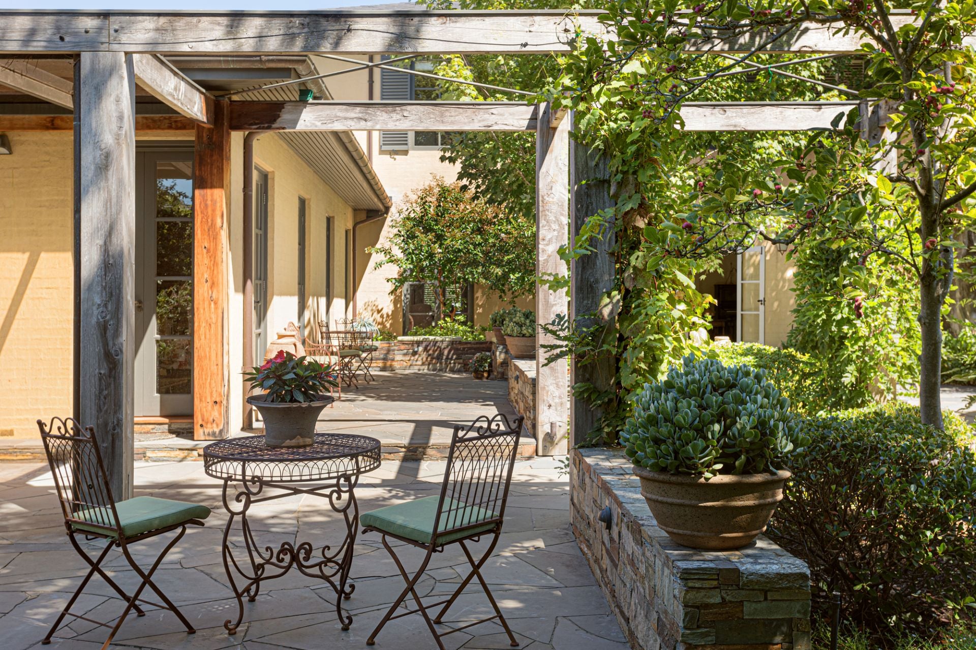 A sanctuary of leafy elegance unfolds in the substantial north-rear garden with Edna Walling-inspired dry-stone walls, rolling pathways and lush established plantings create an enchanting, private retreat. Sprawling crazy slate paving extends beneath a towering timber pergola framing an alfresco entertaining terrace designed for large-scale gatherings and garden parties overlooking a circular pond and fountain, and a finely-manicured lawn.