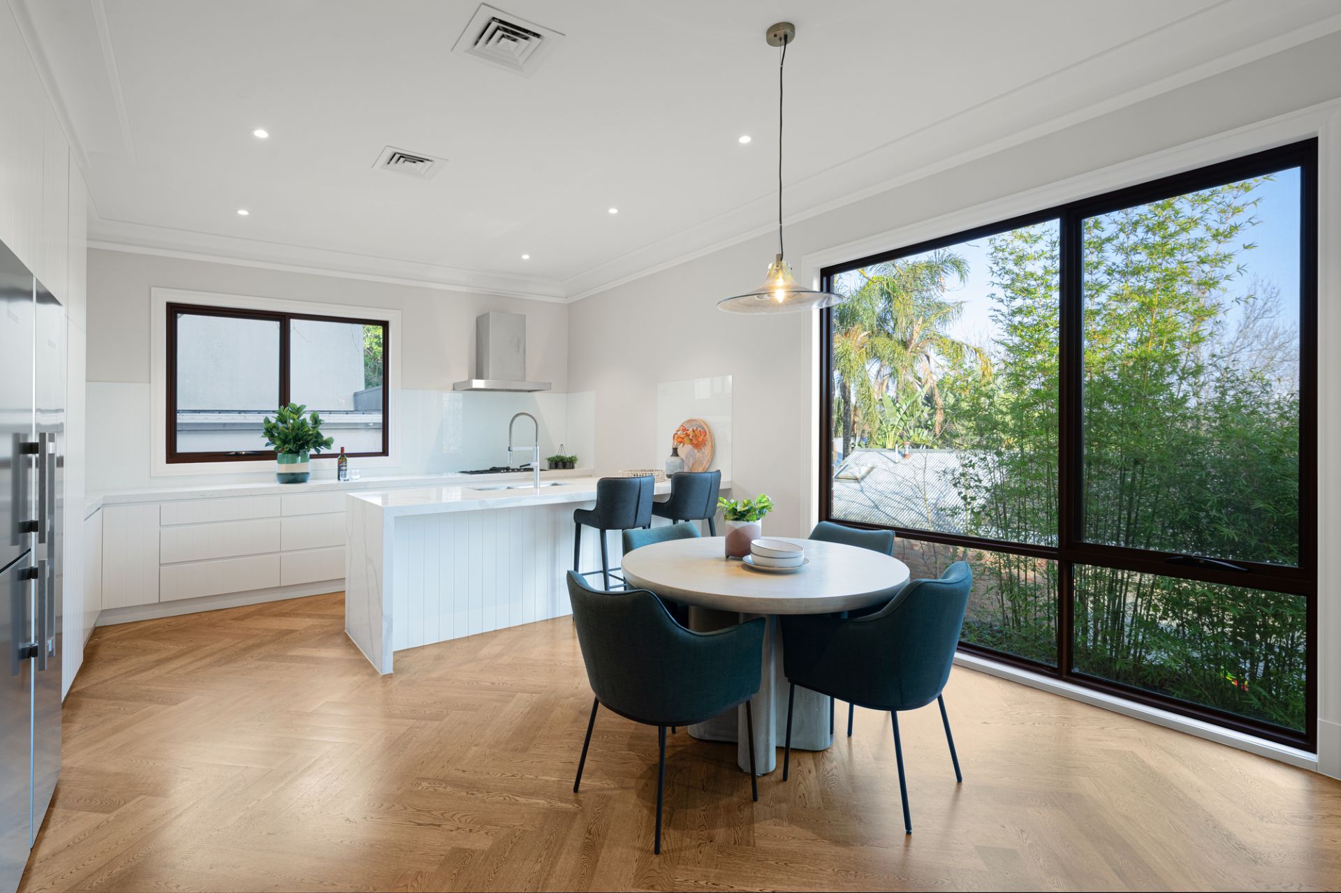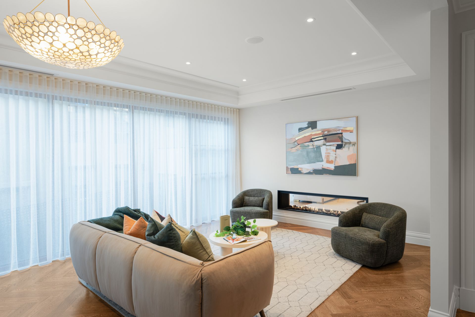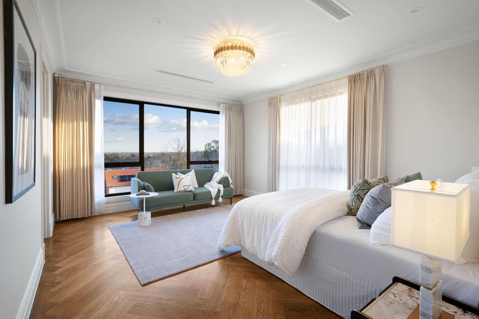 Enter a world of sheer luxury and opulent sophistication set amid glorious landscaped gardens, introduced by a grand entrance hallway with European Oak herringbone parquet floors, a ground floor guest bedroom suite, and additional powder room. Every occasion is perfectly catered for with a formal sitting room’s two-way gas fireplace linking to an additional family living and dining room, overlooking a tranquil goldfish rockpool and an alfresco deck. A clever arrangement for those that love to entertain, the primary kitchen is fitted with premium Miele appliances and dressed in solid natural stone, while a secondary kitchen or Tea Room, includes a meals area and a walk-in pantry that all open out to an elevated sunroom and terrace, capturing serene views and northerly light.