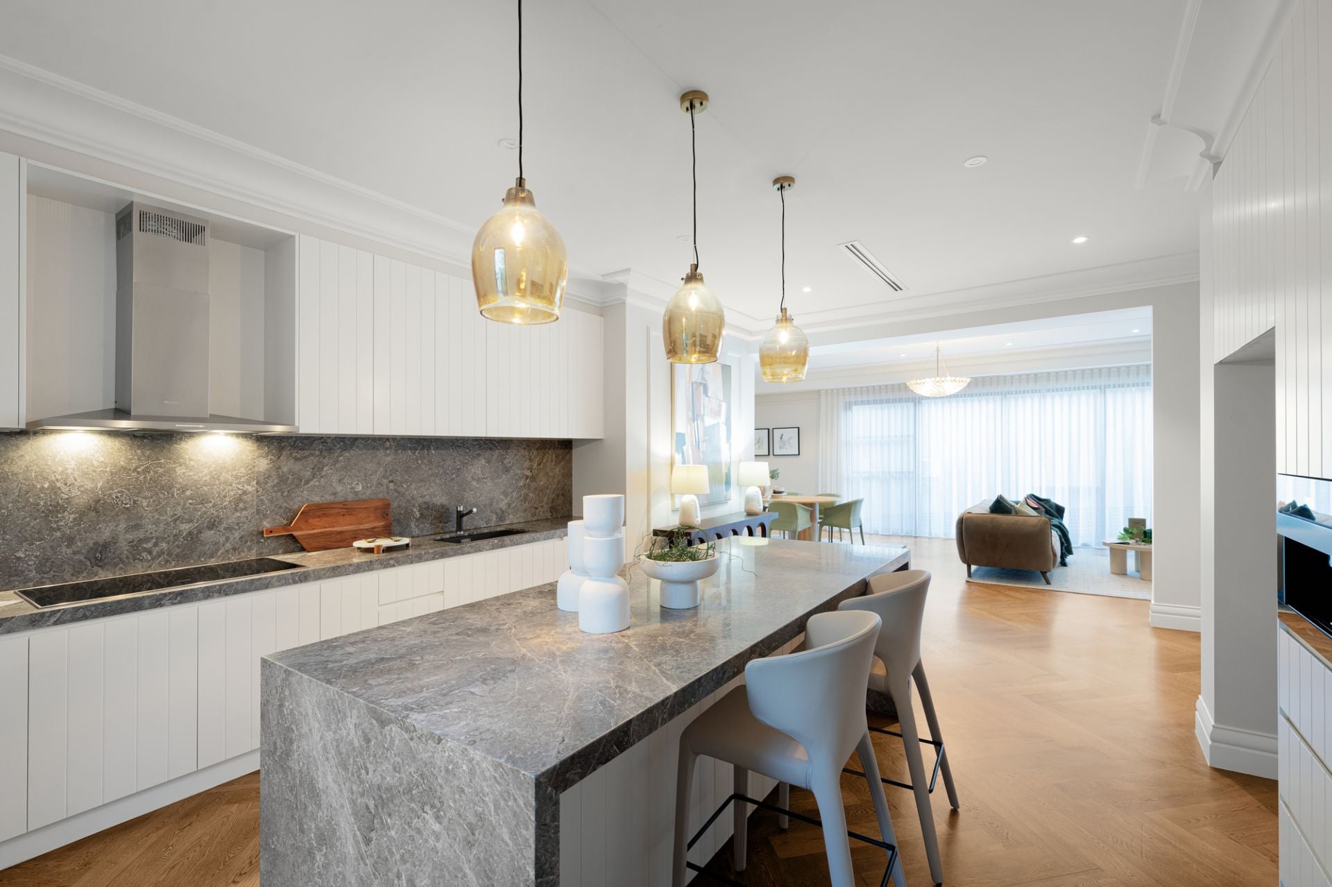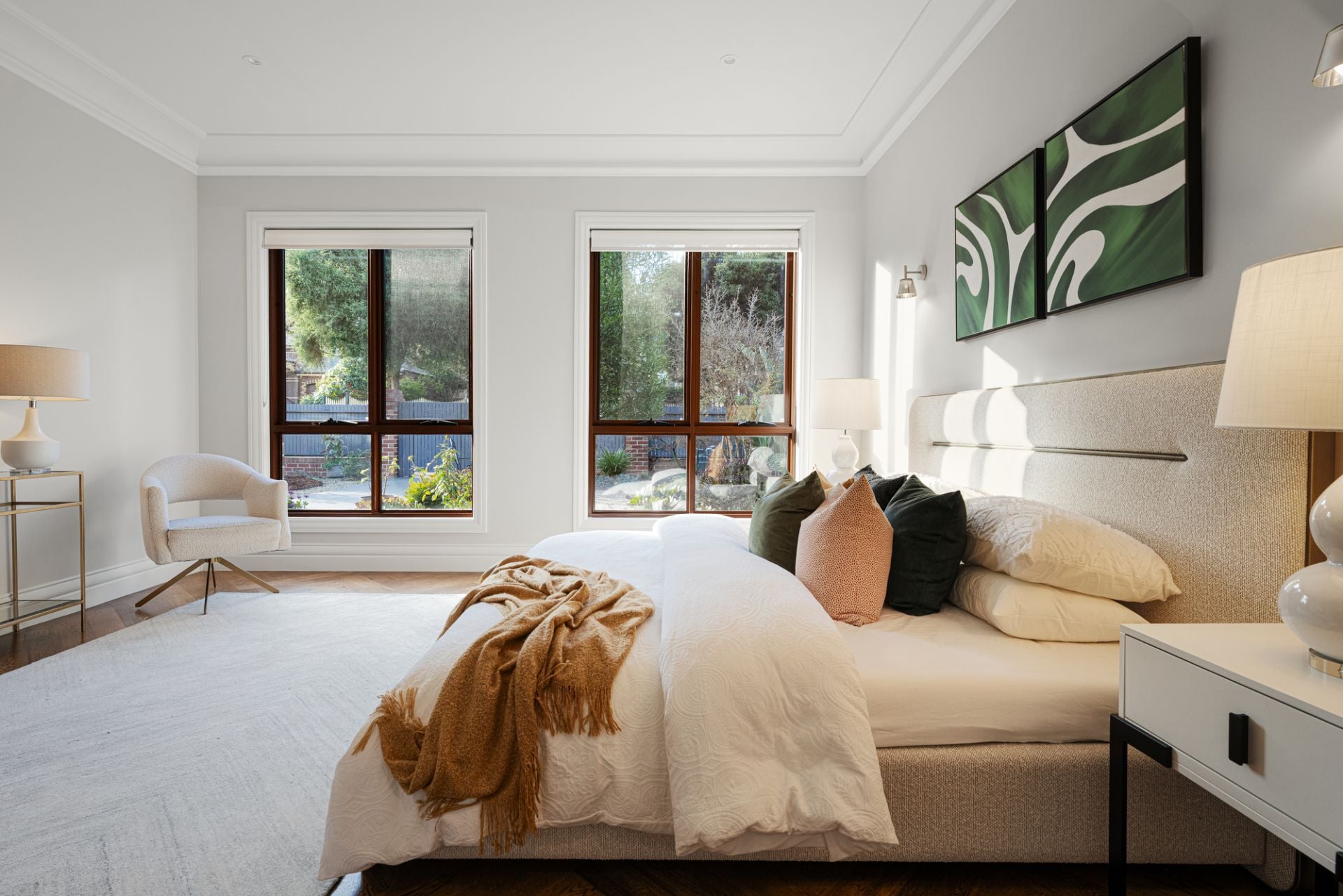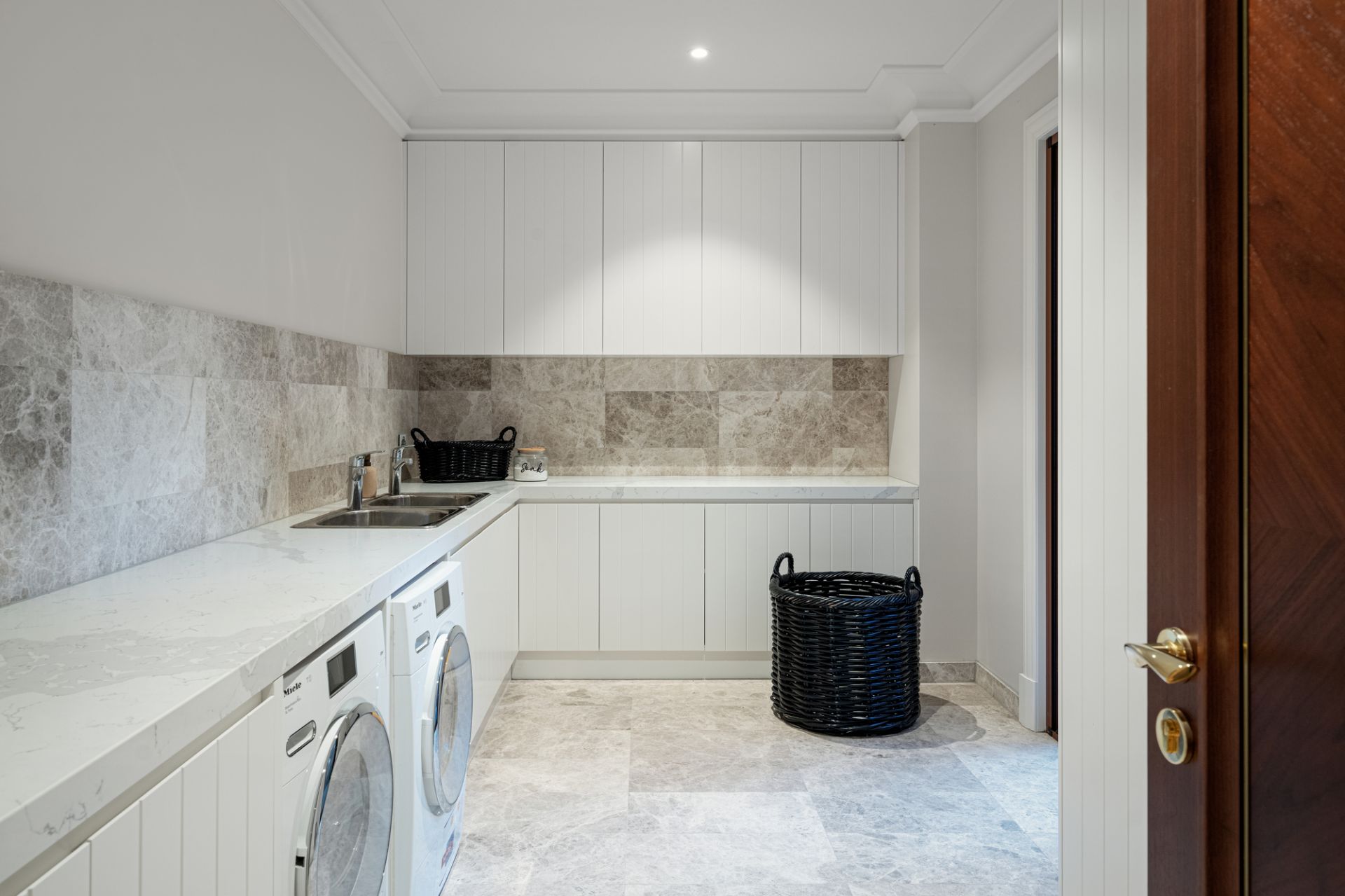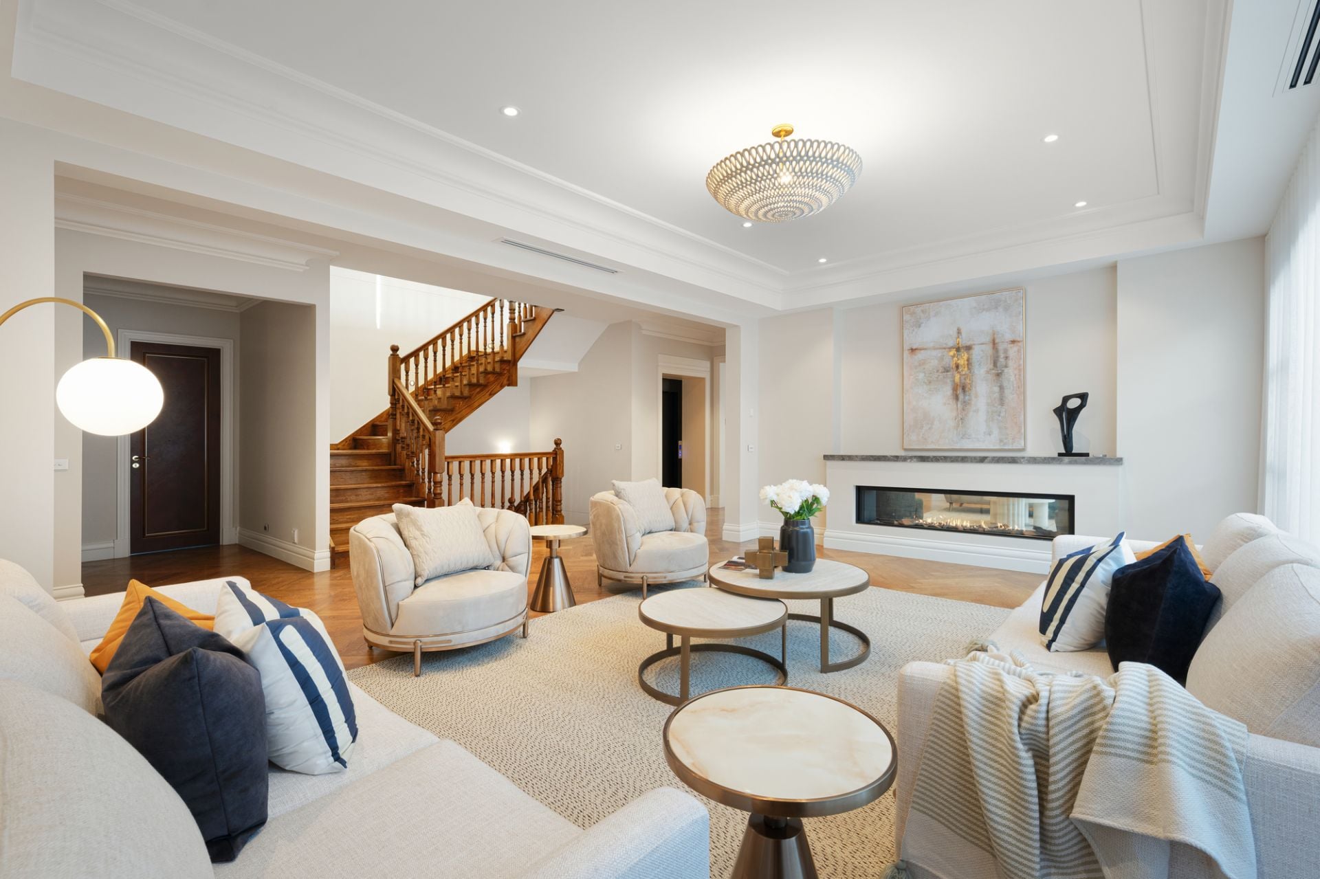 Enter a world of sheer luxury and opulent sophistication set amid glorious landscaped gardens, introduced by a grand entrance hallway with European Oak herringbone parquet floors, a ground floor guest bedroom suite, and additional powder room. Every occasion is perfectly catered for with a formal sitting room’s two-way gas fireplace linking to an additional family living and dining room, overlooking a tranquil goldfish rockpool and an alfresco deck. A clever arrangement for those that love to entertain, the primary kitchen is fitted with premium Miele appliances and dressed in solid natural stone, while a secondary kitchen or Tea Room, includes a meals area and a walk-in pantry that all open out to an elevated sunroom and terrace, capturing serene views and northerly light.