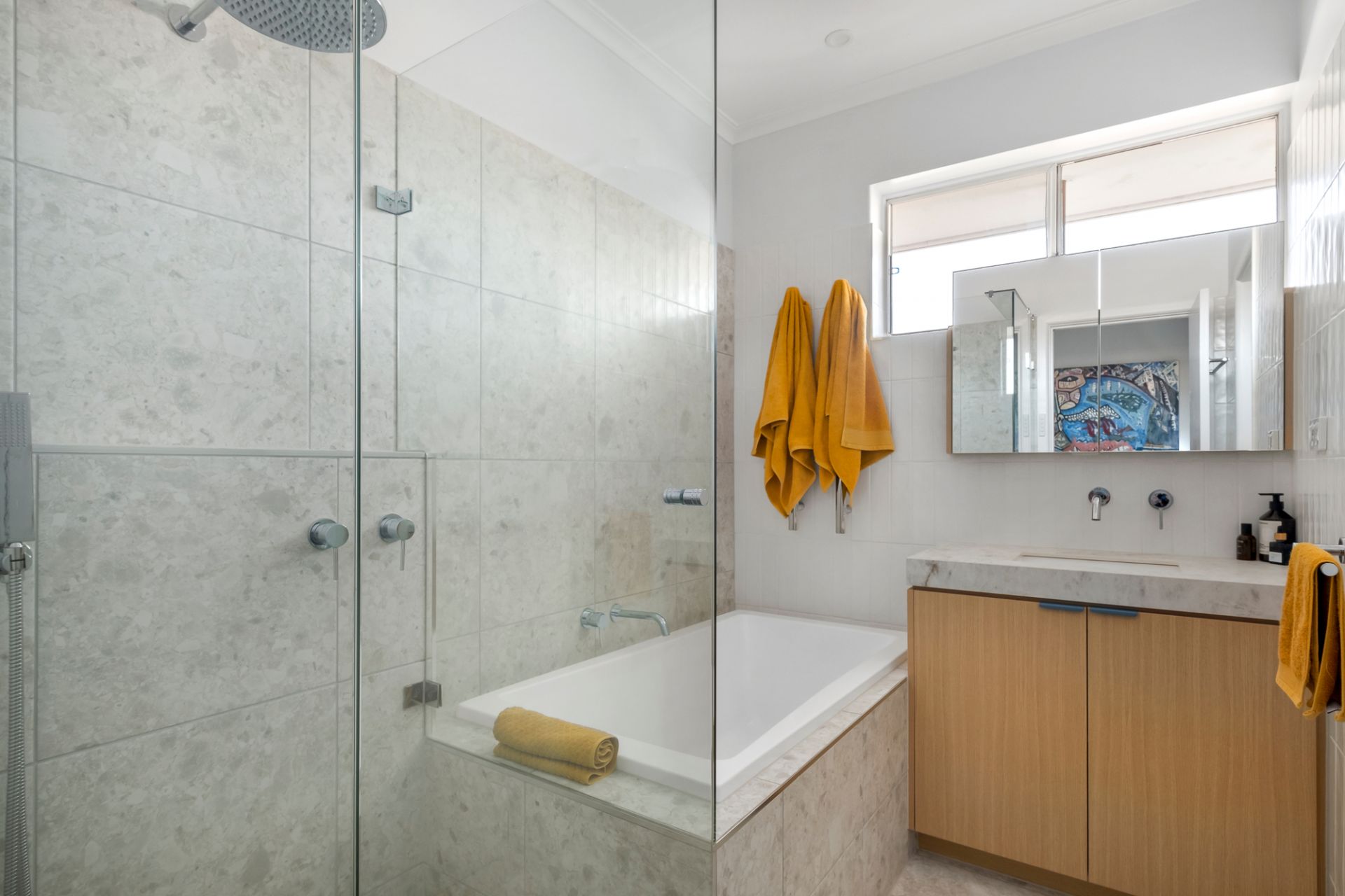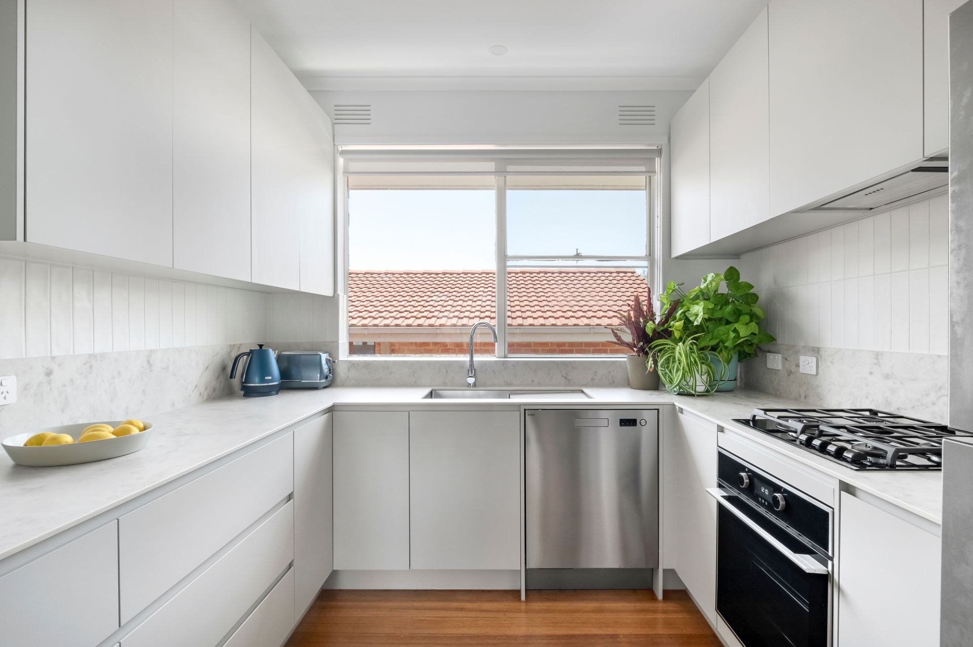 Elevated on the top floor to capture leafy vistas, the expansive living and dining area has been thoughtfully redesigned to embrace open, free-flowing living, extending effortlessly to a private, sunlit balcony. This space seamlessly connects to a modern recently-completed kitchen, with Blum soft-close storage, quality appliances and exceptional functionality with a walk-in pantry and integrated study nook. Both bedrooms are fitted with built-in robes, and share a stylishly updated bathroom that showcases the impeccable finish of the home, with a bath, spacious shower and a concealed WC.