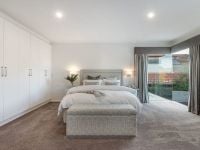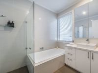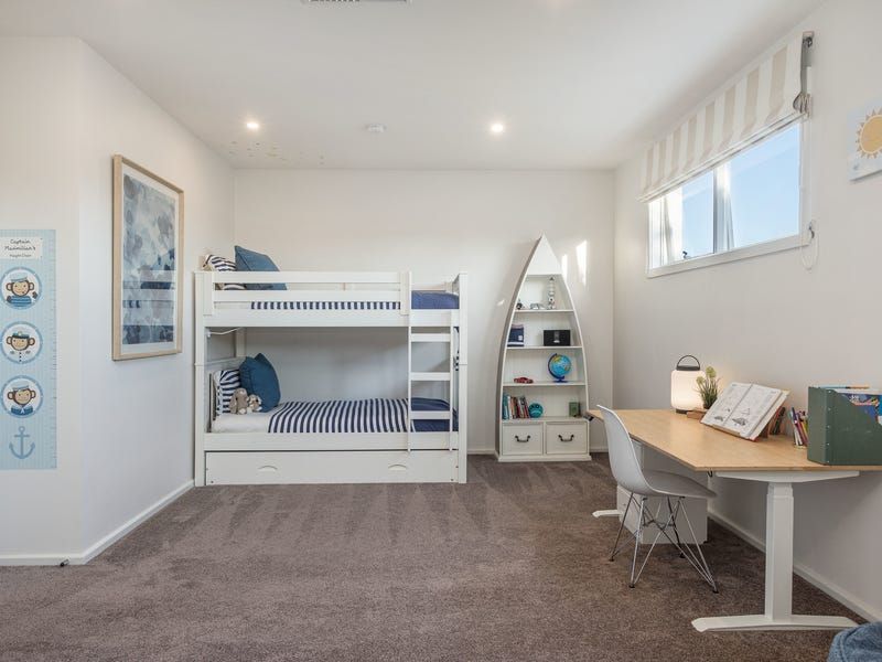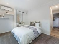 The white stone kitchen is a focal point, boasting a large central island bench, quality appliances, a walk-in pantry, and ample storage.Downstairs, an elegant formal lounge with striking curved glass windows provides garden views, while generously sized bedrooms with mirrored built-in robes and a sparkling central bathroom with shower, bath, and separate toilet complete the ground level. Natural light continues upstairs, revealing a large main bedroom with walk-in and built-in robes and a luxe ensuite, an additional bedroom with built-in robes, and a dedicated study space. The residence is equipped with hydronic heating, split system heating/cooling, a powder room, separate laundry, substantial storage throughout, double auto garage, and video intercom entry.