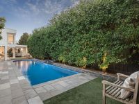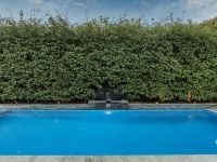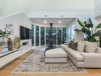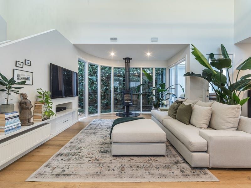 The sun-drenched, open-plan living and dining zone, with impressive proportions and timber flooring, is enveloped in glass, showcasing a Scandinavian wood fireplace and soaring two-storey ceilings. Revel in breathtaking views of the lush green surroundings from this inviting space. The connection extends effortlessly to a paved alfresco entertaining area with an automatic louvre roof, overlooking a large solar/gas-heated pool and spa and garden.