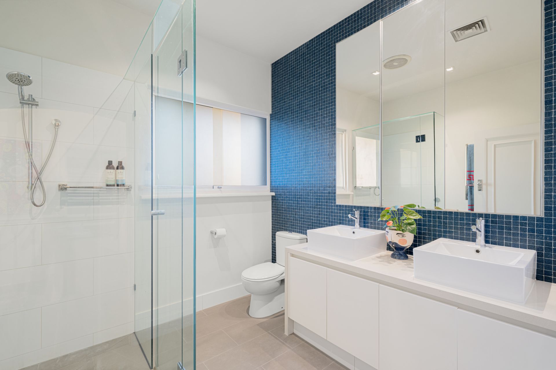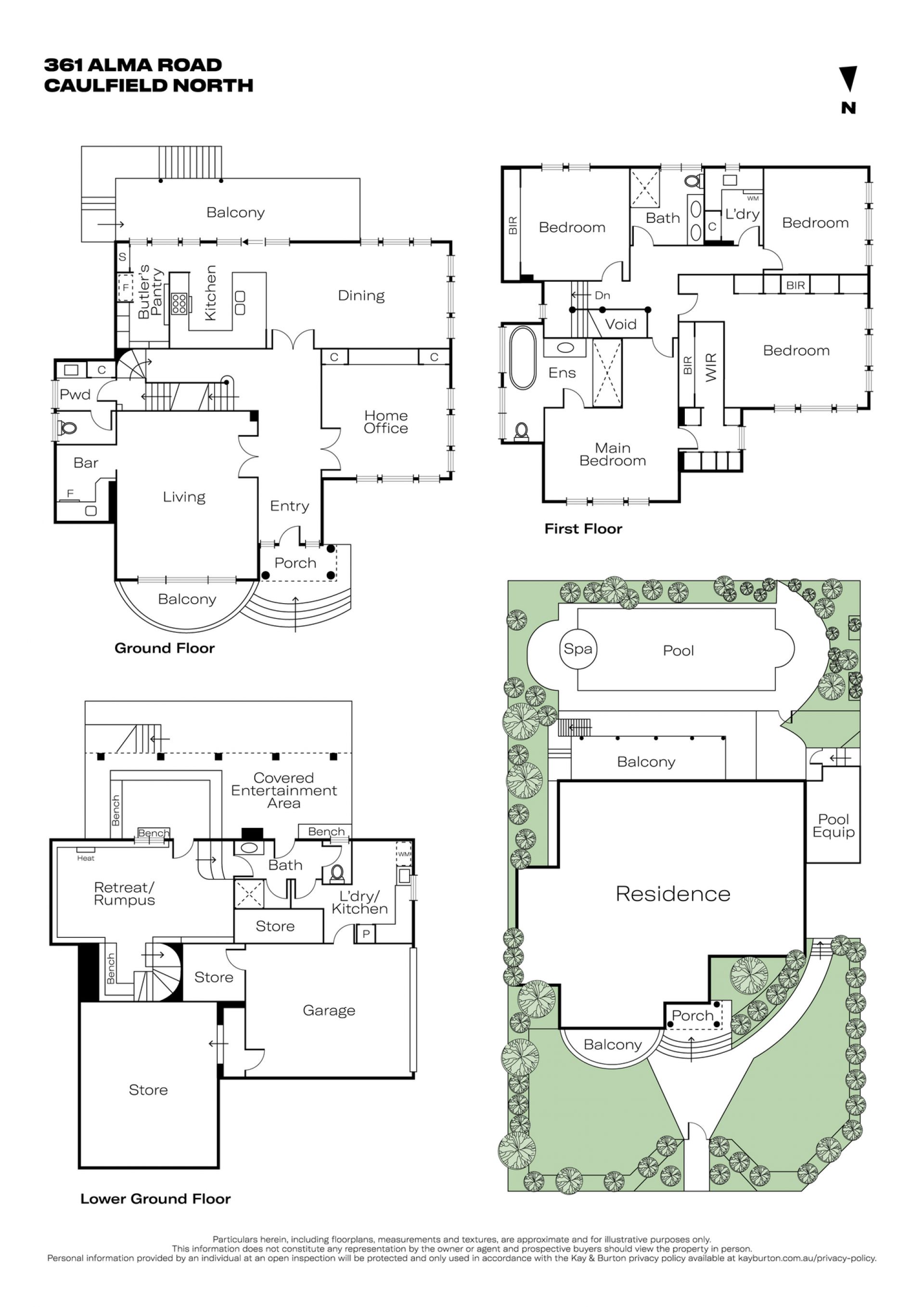 Enjoying sweeping, floral outlooks and glimpses of the nearby bay, a serene upper storey provides ample accommodation for large families, with four expansive bedrooms accompanied by extensive walk-in and built-in storage, a twin-basin central bathroom, and main-bedroom ensuite with floor and towel-rail heating, a soaker tub, and double-width shower. With a pool-serving lower bathroom, large laundry (potential kitchen), versatile studio/bedroom, and direct side-gate access combining to act as a guest’s suite, other highlights include ducted heating, refrigerated cooling, garden irrigation, a ground-level powder room, full-size main laundry, mains-gas connection to deck, considerable cellar and storeroom, and secure garage accessed via Muntz Street.