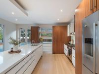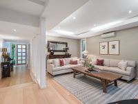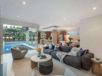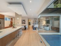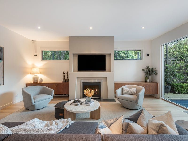 Awash with natural light, it features neutral tones, warm textures, bespoke cabinetry and timber and stone throughout. The timber-floored hall flows from the front door past the fully fitted study with American Oak cabinets, formal living room with French doors to a private courtyard garden, home theatre and powder room before arriving at the informal domain. The living zone with a cosy gas fireplace has views of the heated pool through floor-to-ceiling windows.