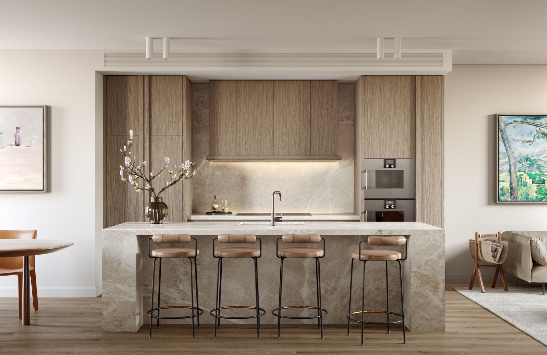Architect-designed homes by Cera Stribley, expertly crafted to embrace space, natural light and refined detail. Each residence in this limited collection offers three spacious bedrooms with built-in robes, including a main suite with a luxurious ensuite. The generous, double-height living areas create an immediate sense of openness, flowing seamlessly to the high-end Gaggenau kitchen finished with stone benchtops. Bathrooms are beautifully appointed with floor-to-ceiling tiling and stone-finished vanities, while engineered timber flooring and plush wool blend carpets deliver warmth and texture throughout.