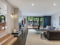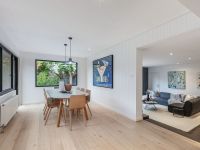 The airy living zone benefits from a striking polished concrete floor and Heat & Glo gas fire and opens on to a wraparound, sunny deck which is the perfect spot for alfresco dining. A second sitting room with built-in desk area and cabinetry offers further space for a family to spread out, while the dining area is flooded with sunlight and leafy views of the landscaped garden thanks to its dual-aspect windows.