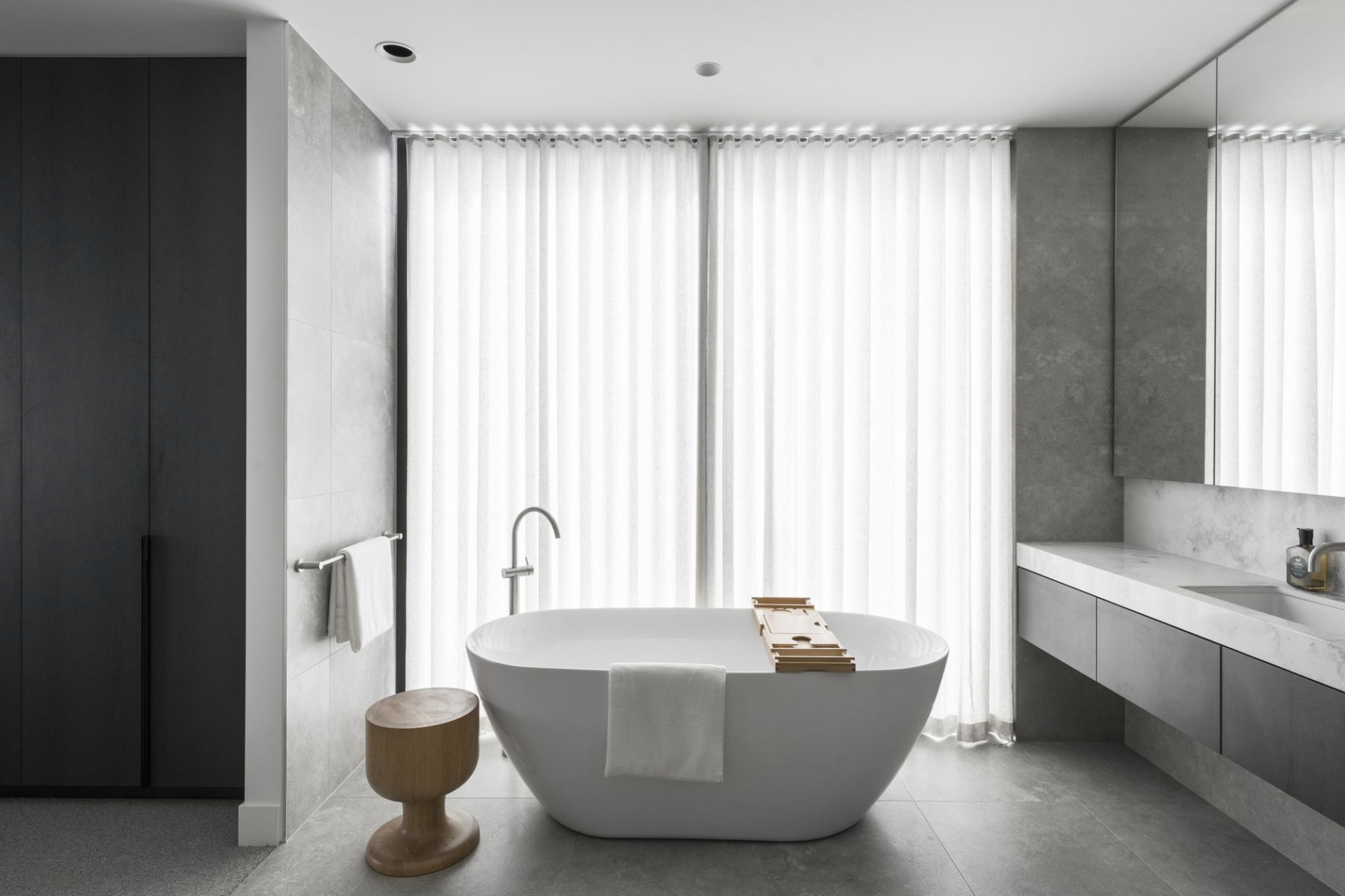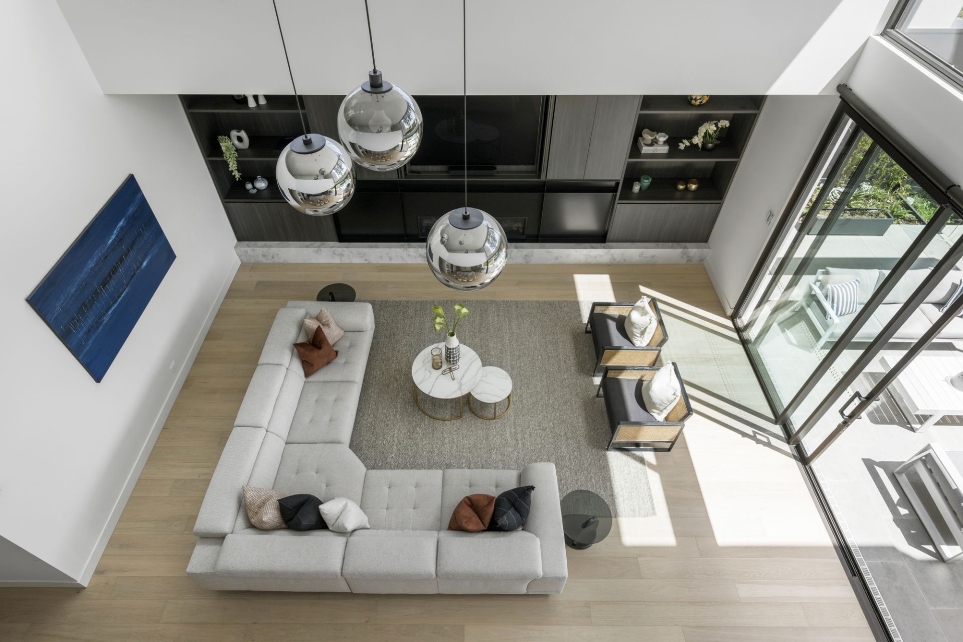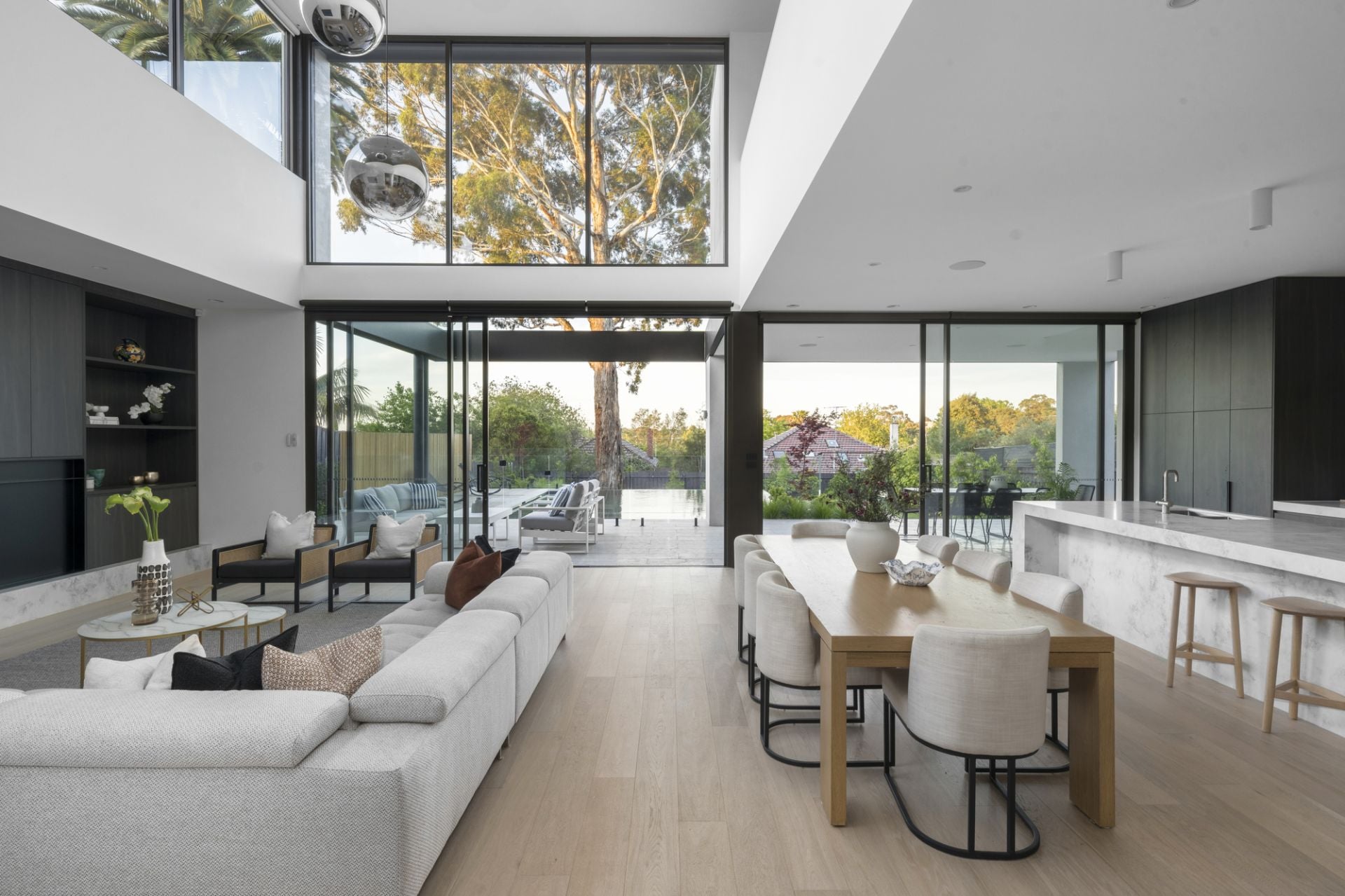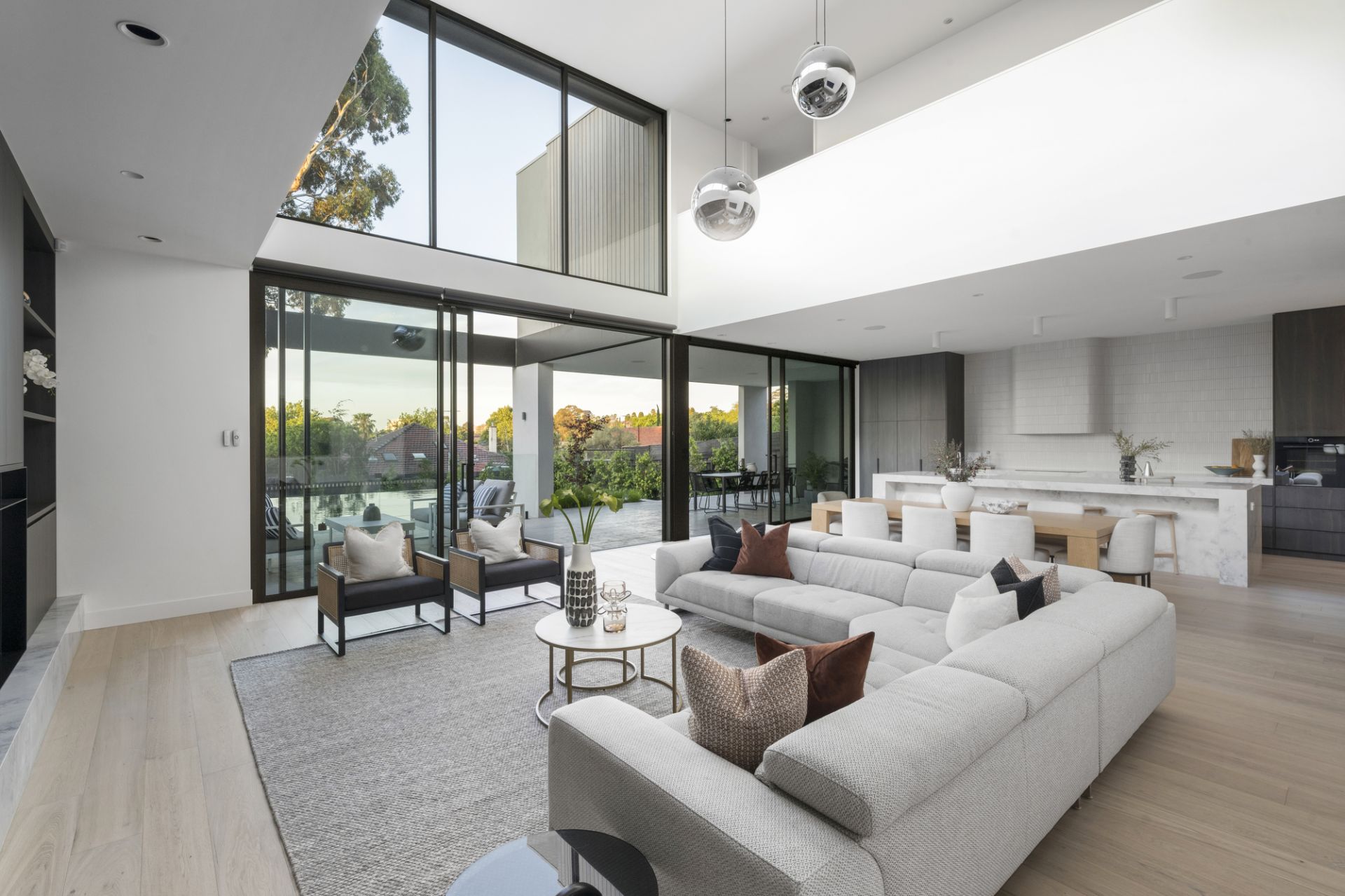 A wide hallway with a soaring dual-level void extends to a large executive study before a storeroom, powder room and a stylish lounge room that adjoins a handy bathroom. Form and functionality under a towering ceiling define a vast family living and dining zone that sweeps to a state-of-the-art integrated V-ZUG kitchen coupled with a butler’s pantry, concealed workstation/bar and huge stacker doors linking to an elevated terrace and massive self-cleaning, horizon-edge pool and spa.