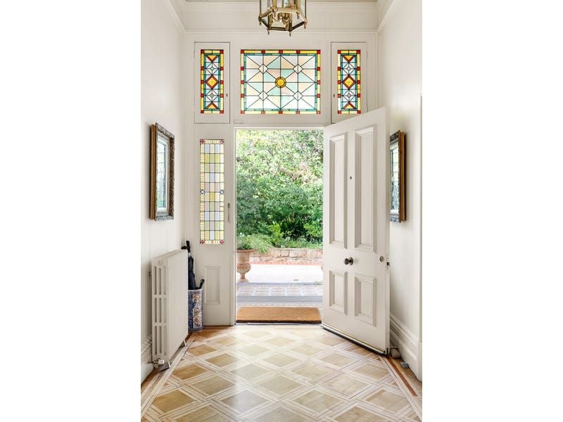 High period ceilings, Kauri pine floorboards and tall windows feature throughout with the extensive interior launched by hand-painted stained-glass entry to an original parquetry-floor hallway leading to an ornate sitting room under a pressed metal ceiling (marble fireplace, bay window) adjoining through bifolding doors to a superb formal dining room warmed by marble gas fireplace and a marvellous tiered fountain outlook.