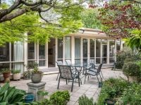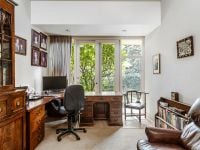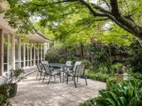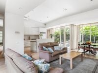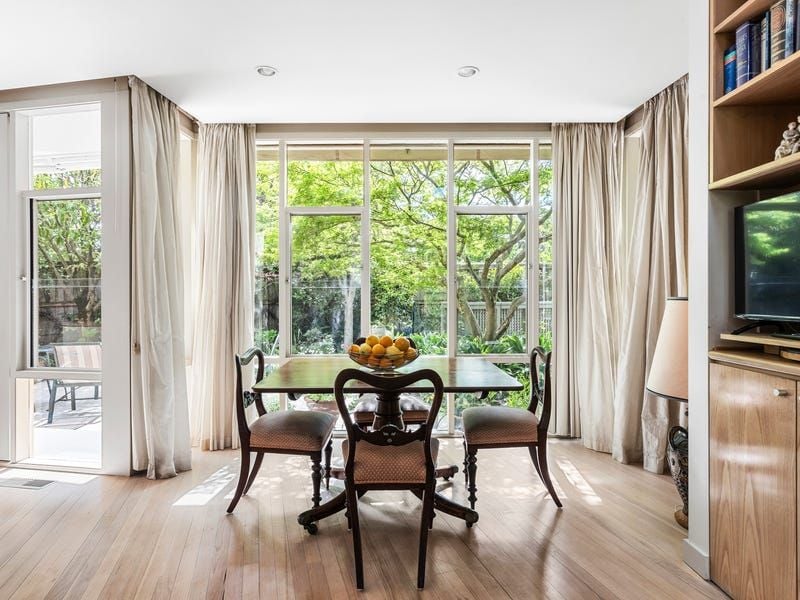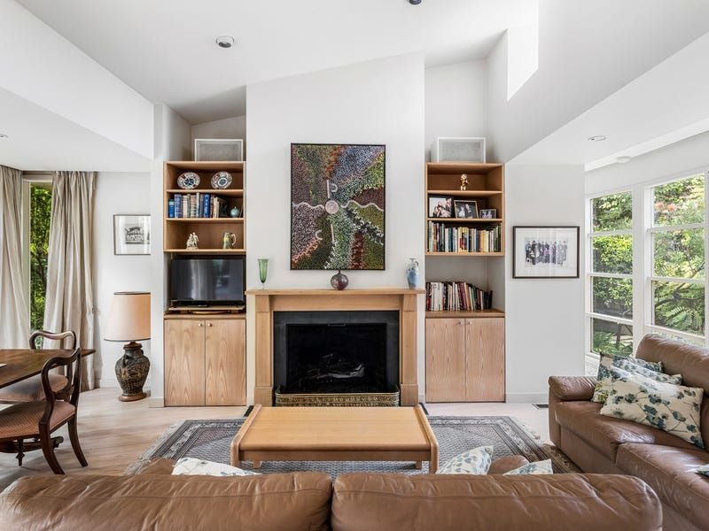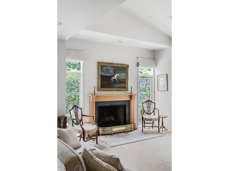 Every room is oriented north and facing the garden in this light-filled home that is launched by a sitting room (gas fireplace) opening to a private front courtyard and a dining room with abundant cupboard space. Further is a cellar, powder room and laundry with a drying cabinet before an immaculate kitchen with European appliances and adjoining family living/dining room warmed by a large open fireplace.