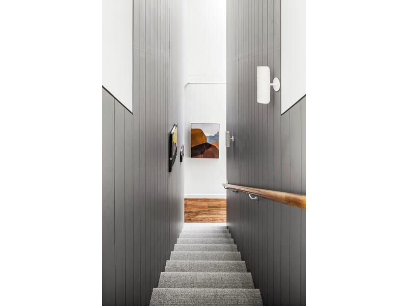 Wide spotted gum floorboards in the arched hallway introduce a high-quality look of class, warmth and cohesion that's perfectly enhanced by bespoke solid timber cabinetry, plantation shutters, gallery hanging rails and a stylish colour palette. The original section of the home includes two ground-floor bedrooms and a lounge room (OFPs) that transition to a sky-lit, two-level void and contemporary family zone launched by a spacious family bathroom and laundry on terrazzo tiles.