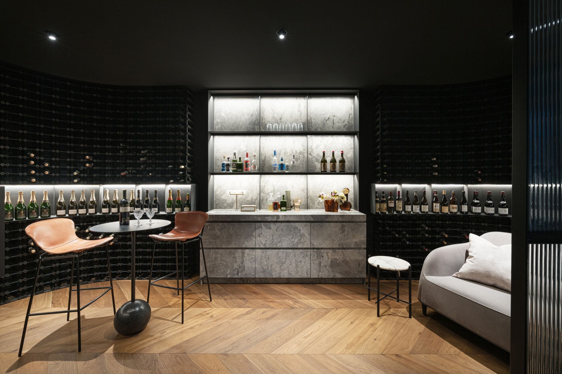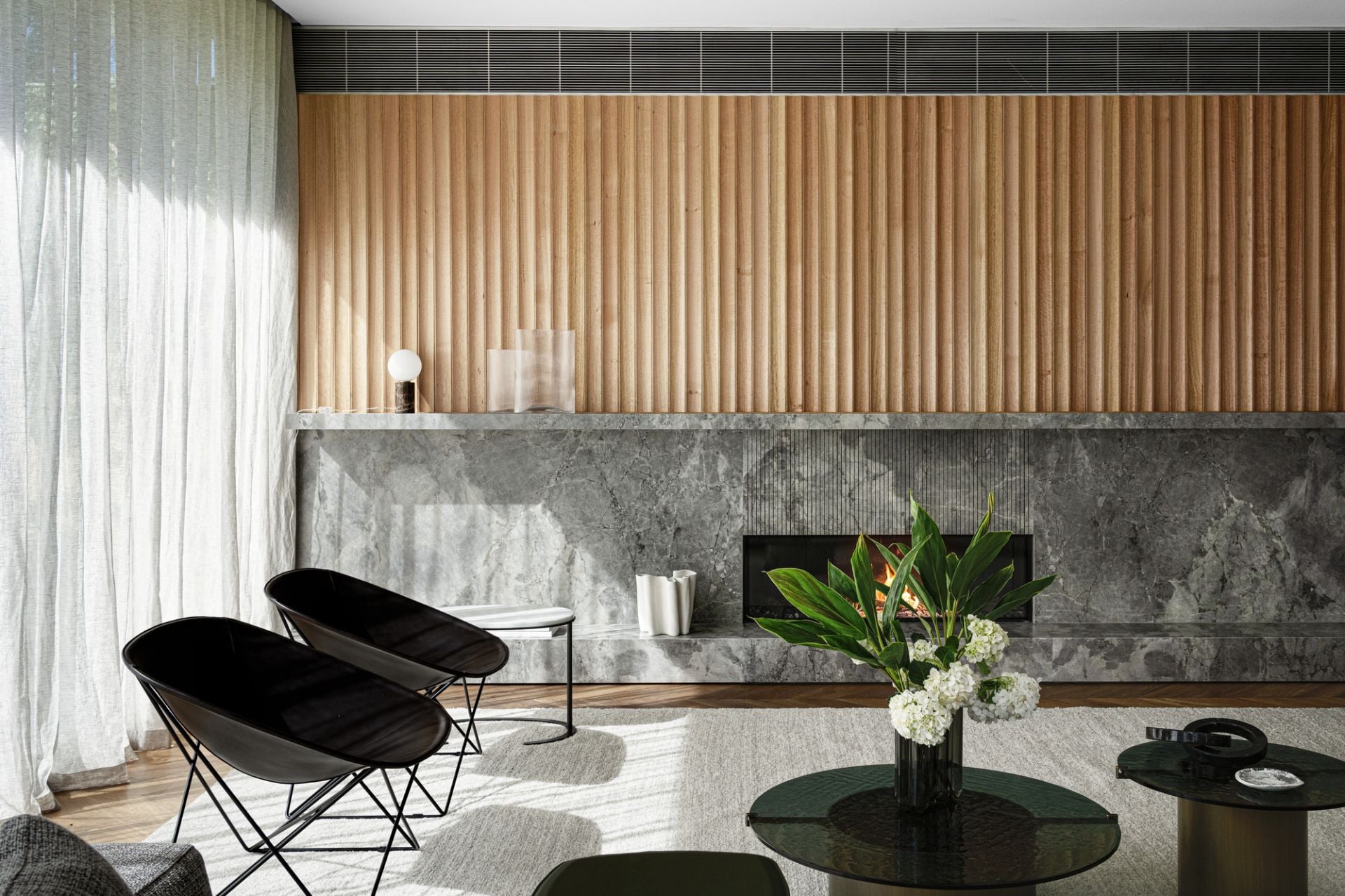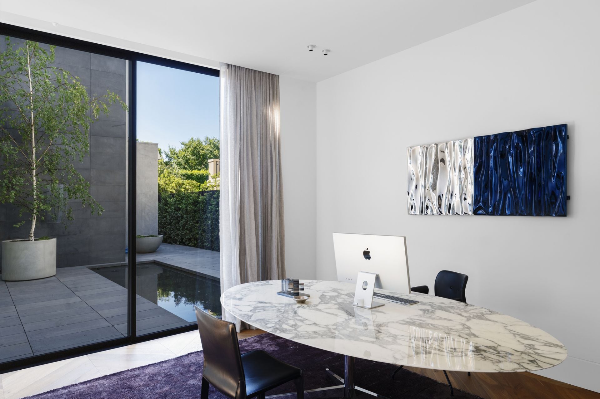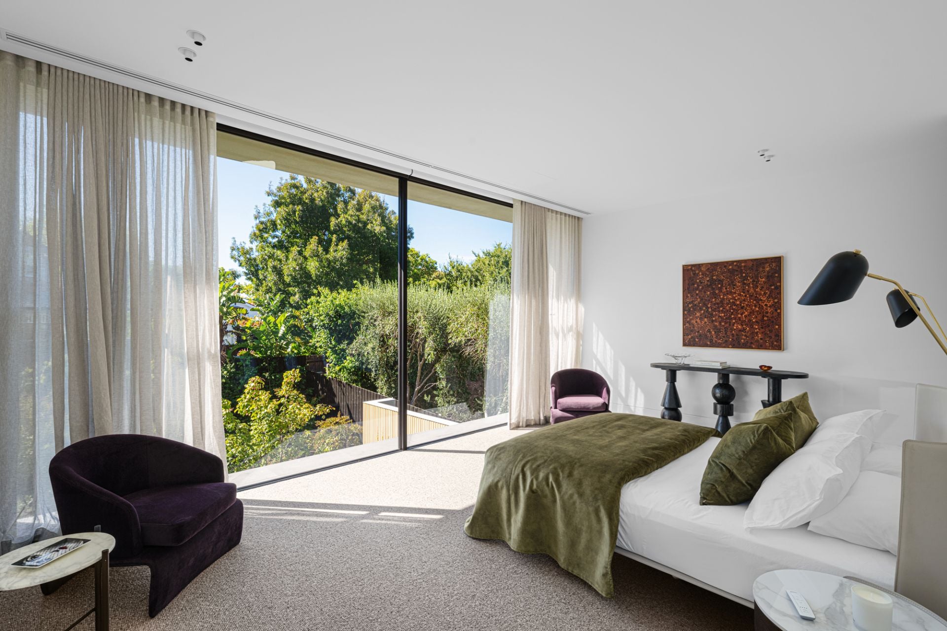 A private lift unites three impeccably designed levels, each calibrated for both function and elegance. At the heart of the home, the front statement kitchen is anchored by a sculptural natural stone island and appointed with a full suite of premium Wolf appliances, including dual induction cooktops and integrated Sub-Zero refrigeration. Concealed behind, is a chef’s kitchen—equally well-appointed with Wolf appliances and Sub-Zero refrigeration—which delivers high-performance functionality for effortless entertaining. This dual-kitchen concept balances showpiece aesthetics with practical efficiency, ensuring seamless culinary preparation while maintaining a refined, social atmosphere. Expanses of north-facing glazing bathe the family living and dining spaces in natural light, forging an effortless connection between interior and exterior.