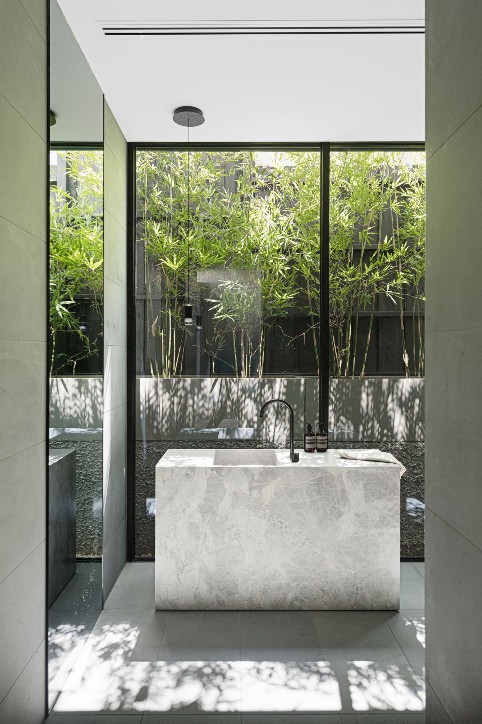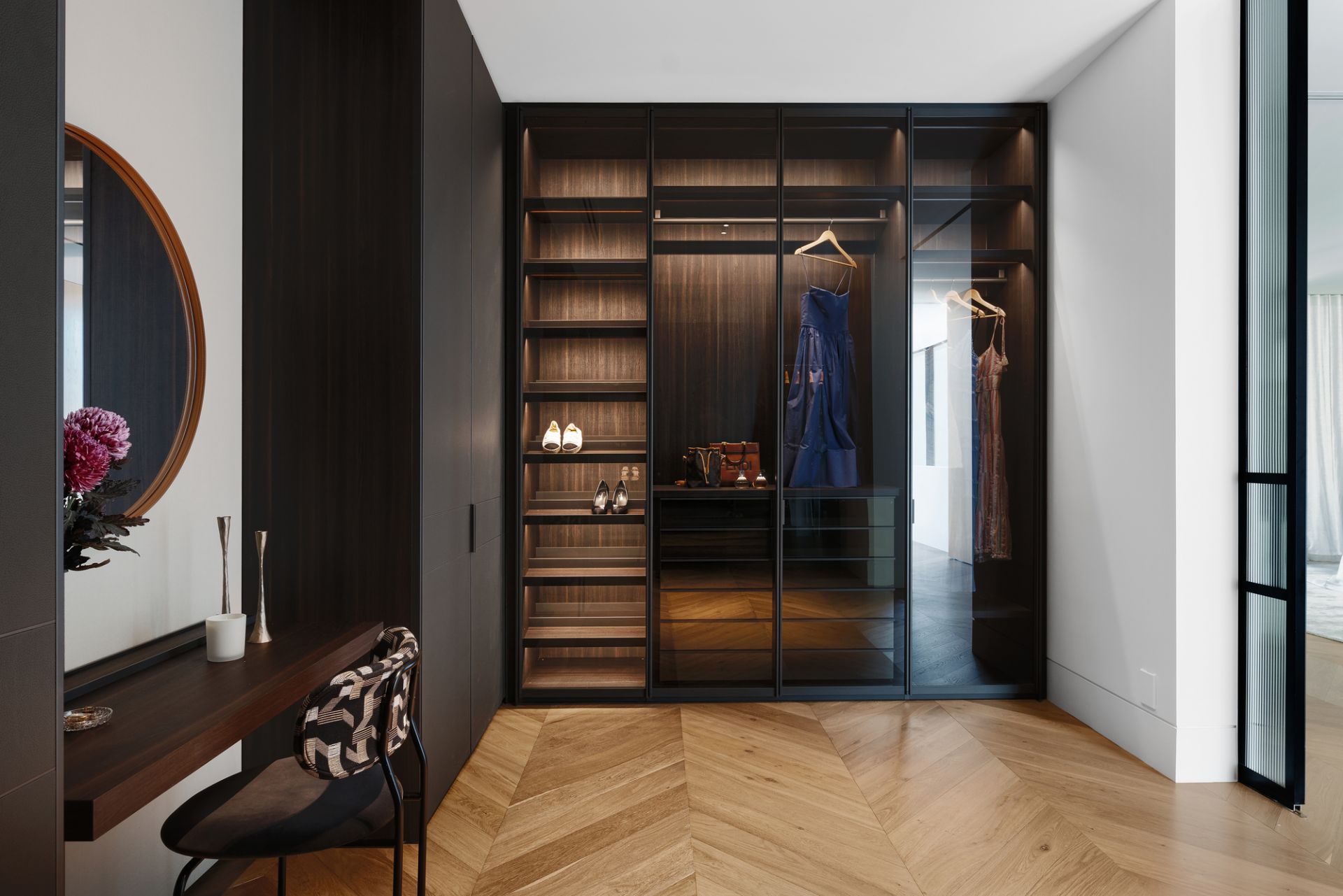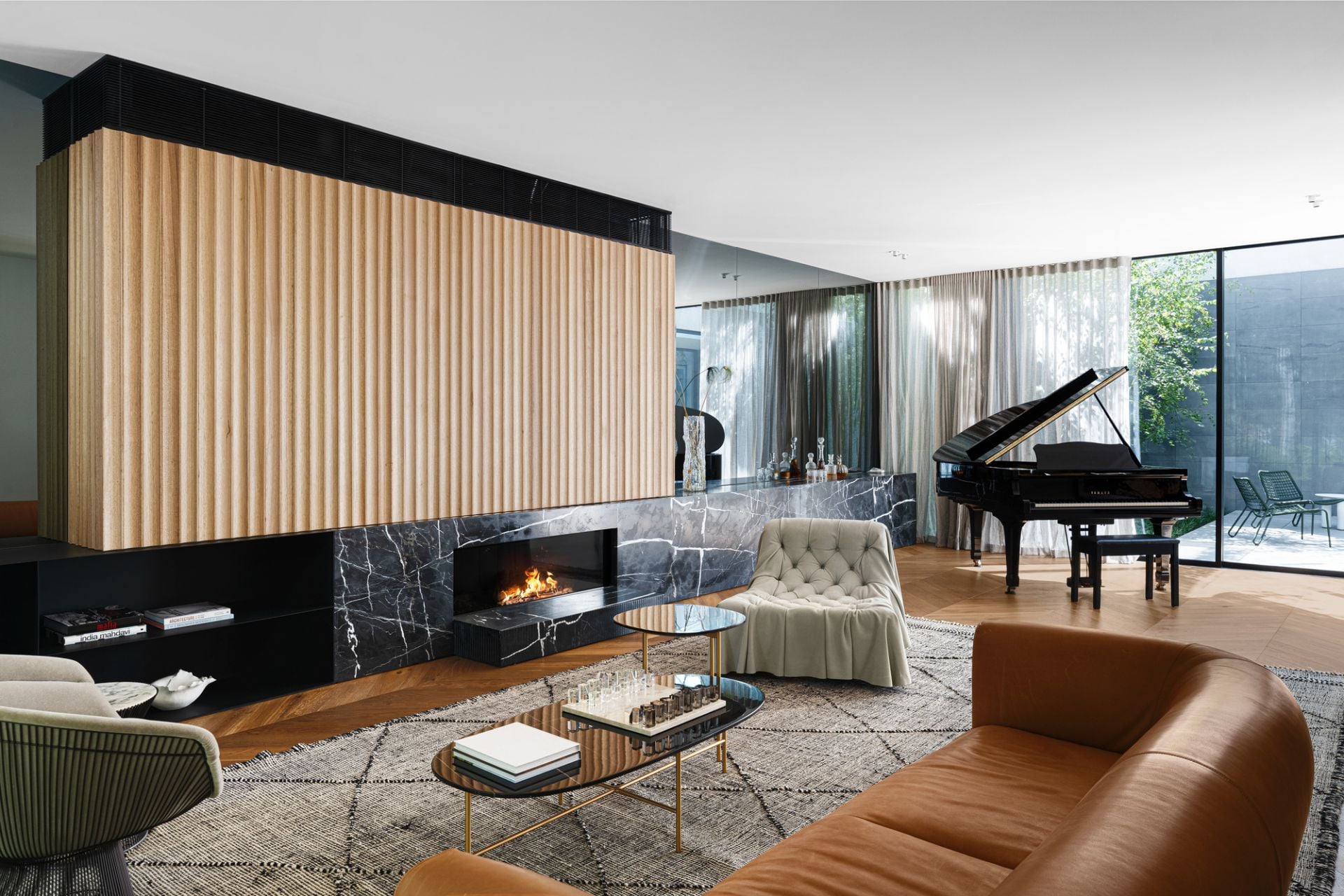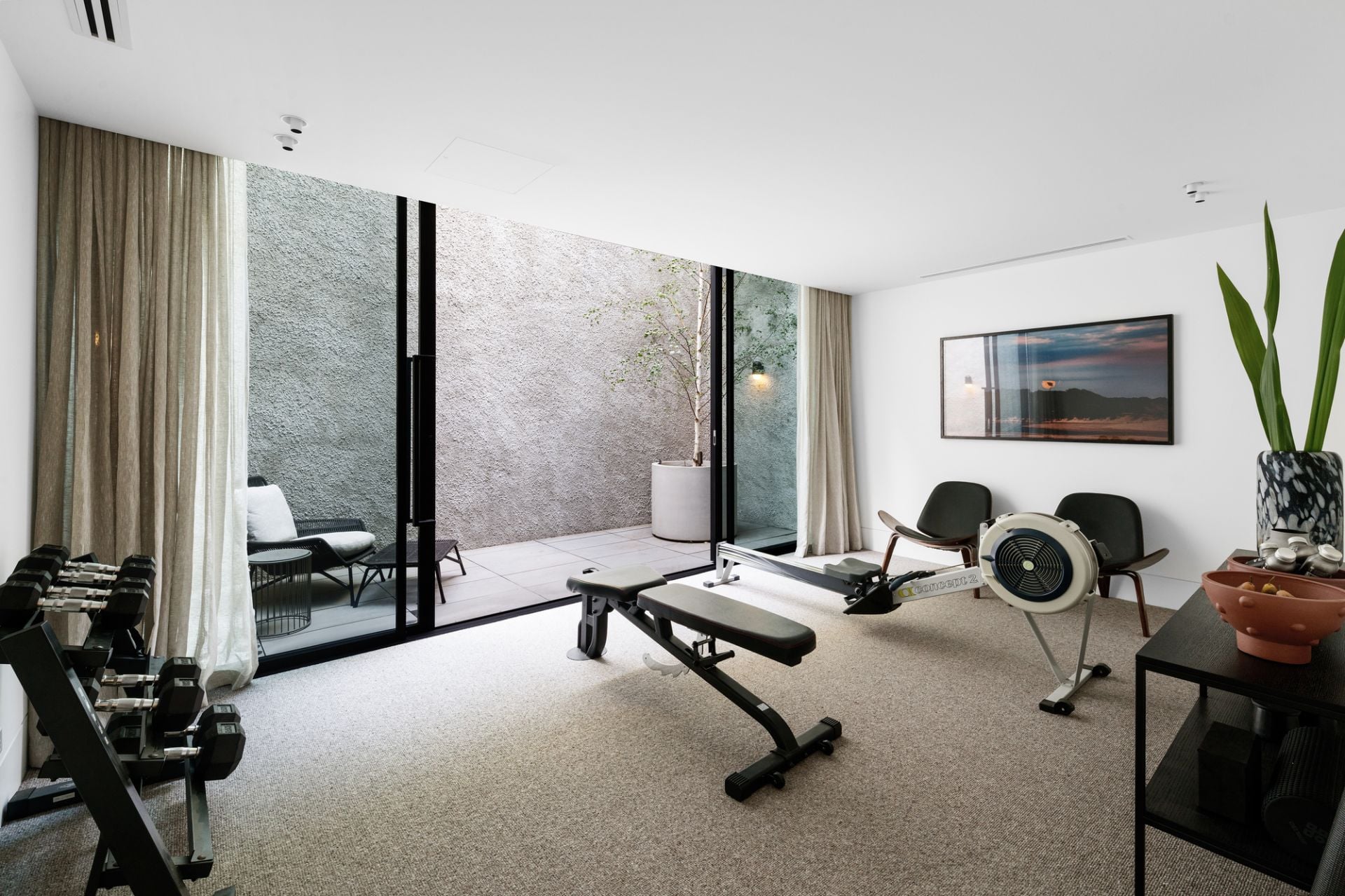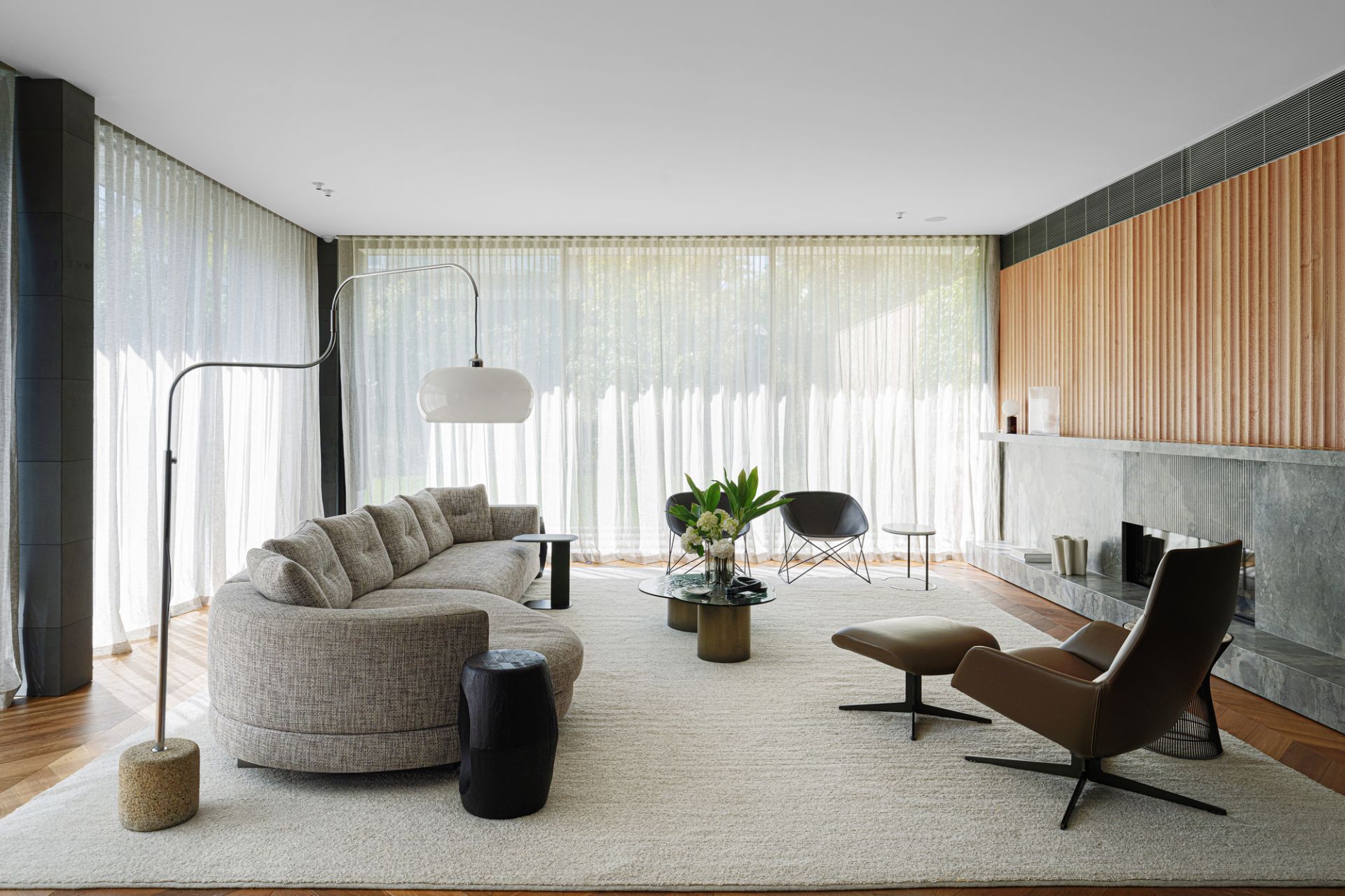 A private lift unites three impeccably designed levels, each calibrated for both function and elegance. At the heart of the home, the front statement kitchen is anchored by a sculptural natural stone island and appointed with a full suite of premium Wolf appliances, including dual induction cooktops and integrated Sub-Zero refrigeration. Concealed behind, is a chef’s kitchen—equally well-appointed with Wolf appliances and Sub-Zero refrigeration—which delivers high-performance functionality for effortless entertaining. This dual-kitchen concept balances showpiece aesthetics with practical efficiency, ensuring seamless culinary preparation while maintaining a refined, social atmosphere. Expanses of north-facing glazing bathe the family living and dining spaces in natural light, forging an effortless connection between interior and exterior.