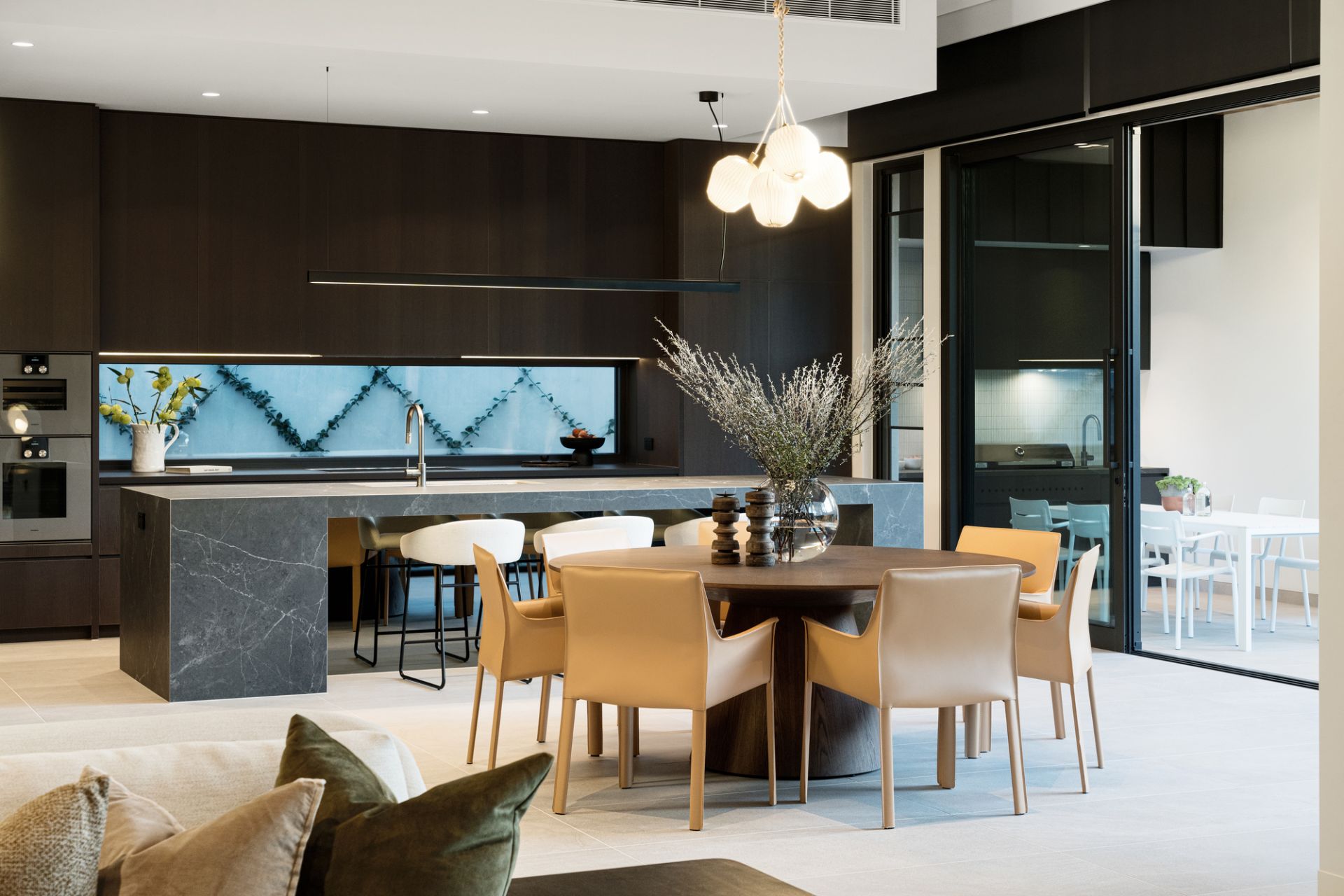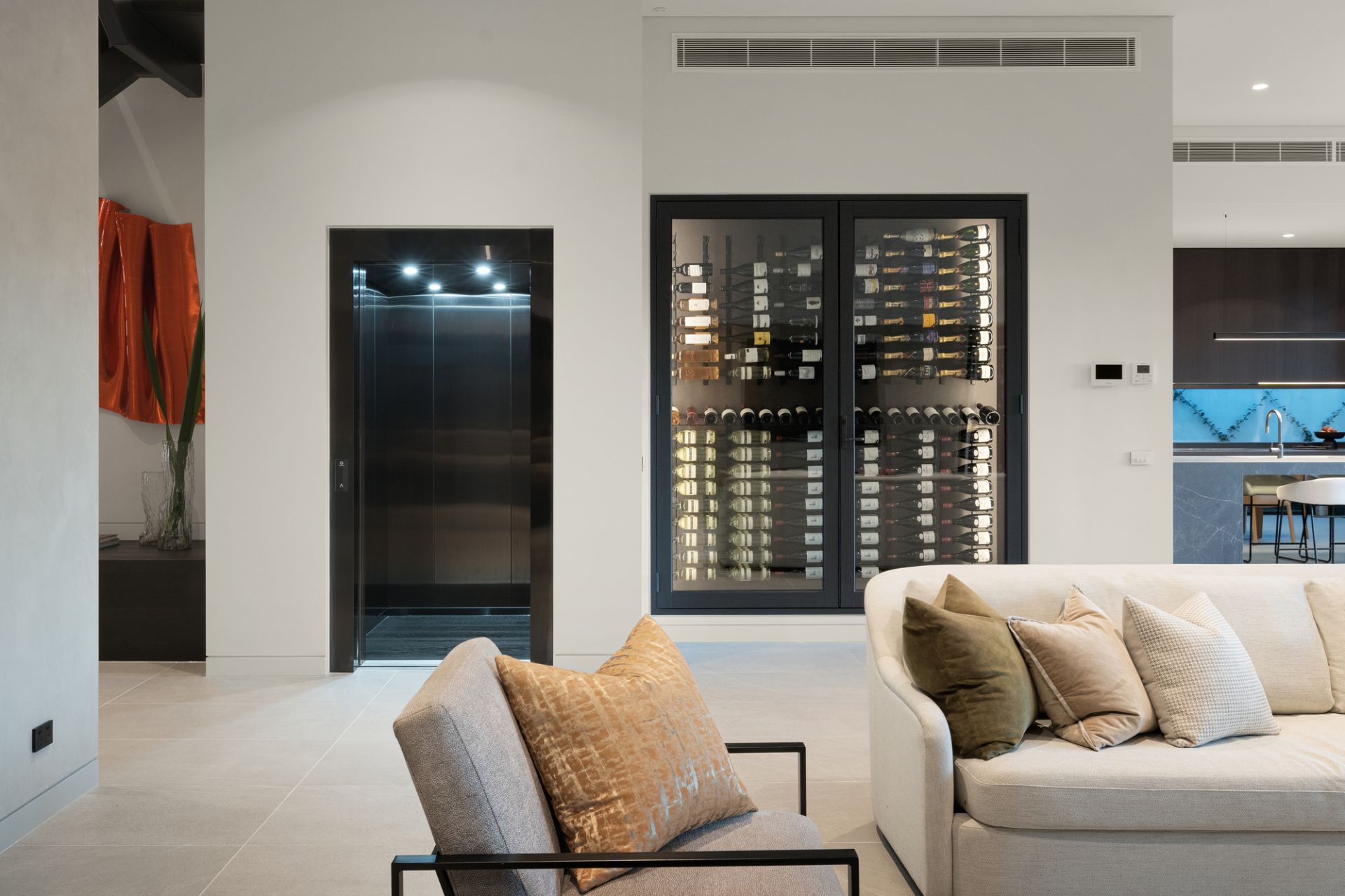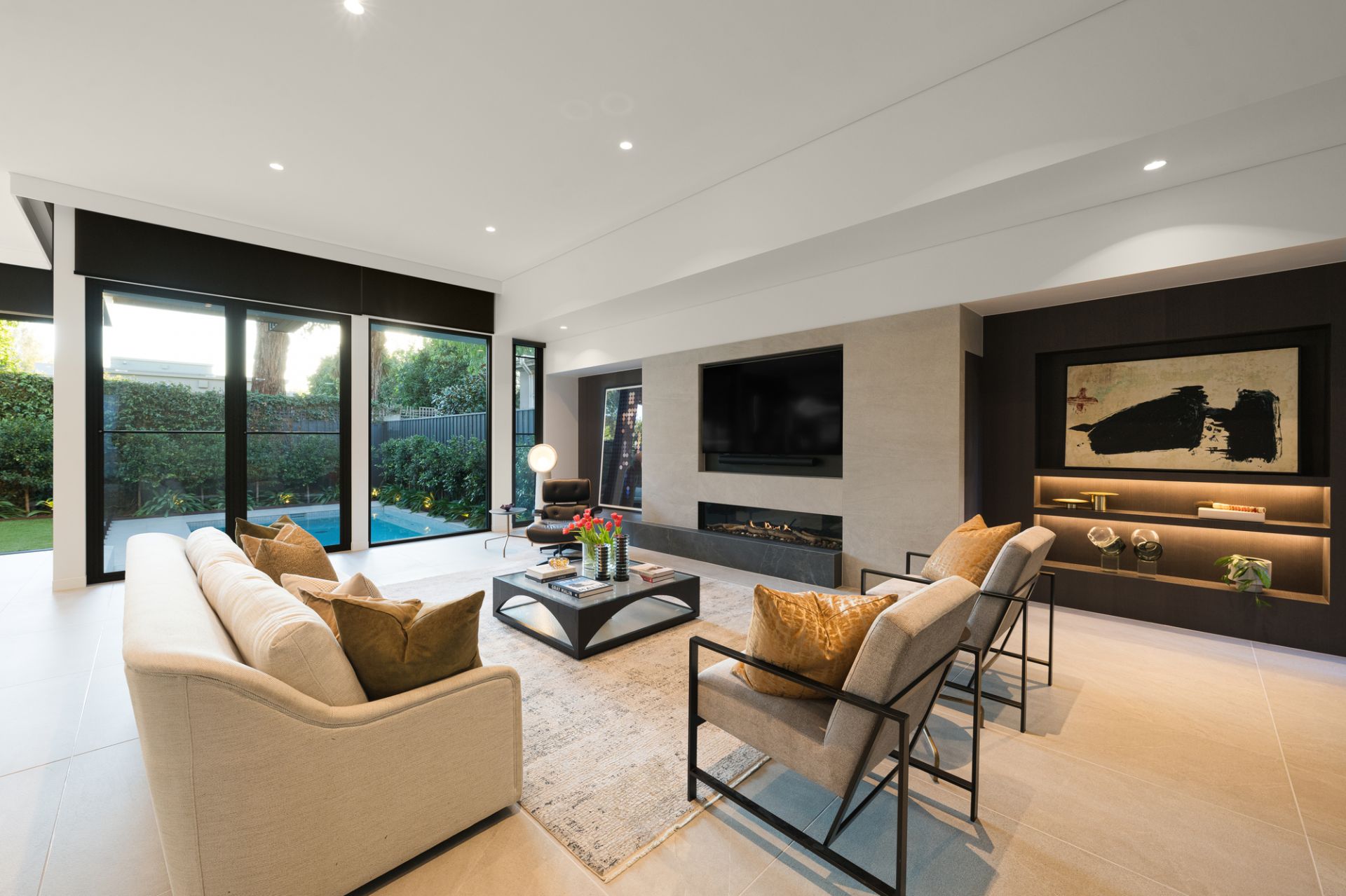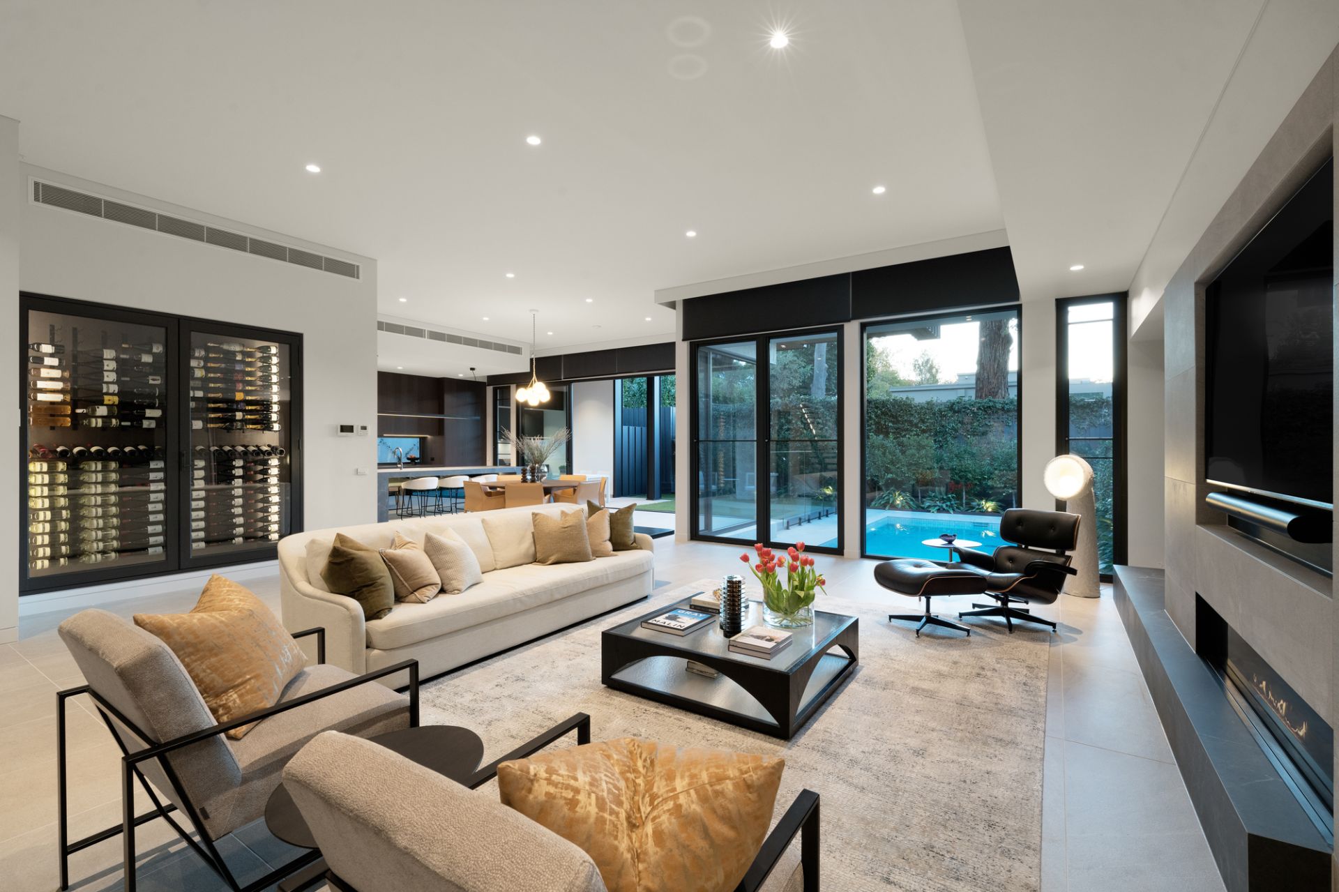 Large-scale Italian porcelain Signorino tiles with in-floor heating follow the ground-level floorplan to a climate-controlled cellar (French-made WineMaster refrigerator), cocktail bar (Vintec fridges) and sublime family living and dining areas (Real Flame gas FP, huge hideaway cavity sliding doors) adjoining a premium chef’s kitchen boasting an exceptional range of top-line integrated Gaggenau appliances, porcelain waterfall breakfast island and a fully-fitted butler’s pantry.