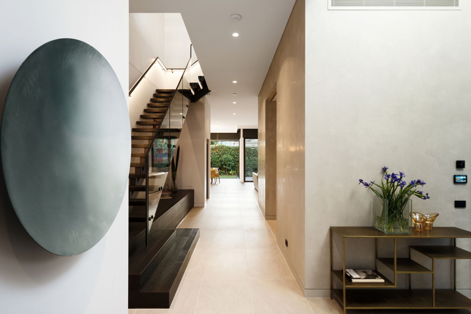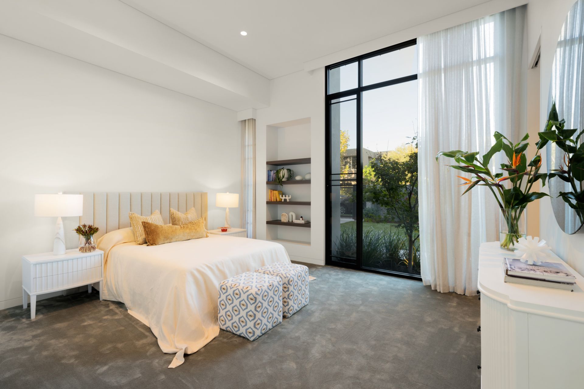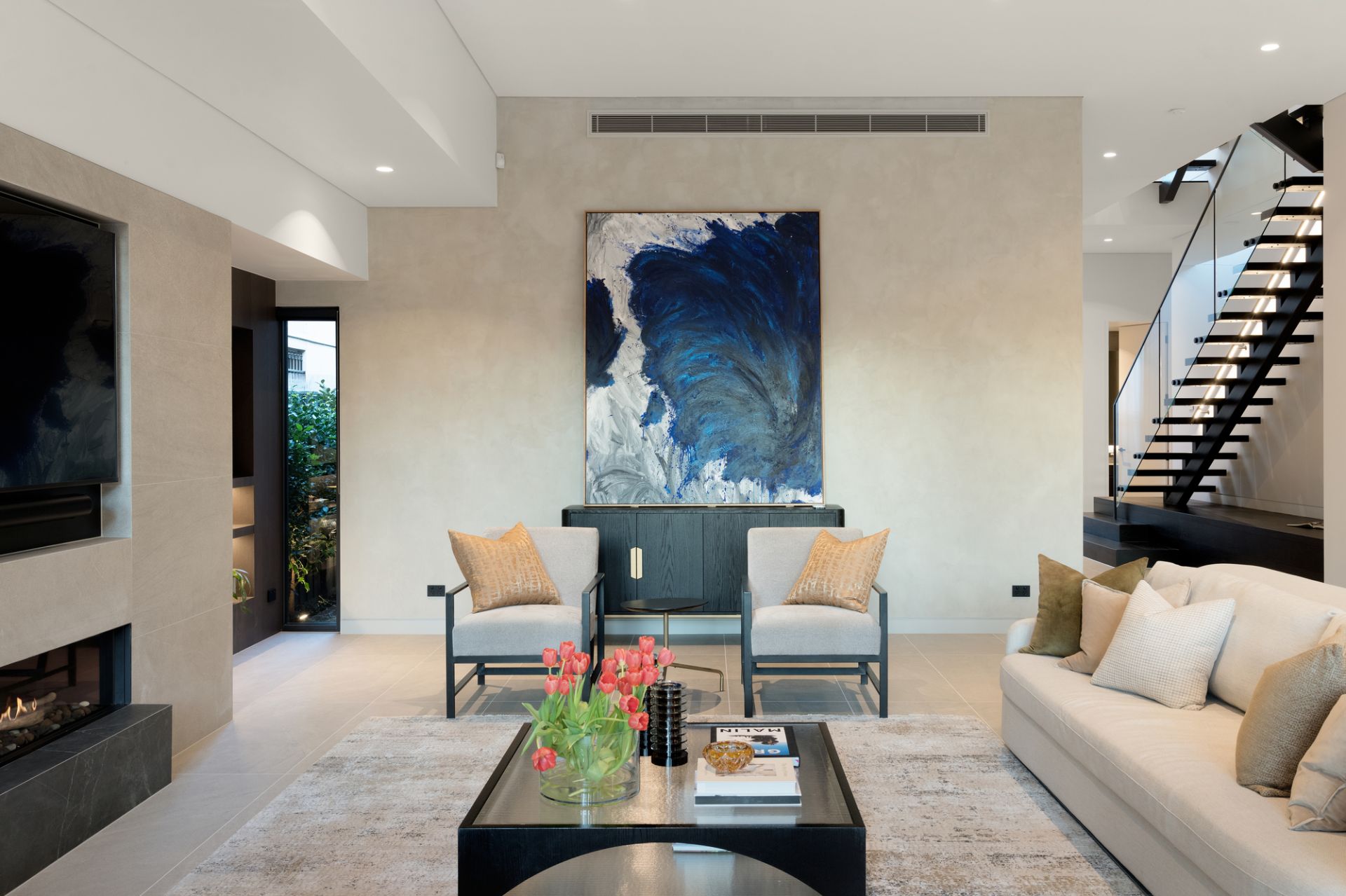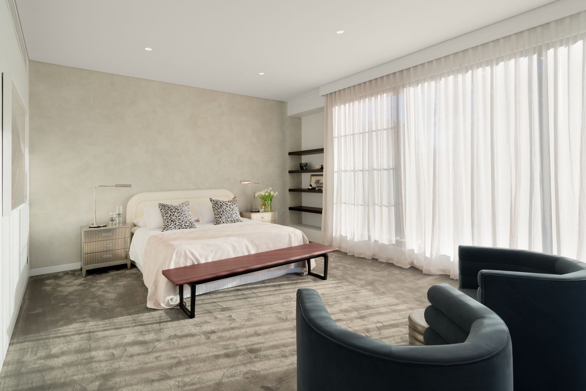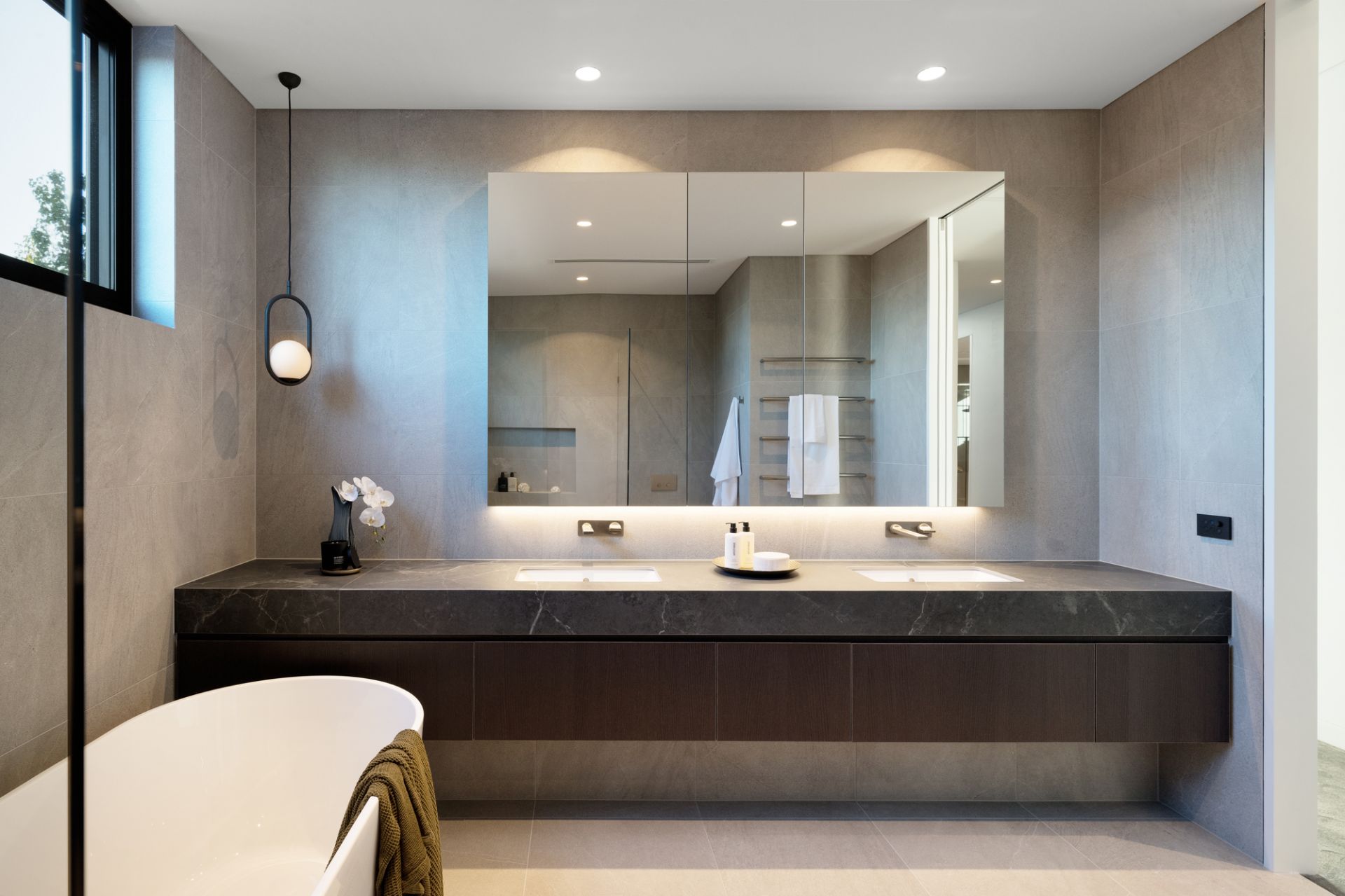 Large-scale Italian porcelain Signorino tiles with in-floor heating follow the ground-level floorplan to a climate-controlled cellar (French-made WineMaster refrigerator), cocktail bar (Vintec fridges) and sublime family living and dining areas (Real Flame gas FP, huge hideaway cavity sliding doors) adjoining a premium chef’s kitchen boasting an exceptional range of top-line integrated Gaggenau appliances, porcelain waterfall breakfast island and a fully-fitted butler’s pantry.