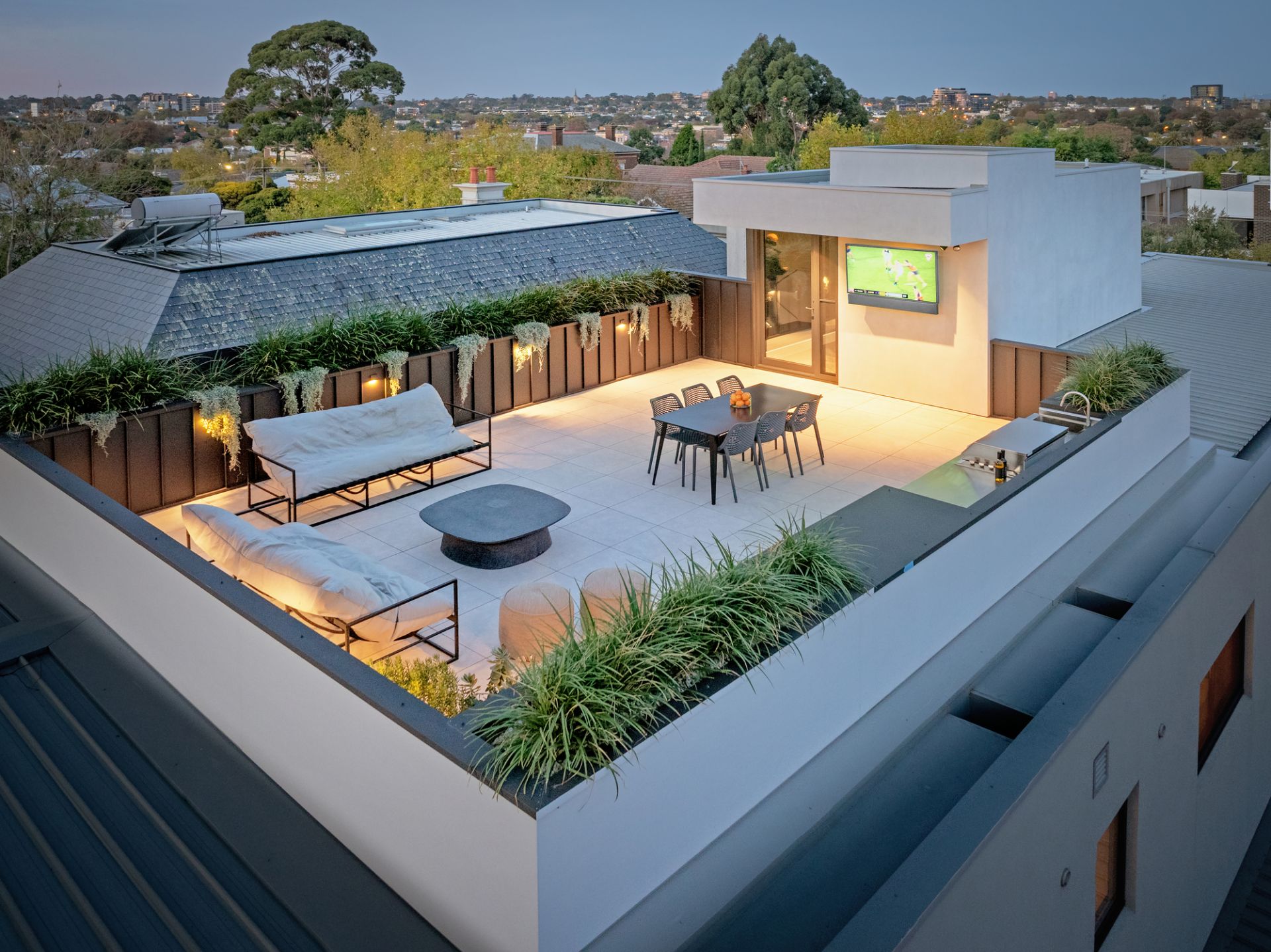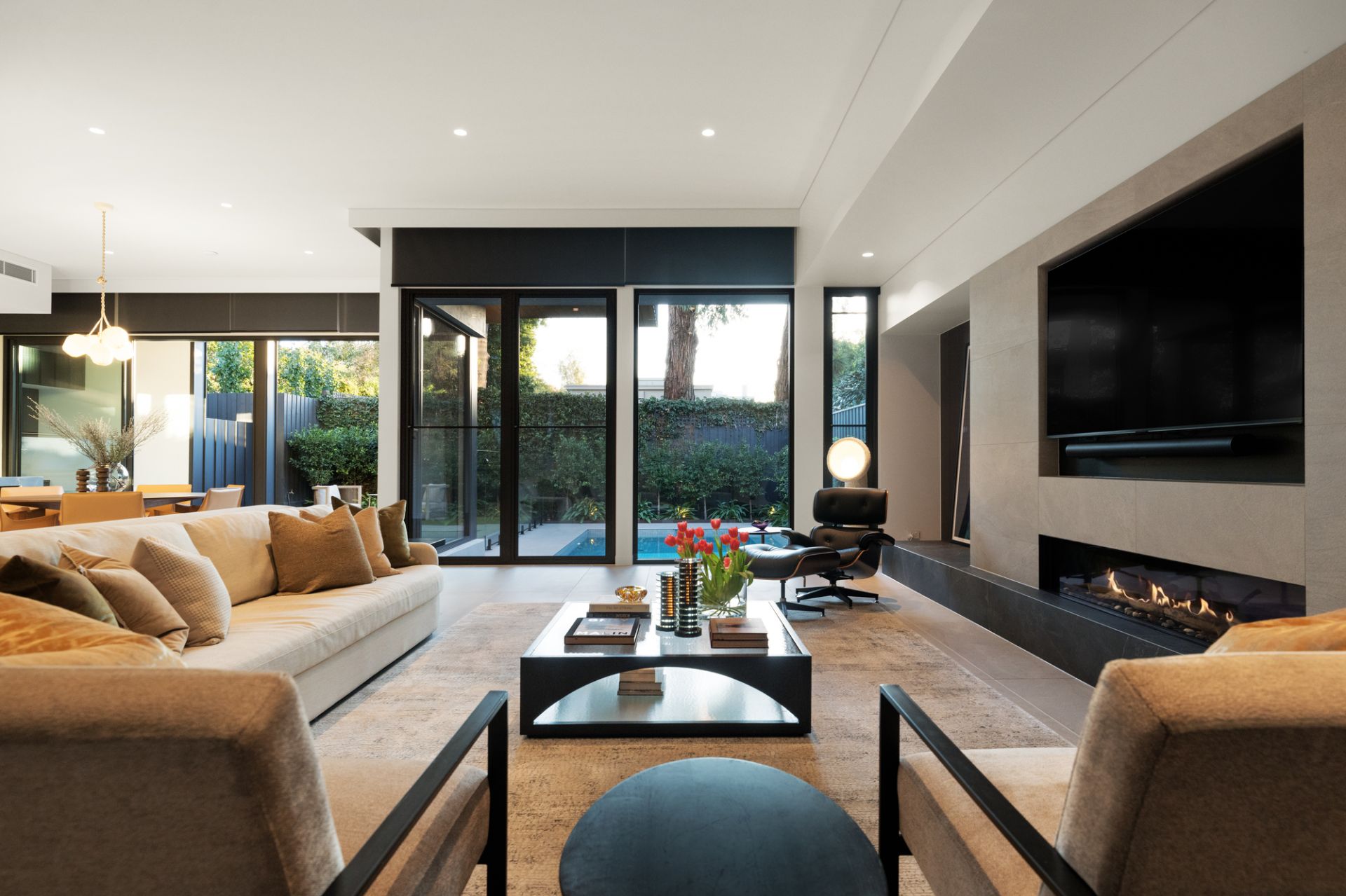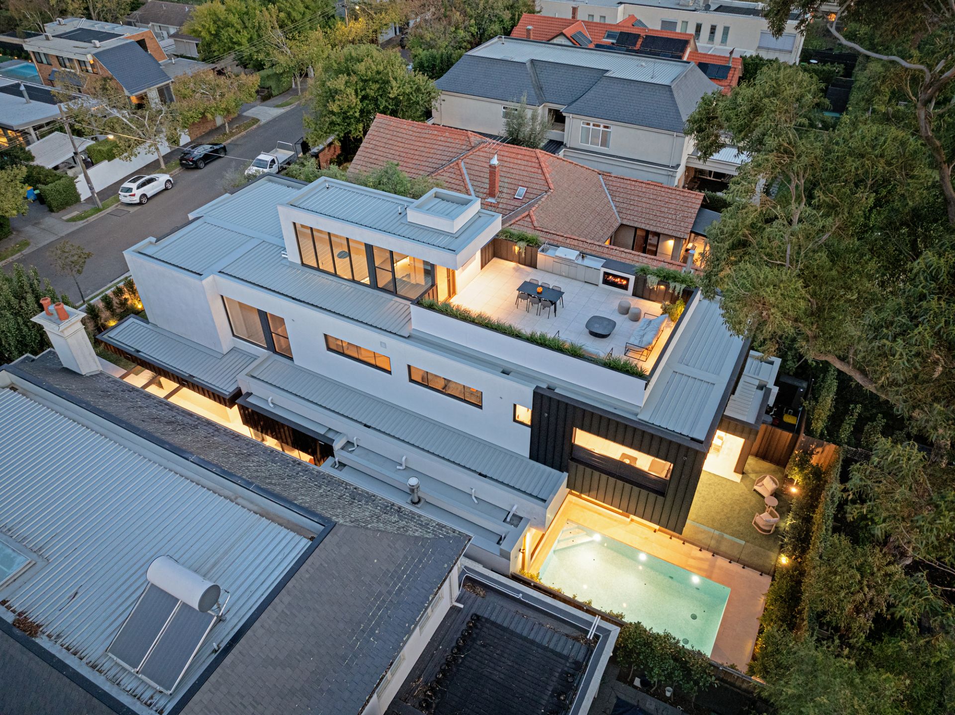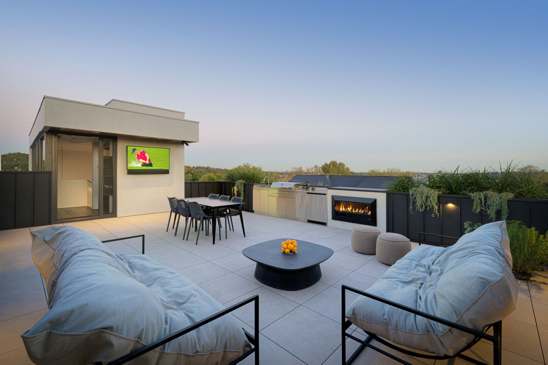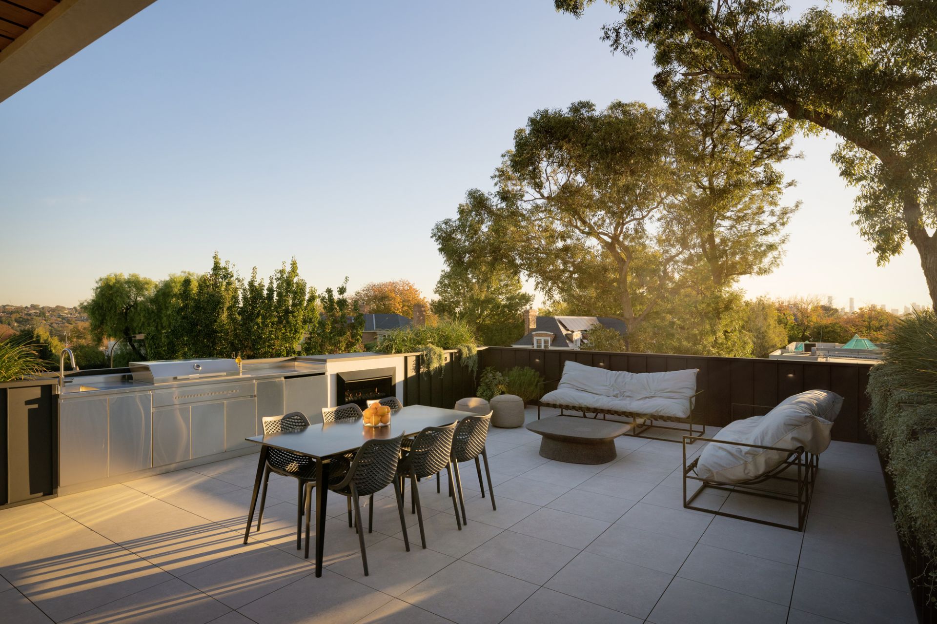 Just outside is a secluded and sun-filled alfresco sanctuary where a centrepiece freshwater pool with INSRG automation (self-cleaning, electric heat pump), external shower, change/bathroom and undercover entertainment terrace (Artusi BBQ and drinks fridge) in a leafy landscaped setting is complemented by a massive roof terrace (Artusi BBQ/drinks fridge, Real Flame gas FP, external TV) where panoramic views extend from the city skyline to the Dandenong Ranges.