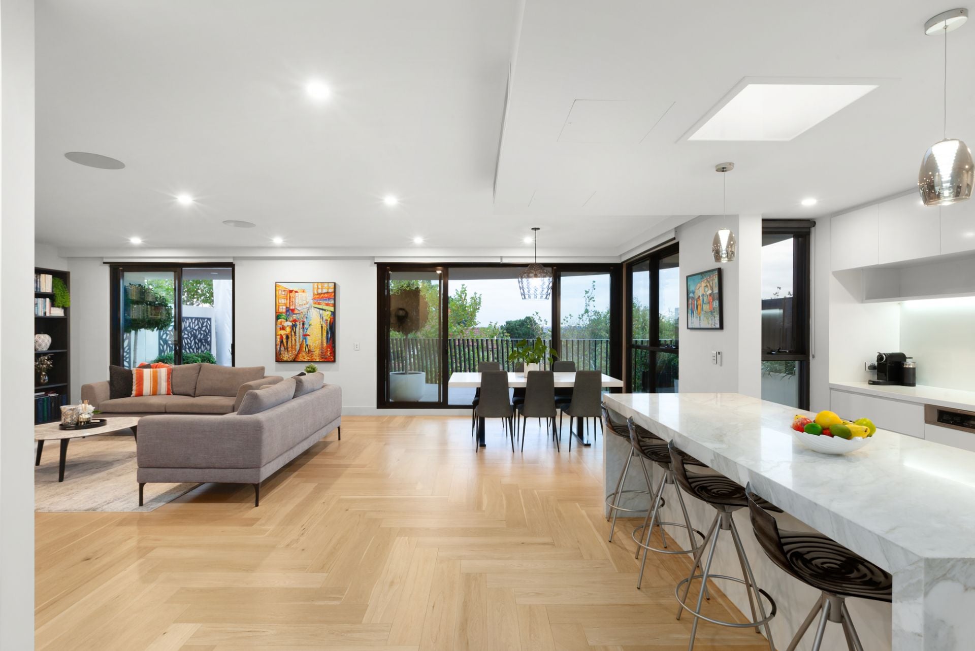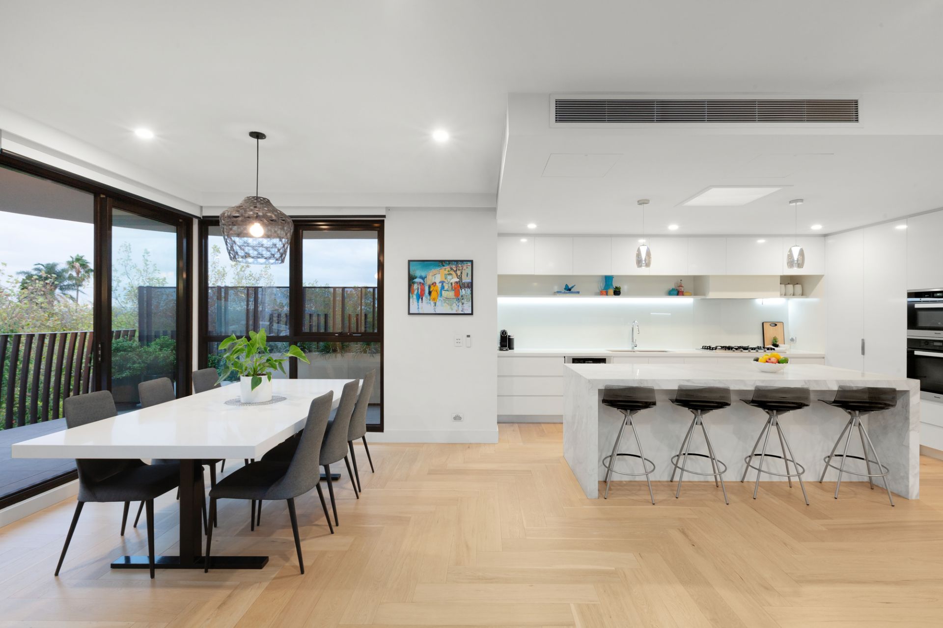 Wide French oak parquetry and ducted heating/cooling underscore an unwavering commitment to comfort and quality with the culinary centrepiece a showpiece kitchen featuring a Calacatta marble waterfall island and Miele appliances including integrated fridge and freezer. Further is a cleverly conceived fitted study nook, while excellent accommodation is complemented by a powder room, superb bathroom and a full laundry with a Miele washer and dryer.