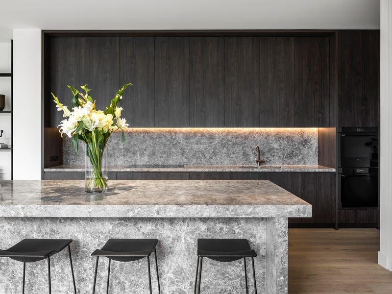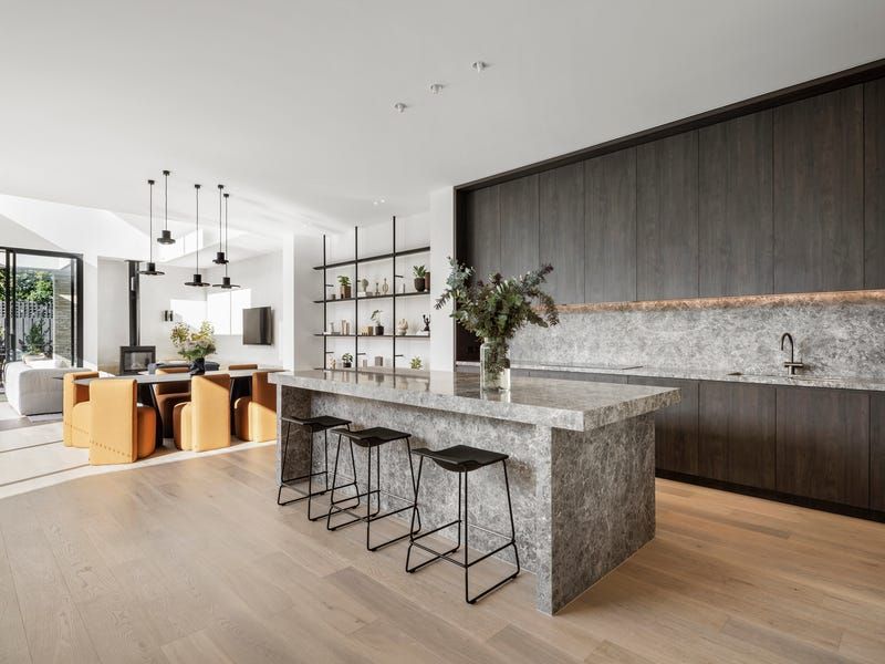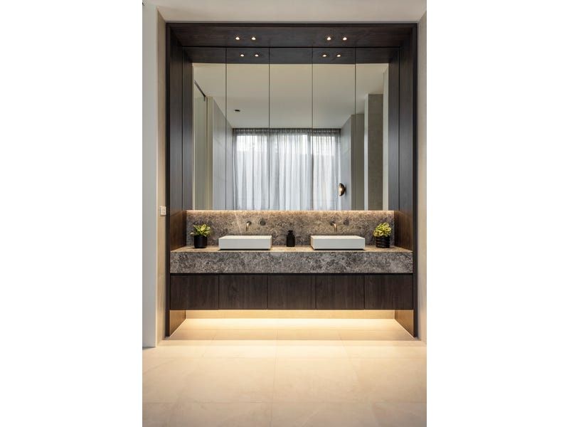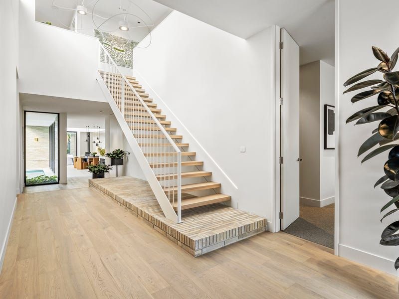 Accentuated by a fusion of architectural elements from handmade brickwork, solid marble and warm oak flooring framed by argon-filled glazing and soaring ceilings, a wide entrance hallway linking to a large family zone passes a downstairs main bedroom (walk-in robes, luxurious freestanding bath ensuite) and utilities area (powder room, laundry, mudroom) before a stylish lounge room with its fabulous bar station and landscaped garden outlook.