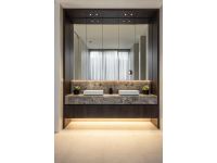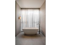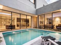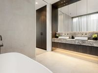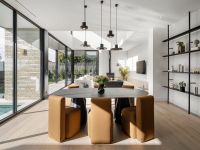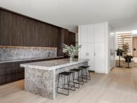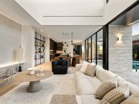 Central is a breathtaking kitchen swathed in marble that will endlessly impress with its massive breakfast island, butler's pantry and suite of integrated V-ZUG appliances featuring double ovens, induction cooktop and dishwasher. Following a full-height, north-side aspect of the tiled swimming pool is a dining area under a cluster of designer lighting that extends to a relaxing living room under a towering ceiling void where stacker doors open to a sun-drenched garden and alfresco terrace.