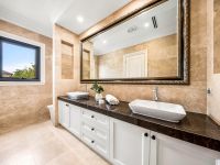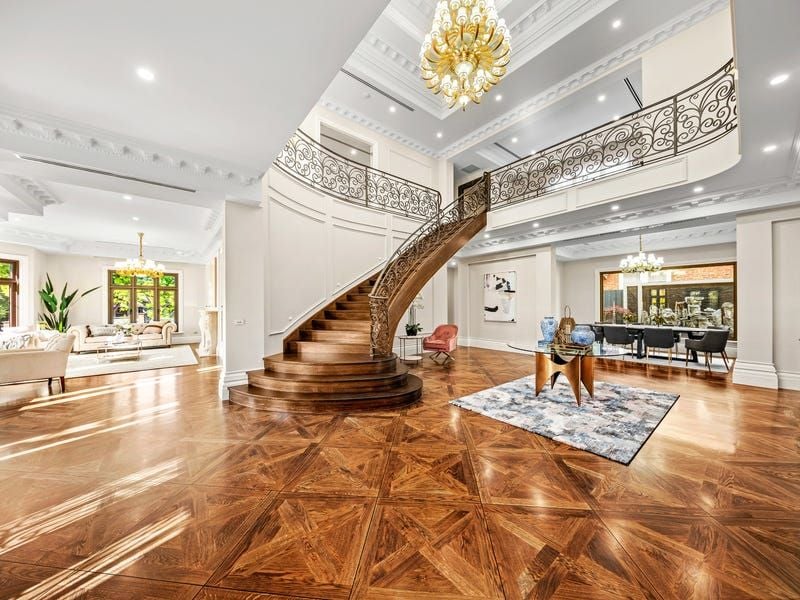 A stately reception hall evokes the grandeur of yesteryear with its sweeping staircase and towering two-level ceiling as the interior unfolds to reveal an extensive 15-room layout with five deluxe ensuite bedrooms, studies and a total of 7.5 bathrooms. Lavished in Calacatta marble, polished oak parquetry, Villeroy & Boch ceramics and double-glazing, this supreme family home with a massive 8-car basement garage is set in low-upkeep landscaped surrounds on a 950 sq. metre allotment (approx.).