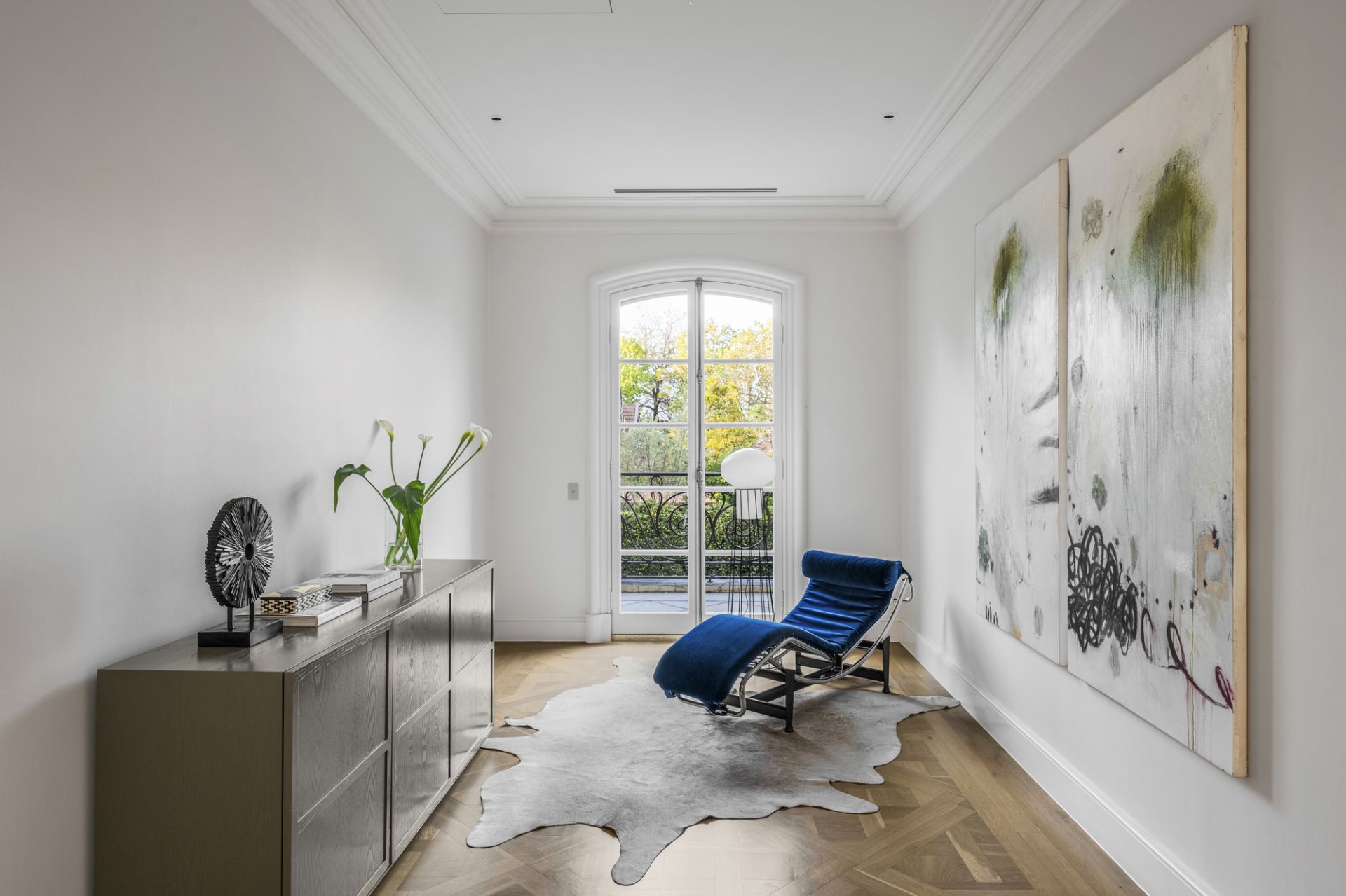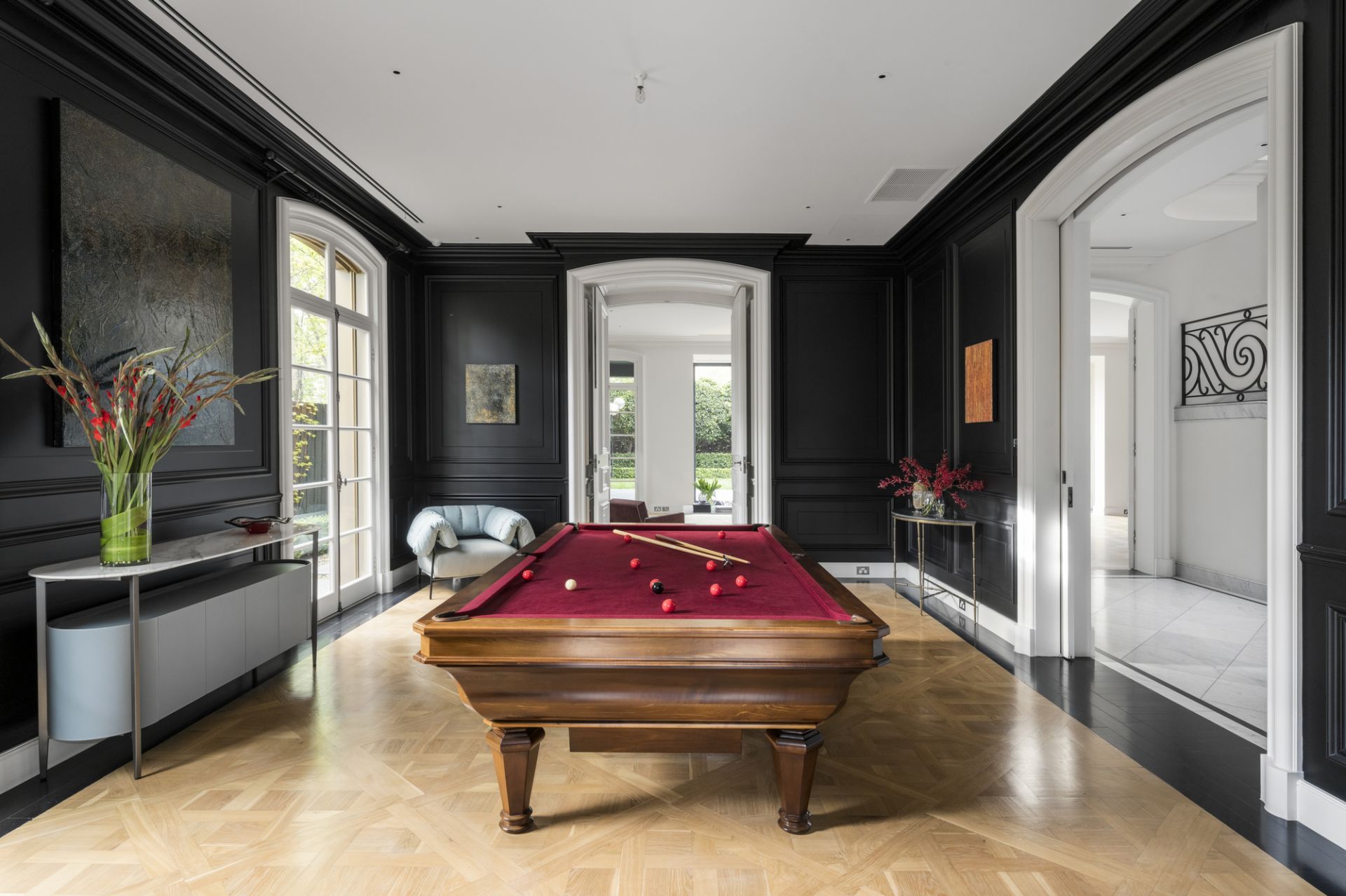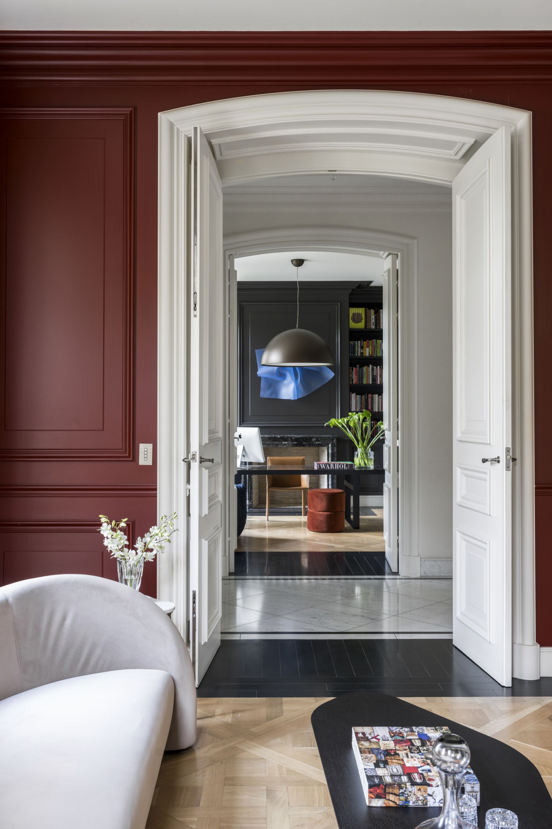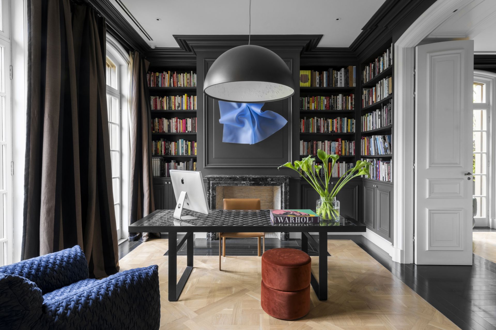 A central hallway adorned with marble flooring while illuminated by Tobia Scarpa Flos wall lights extends into a formal sitting room where the warmth of a hand-carved marble mantelpiece frames a large fireplace while the richness of European oak Versailles-style parquetry and tall casement windows add depth to a dramatic setting. Adjacent is an executive study graced with a black marble fireplace and a stunning Flos Sky Garden light fitting.