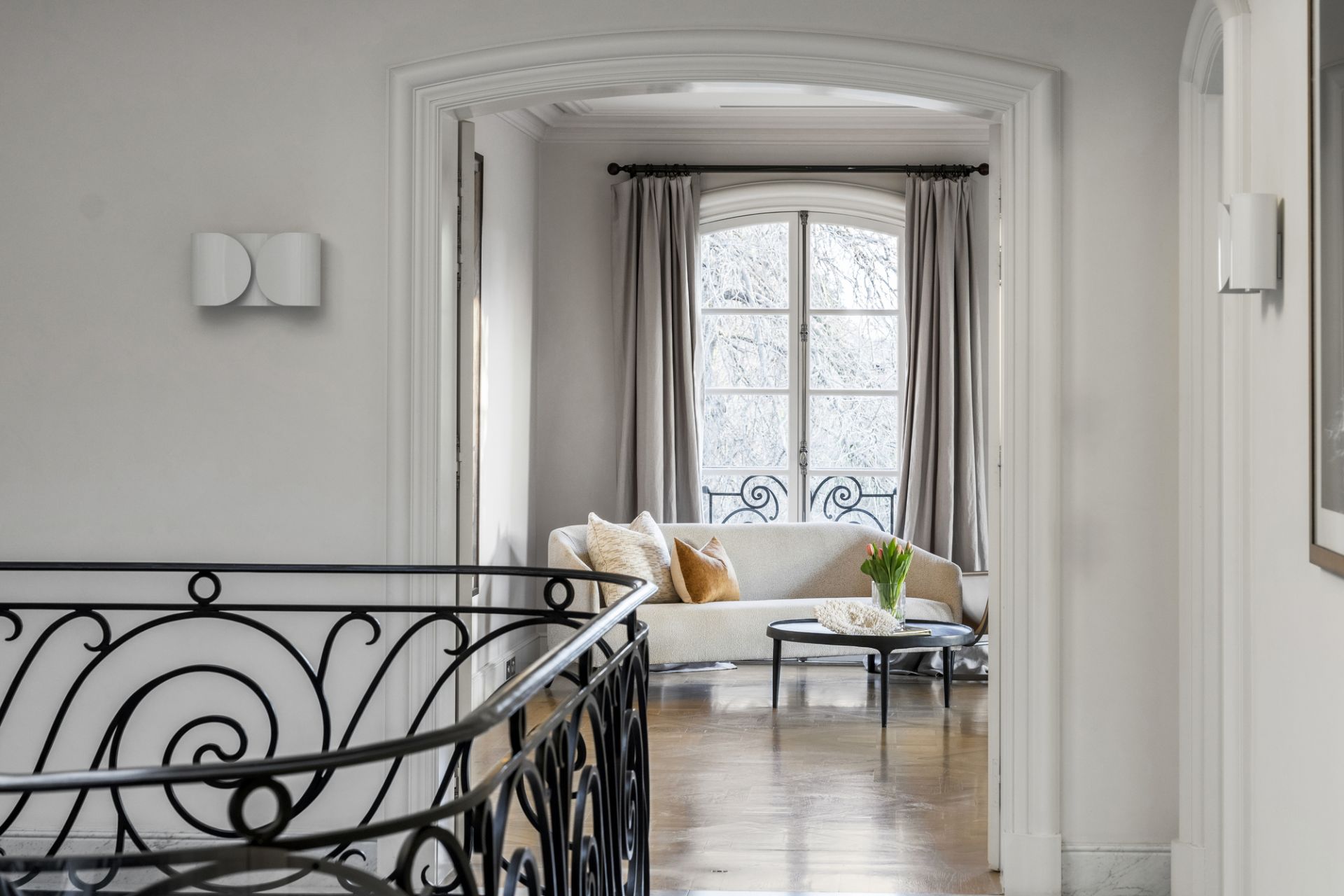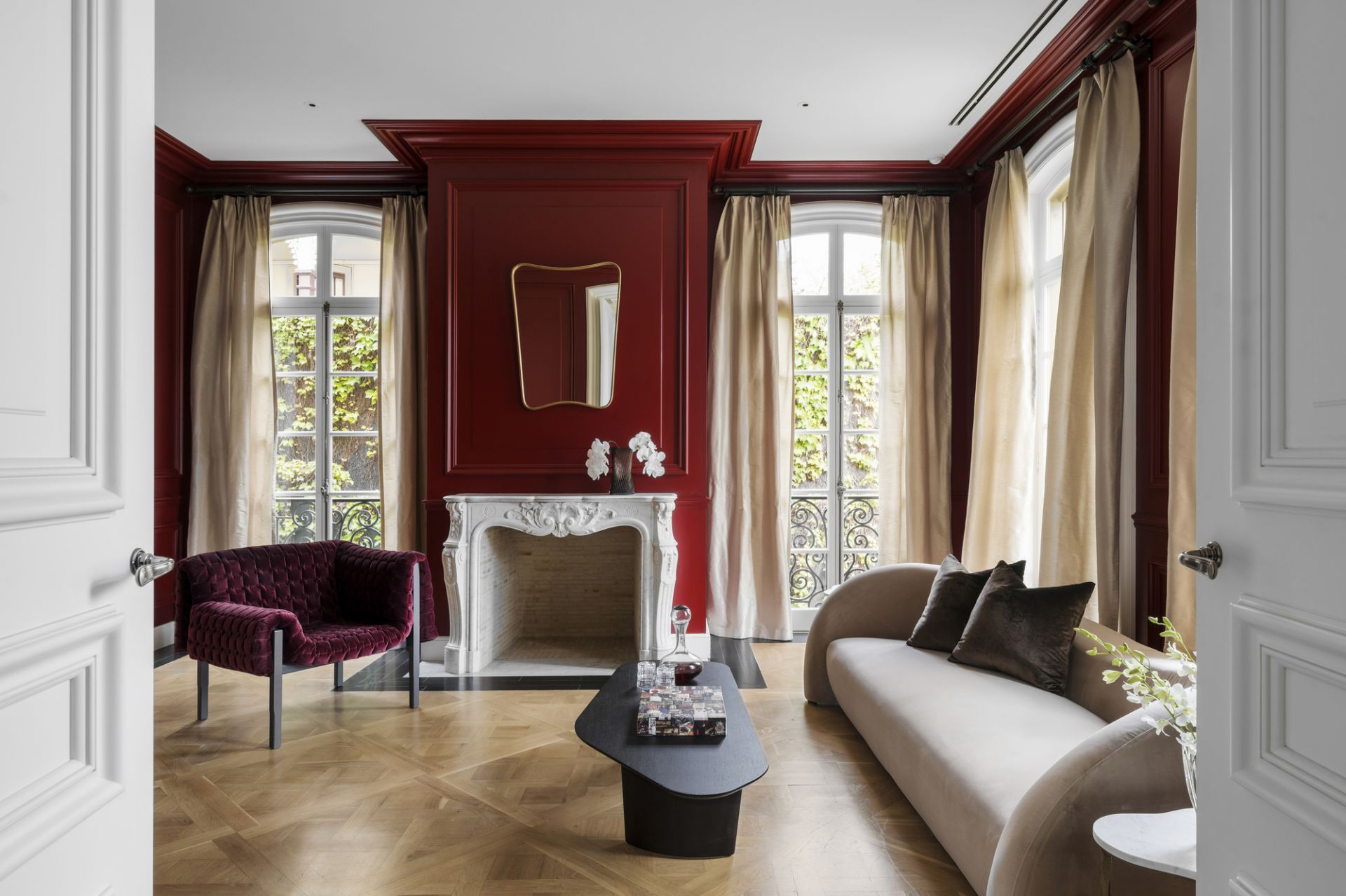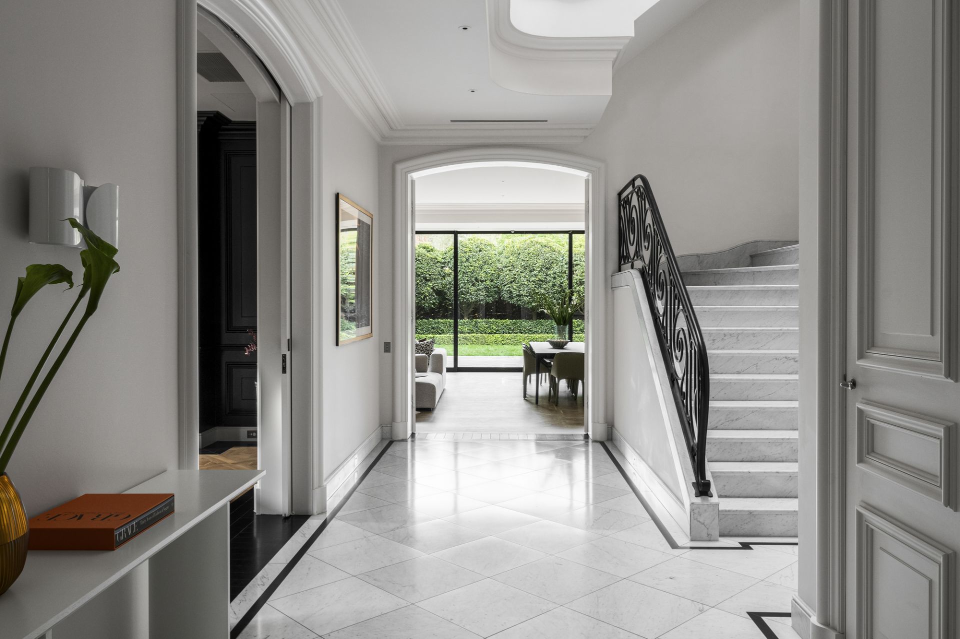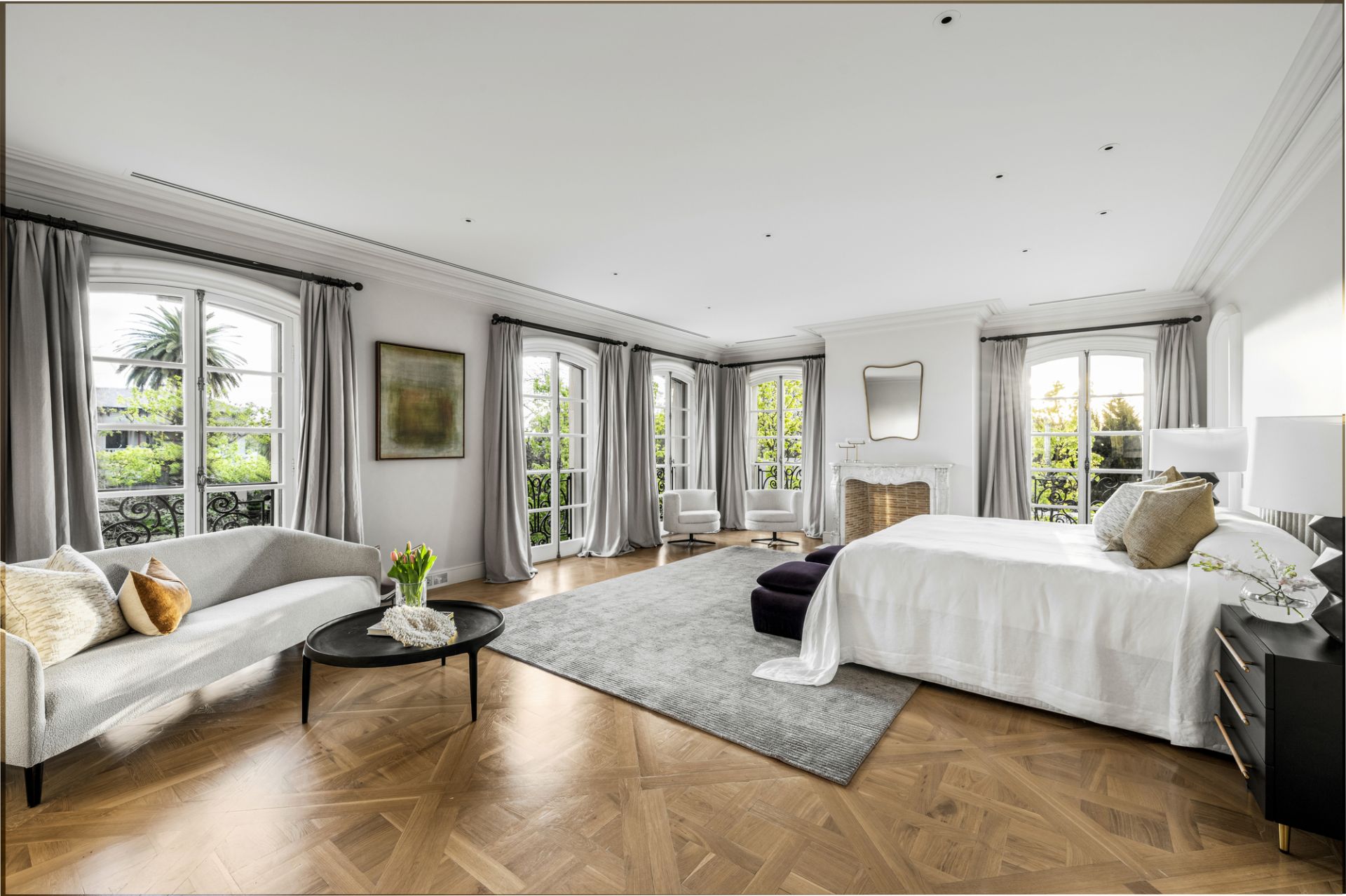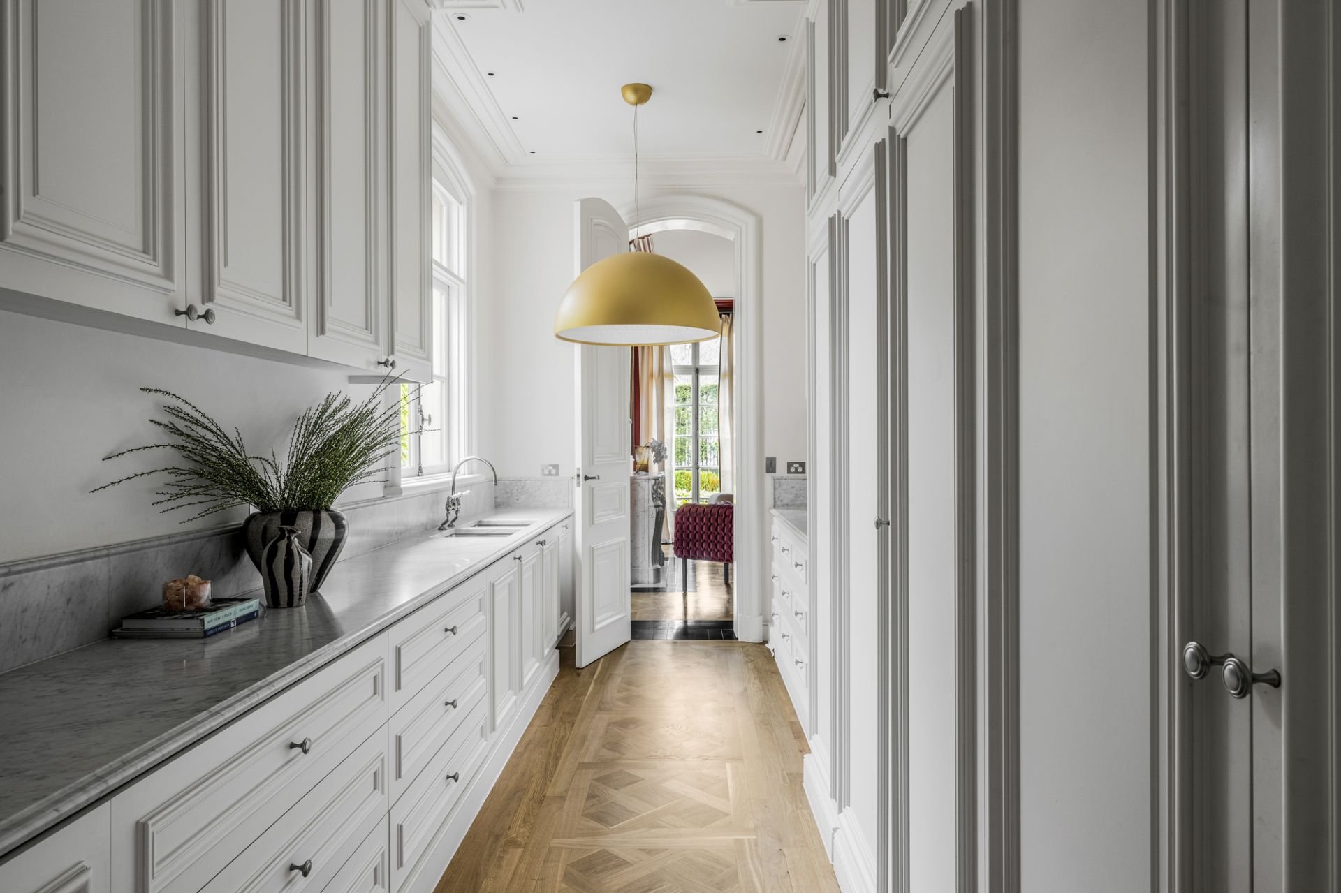 A central hallway adorned with marble flooring while illuminated by Tobia Scarpa Flos wall lights extends into a formal sitting room where the warmth of a hand-carved marble mantelpiece frames a large fireplace while the richness of European oak Versailles-style parquetry and tall casement windows add depth to a dramatic setting. Adjacent is an executive study graced with a black marble fireplace and a stunning Flos Sky Garden light fitting.