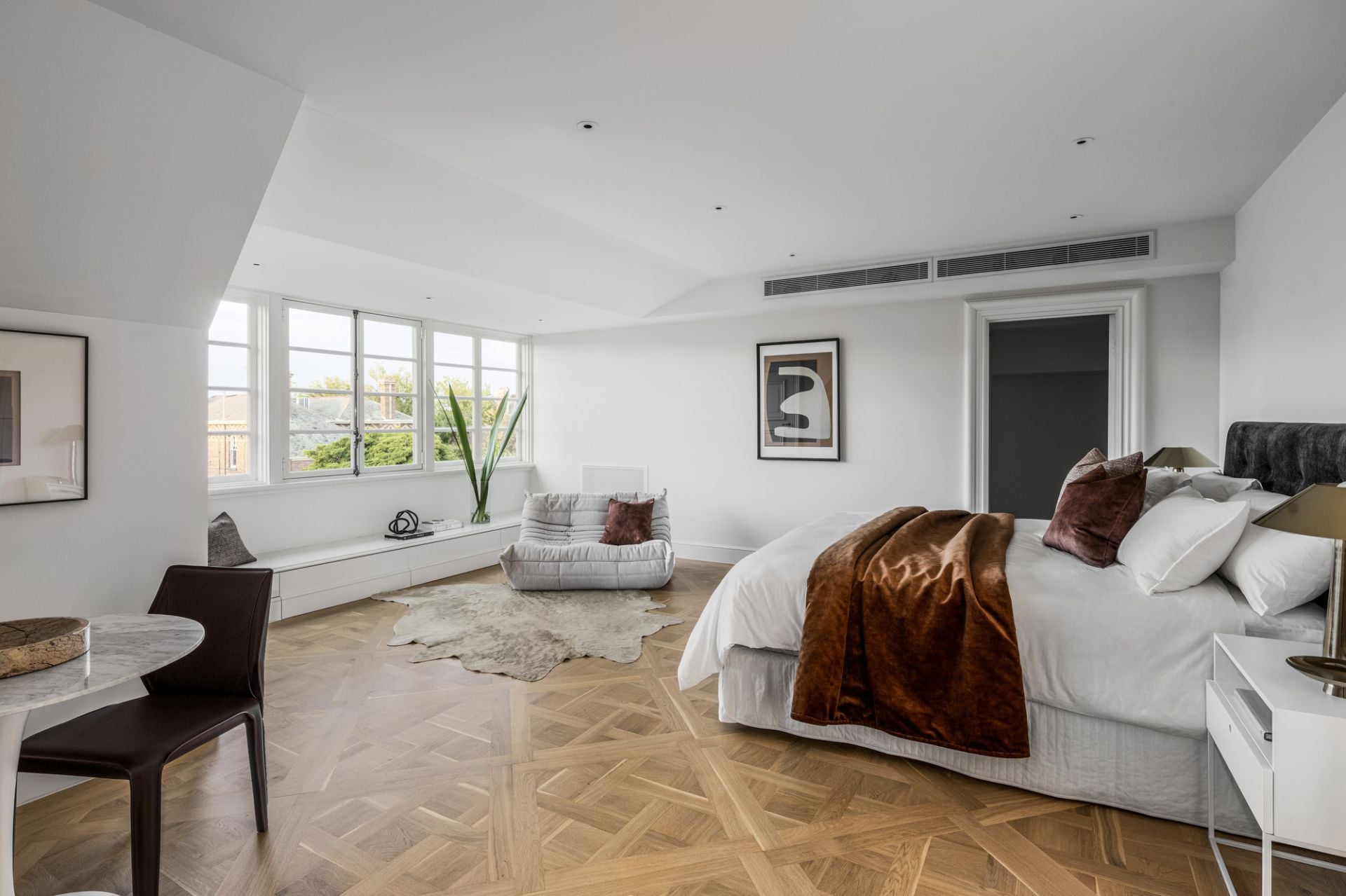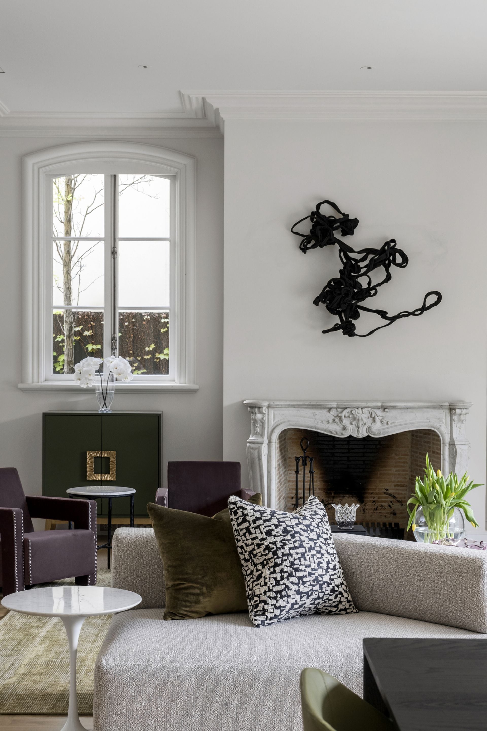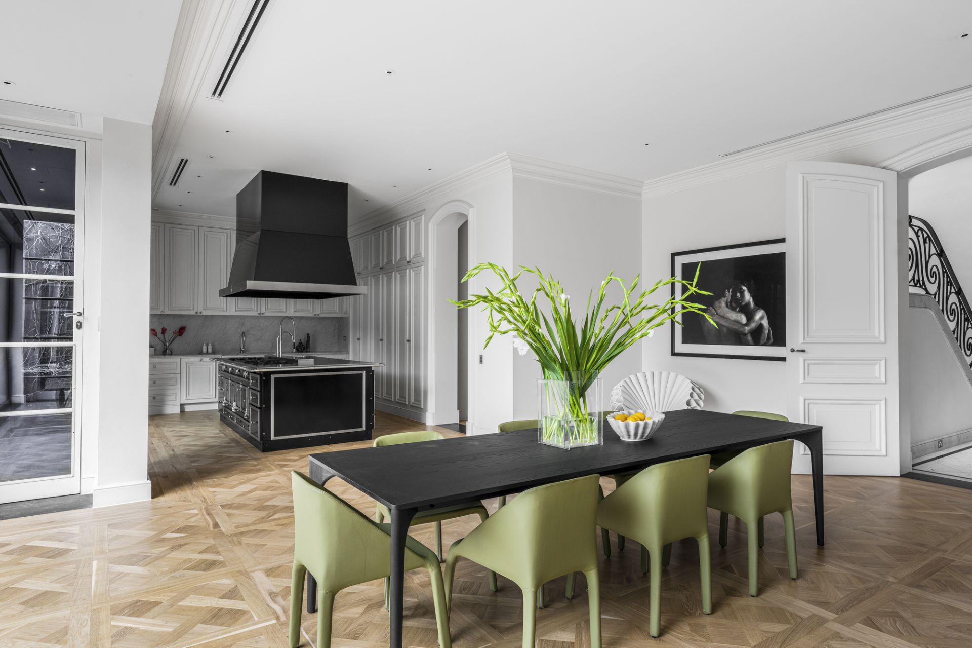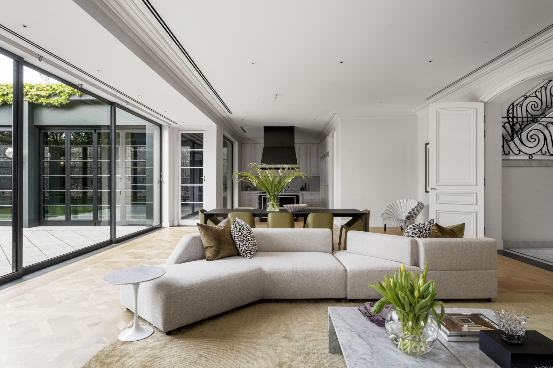 A central hallway adorned with marble flooring while illuminated by Tobia Scarpa Flos wall lights extends into a formal sitting room where the warmth of a hand-carved marble mantelpiece frames a large fireplace while the richness of European oak Versailles-style parquetry and tall casement windows add depth to a dramatic setting. Adjacent is an executive study graced with a black marble fireplace and a stunning Flos Sky Garden light fitting.