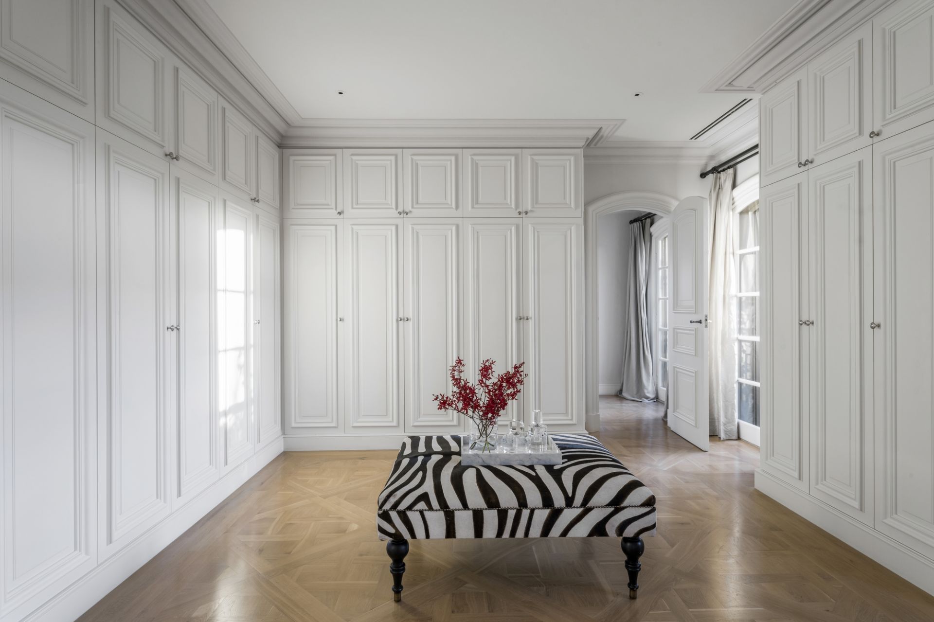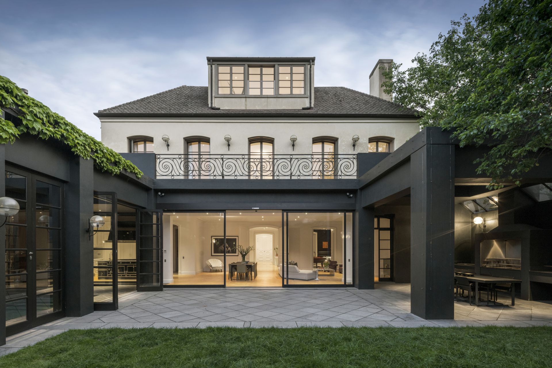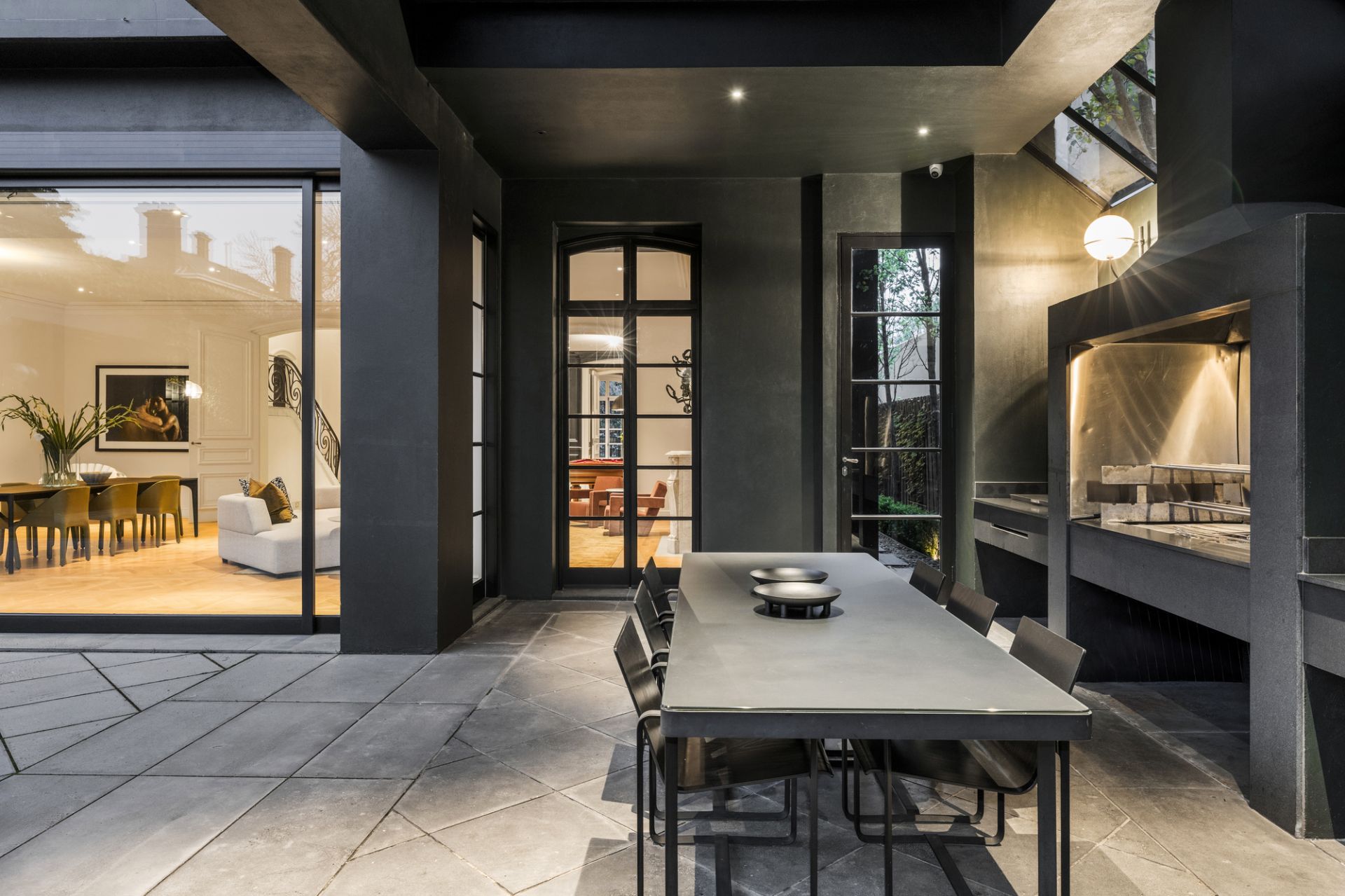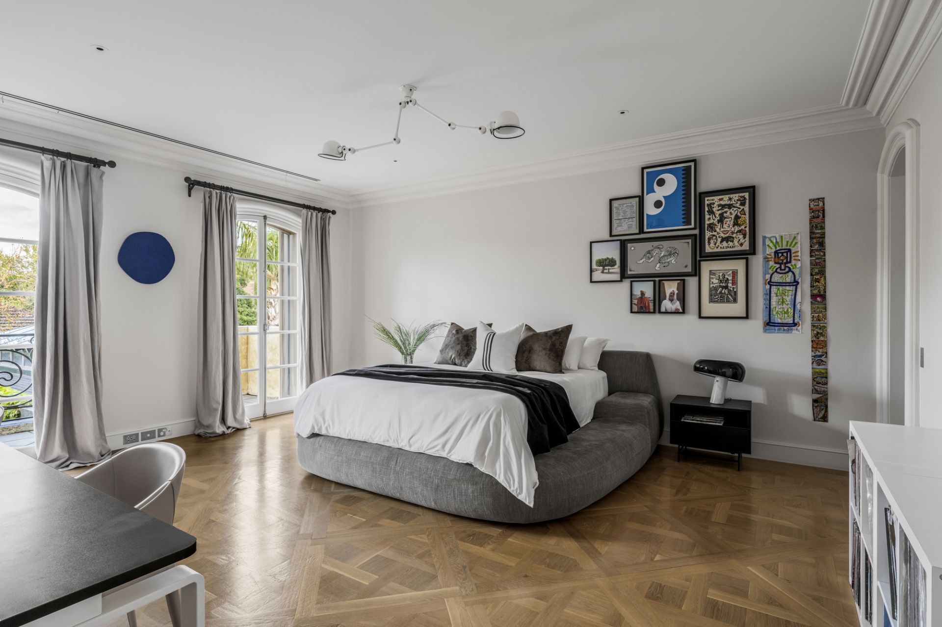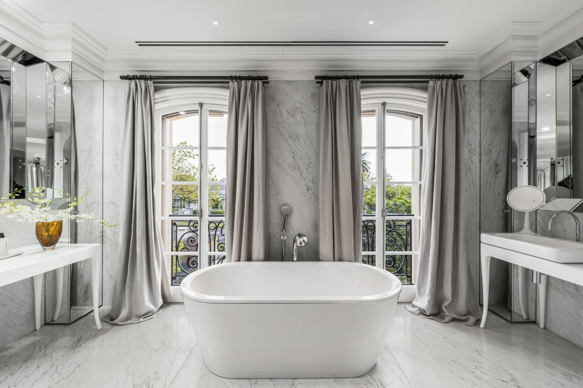 A basement level offers versatile space with storage rooms including a potential wine cellar, gym area and a vast garage accessible via a glass remote-control door and automatic return-driveway gates. Other attributes include a full-size laundry, zoned central heating/cooling, alarm system, CCTV surveillance, Alessi bathroom fittings and Remy Garnier Cremorne locks, hinges, and handles from Paris.