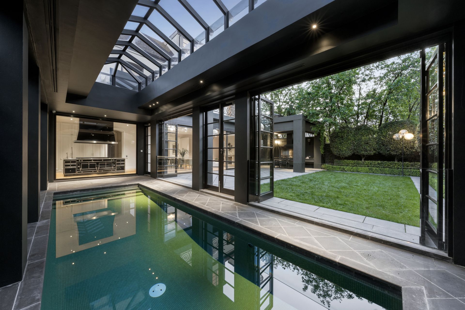 The family living domain features expansive picture windows with an automatic door that frame layers of north-facing rear landscaped greenery in a secluded oasis. Featuring an undercover terrace equipped with an Electrolux barbecue and motorized spit, an indoor mosaic-tiled swimming pool with bi-fold doors leading to the garden and a bathroom with a shower.