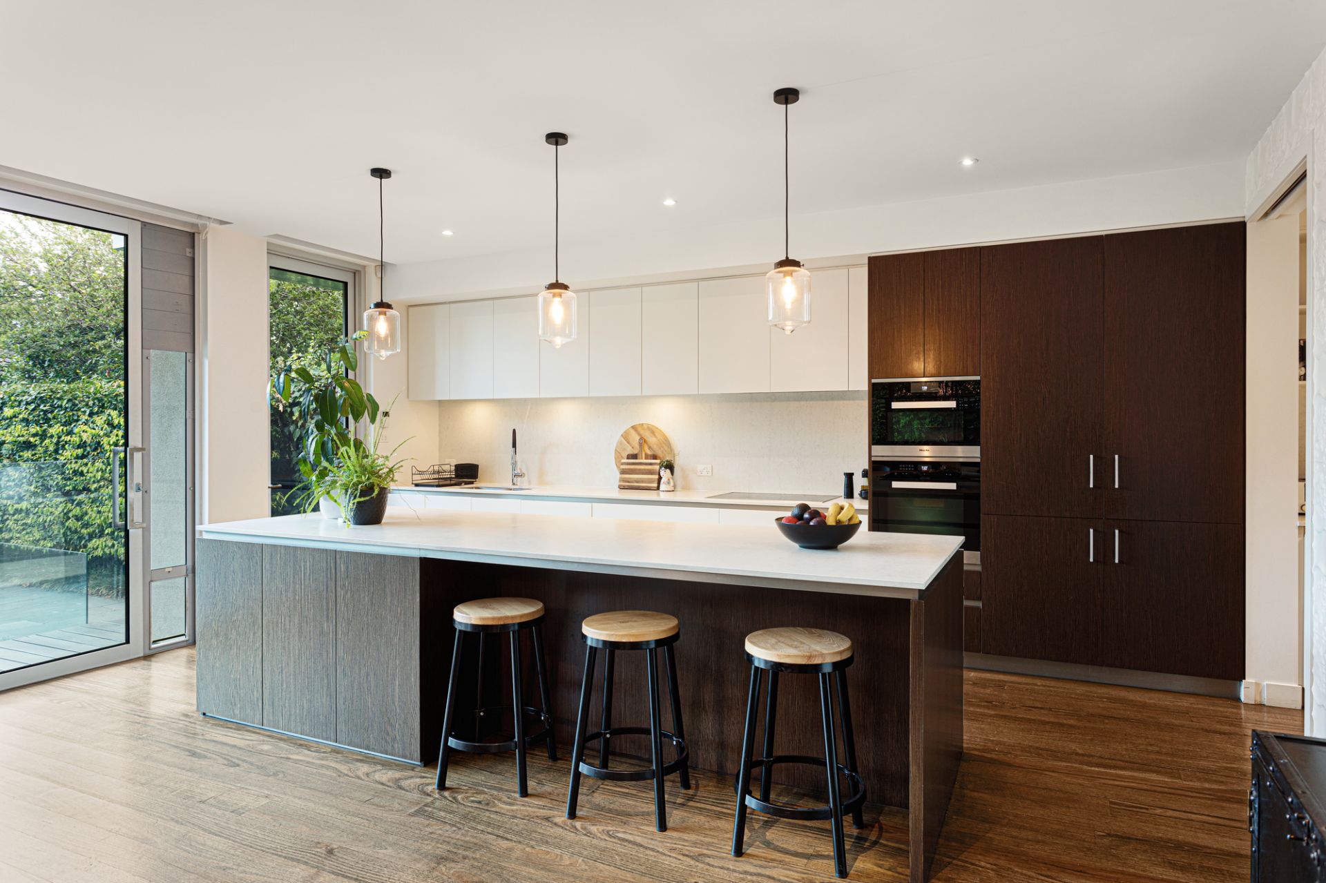 An expansive open-plan family domain with multiple stack-sliding doors integrates a stylish living area with a gas log fireplace and picture windows to the garden before a family dining area and a state-of-the-art kitchen, where a Miele induction cooktop, steam and convection ovens, an integrated double-door fridge/freezer and a stone-topped breakfast island enhance everyday living coupled with a butler’s pantry, dedicated study nook and a full-size laundry area.