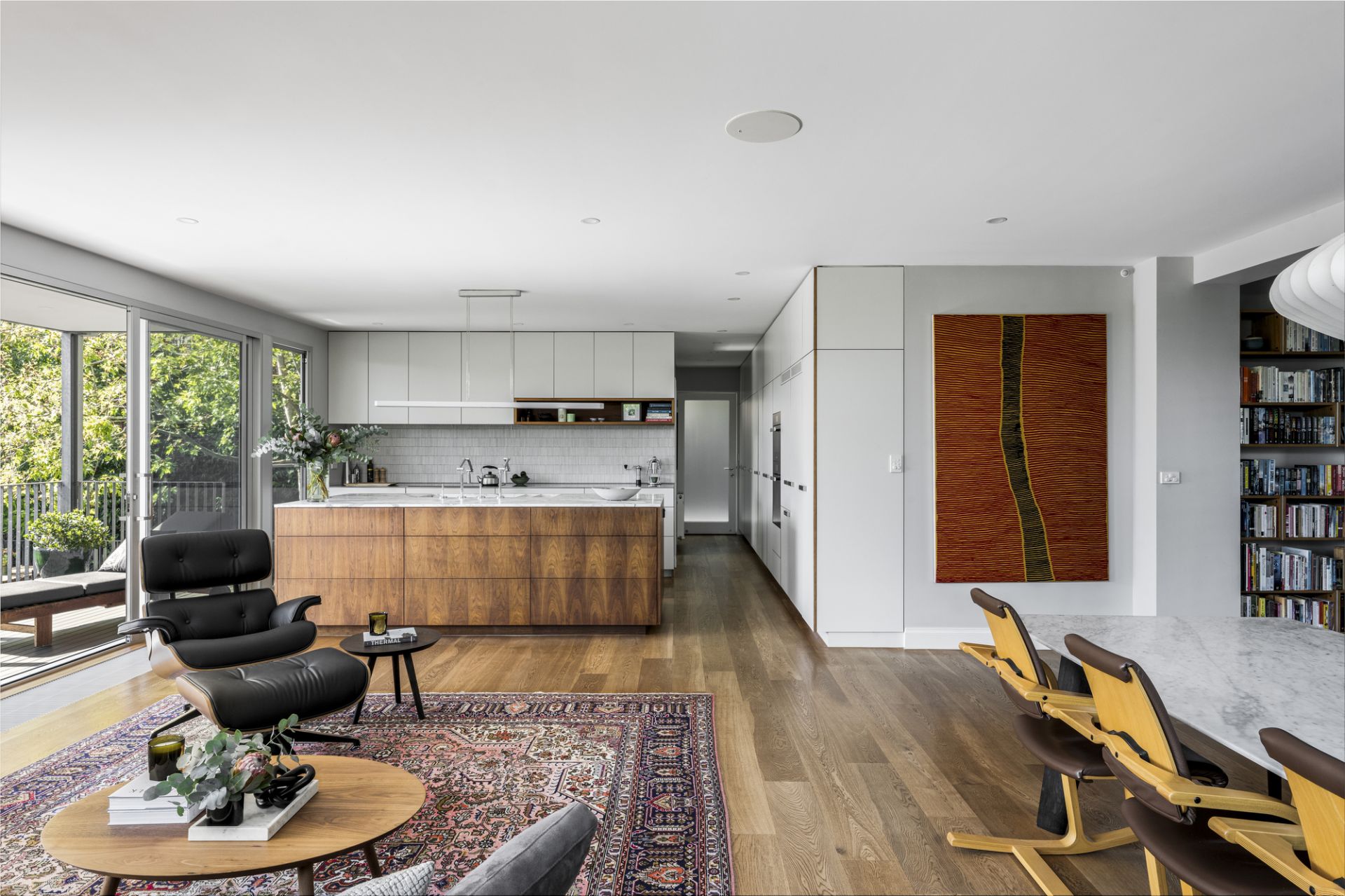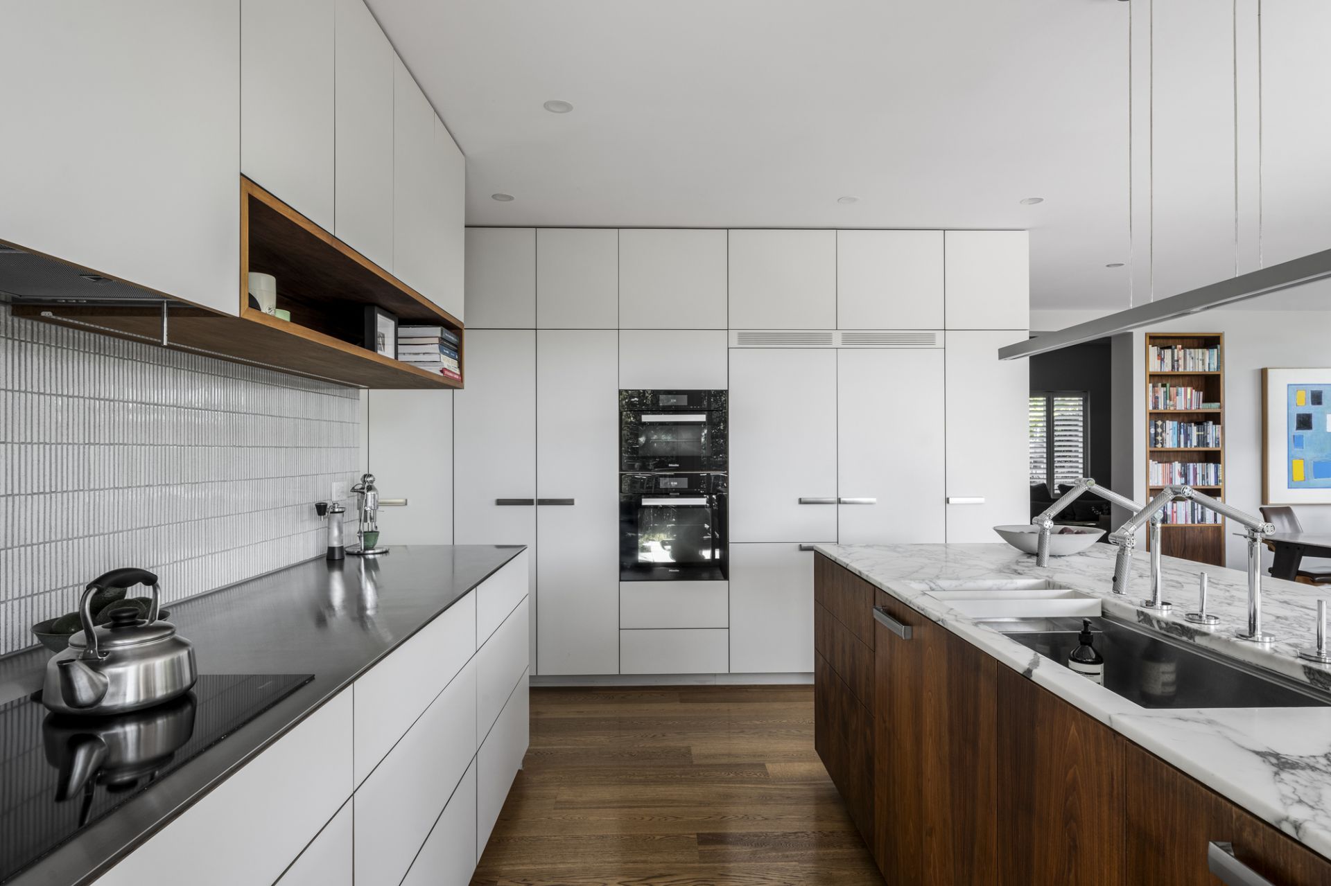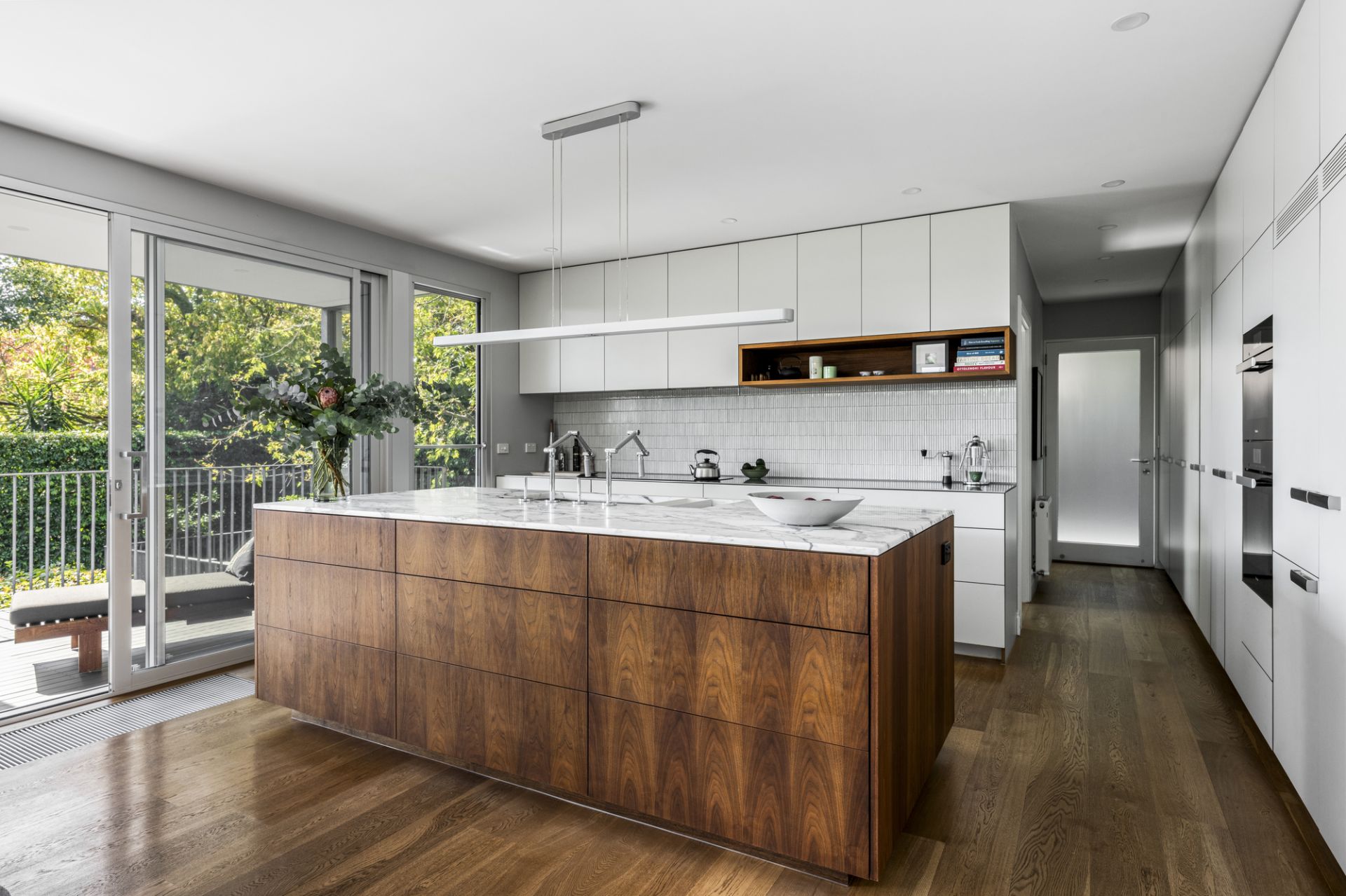 Etched glass doors reveal a stylish lounge room that extends to a brilliant family dining and living room framed by picture windows with automatic external blinds and sliding doors, and a magnificent Arabescato marble kitchen equipped with premium Miele appliances (induction cooktop, steam/pyrolytic ovens, twin integrated fridges/freezer, dishwasher), filtered and standard water taps, and expansive concealed storage. Additional features include hydronic heating, ducted cooling, double-glazing, speaker system, heated towel rails, oak flooring and walnut joinery.