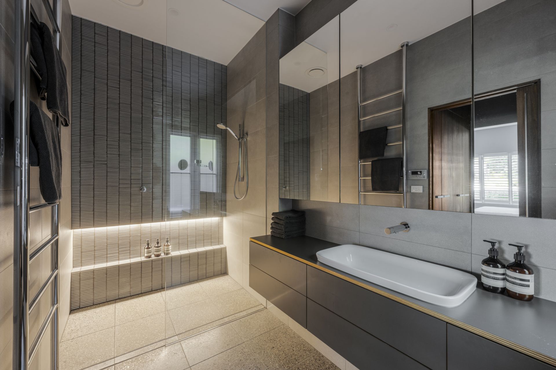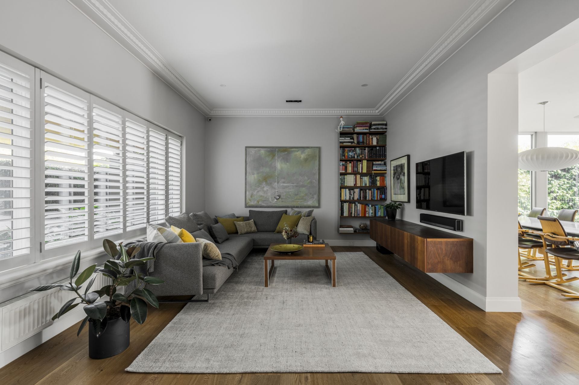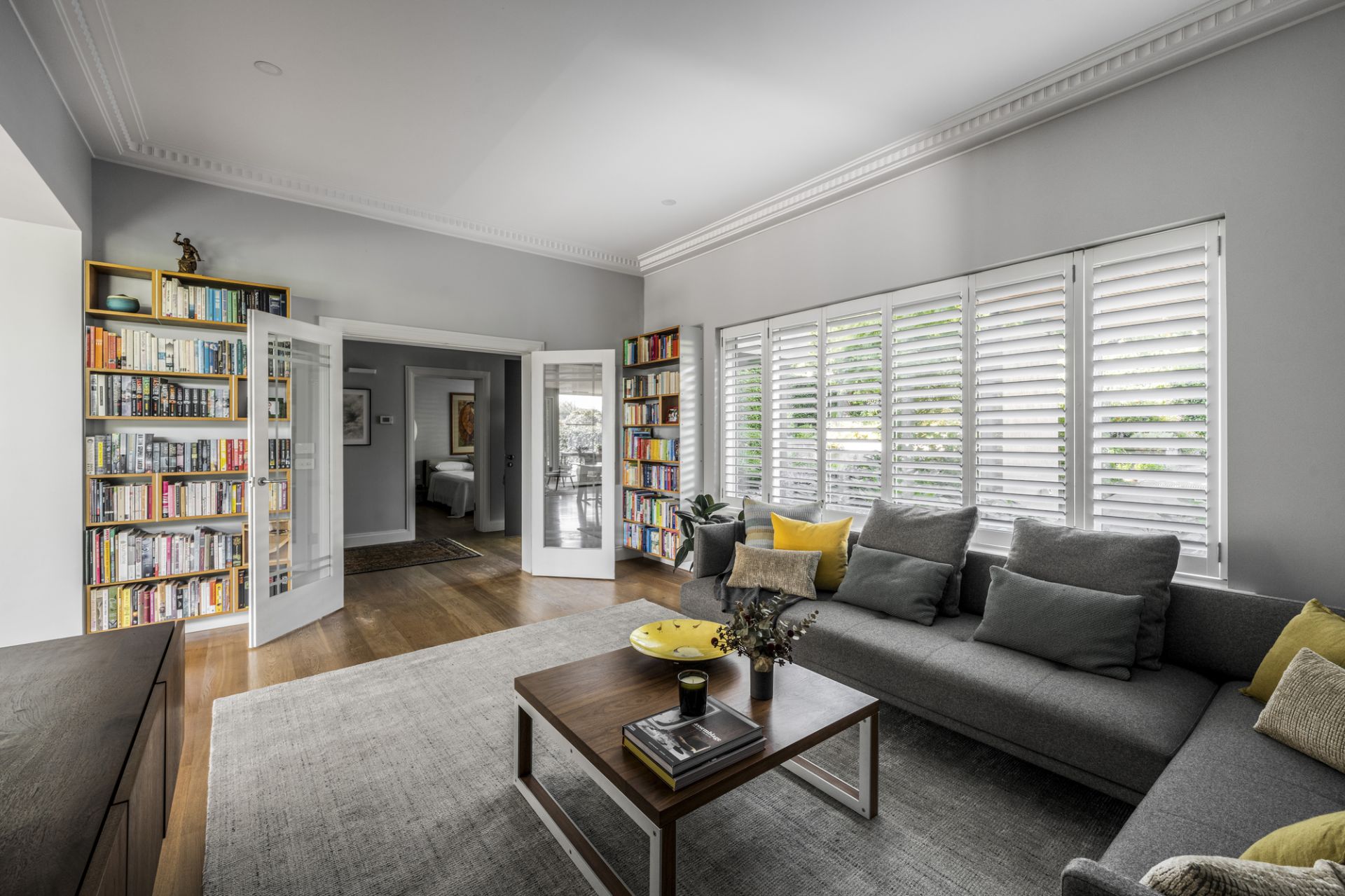 Etched glass doors reveal a stylish lounge room that extends to a brilliant family dining and living room framed by picture windows with automatic external blinds and sliding doors, and a magnificent Arabescato marble kitchen equipped with premium Miele appliances (induction cooktop, steam/pyrolytic ovens, twin integrated fridges/freezer, dishwasher), filtered and standard water taps, and expansive concealed storage. Additional features include hydronic heating, ducted cooling, double-glazing, speaker system, heated towel rails, oak flooring and walnut joinery.