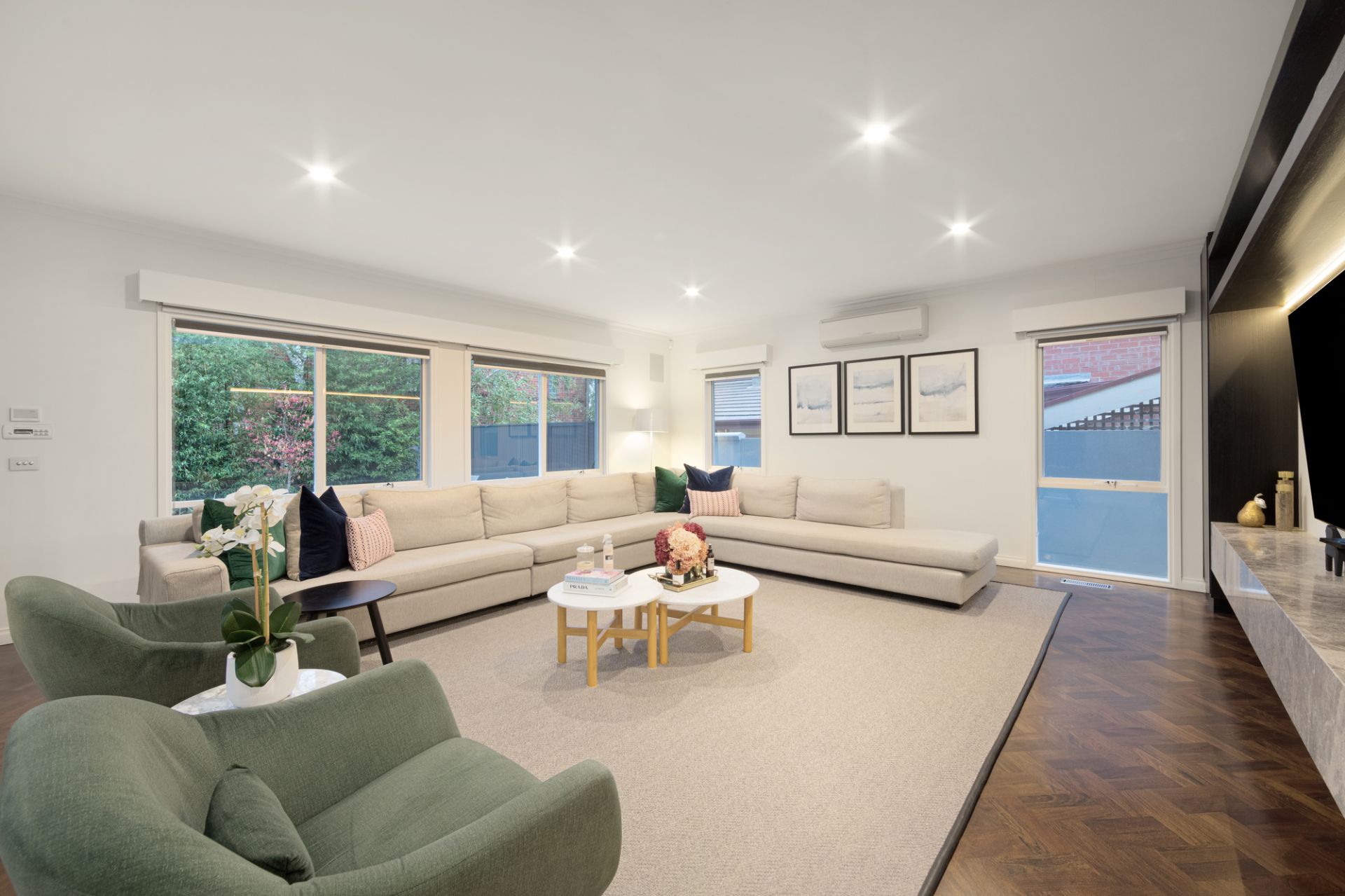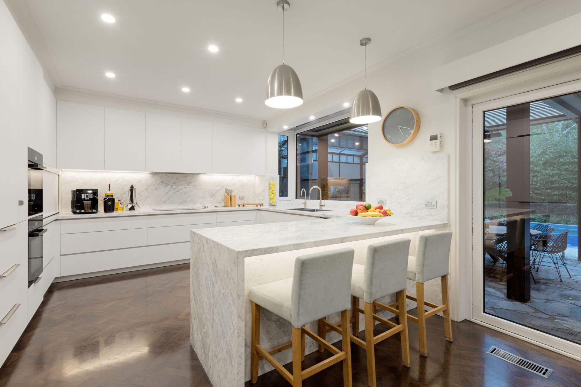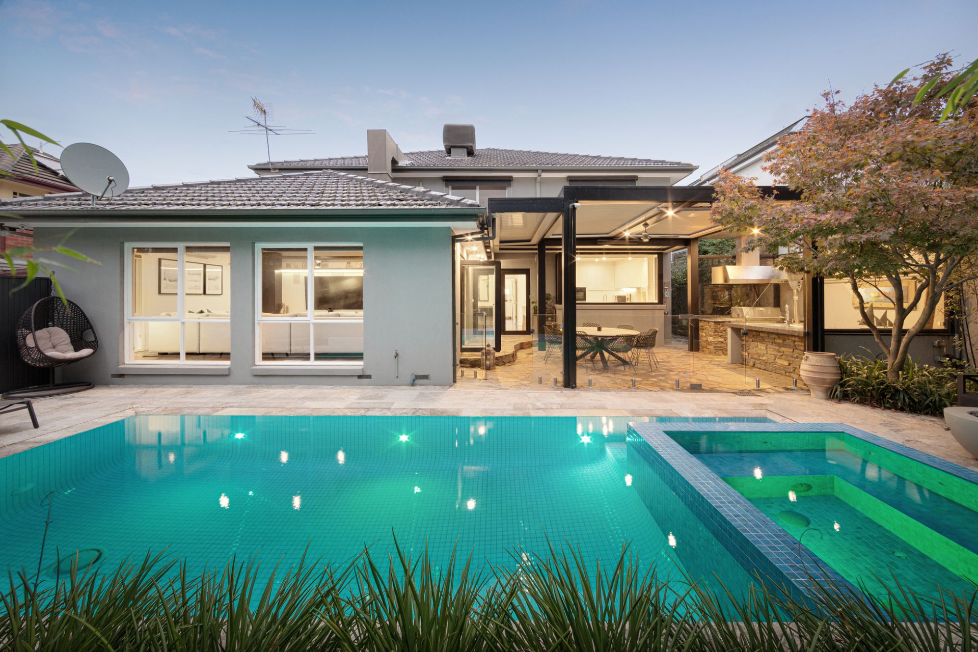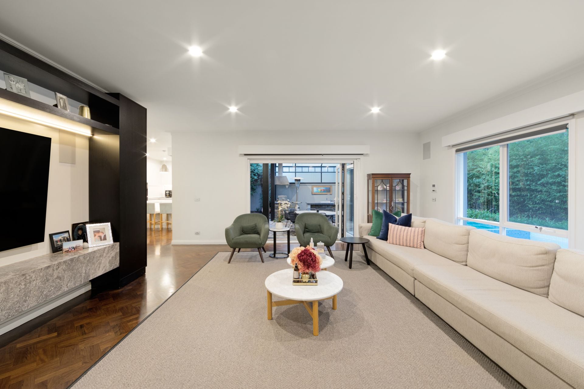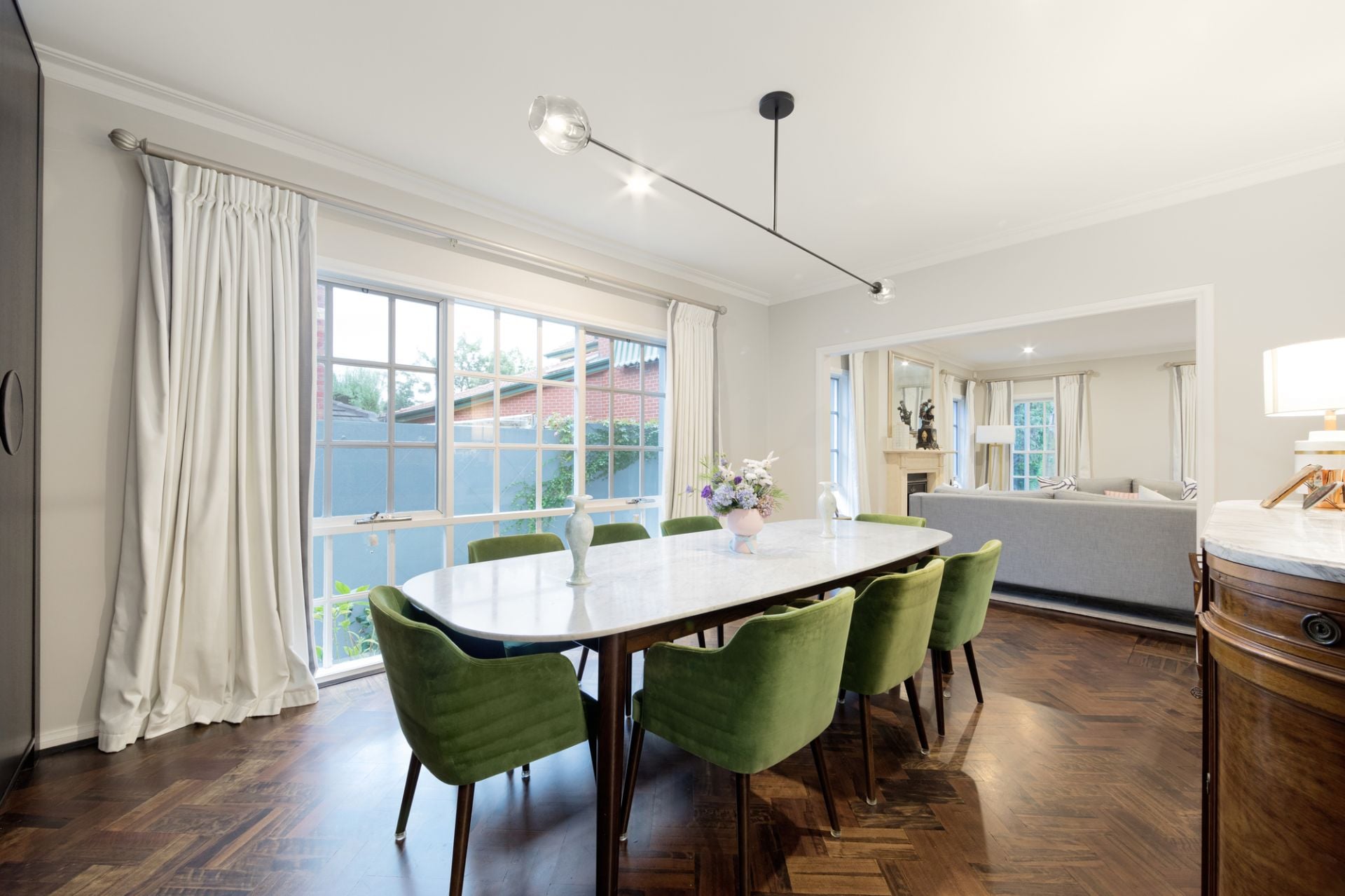 Other attributes include a powder room, laundry, Brush Box herringbone timber floors, designer lighting, electric blinds throughout, central heating, air-con, double-glazing, video intercom, alarm, ducted vacuum, CCTV, built-in speakers and automatic gates to remote-control double garage. Uncompromising attention to detail underpins the excellence of this family entertainer offering a distinguished lifestyle opportunity near Xavier, MLC and other elite schools, High Street shopping and cafes, trams and tranquil Yarra River trails and parkland.