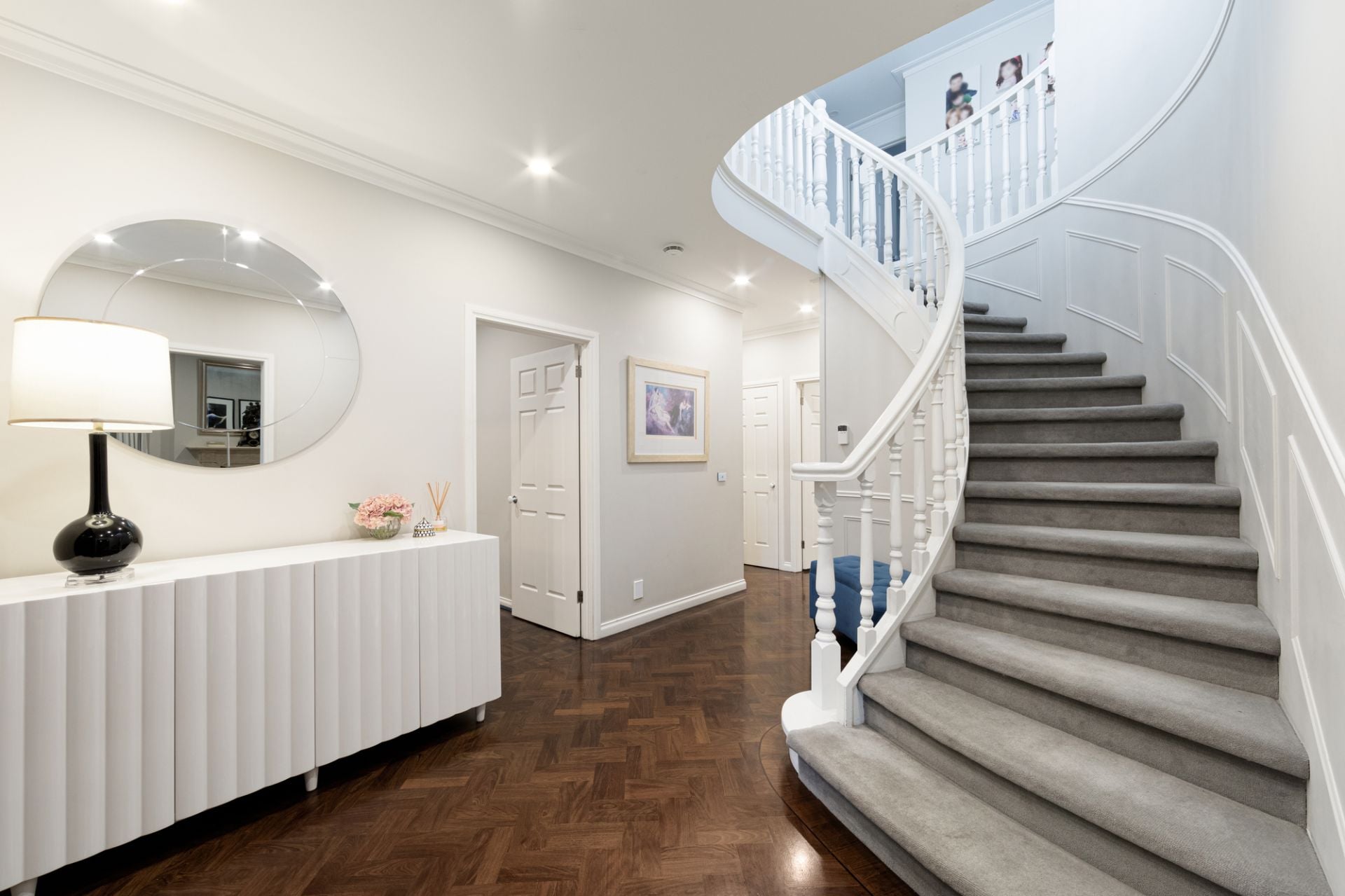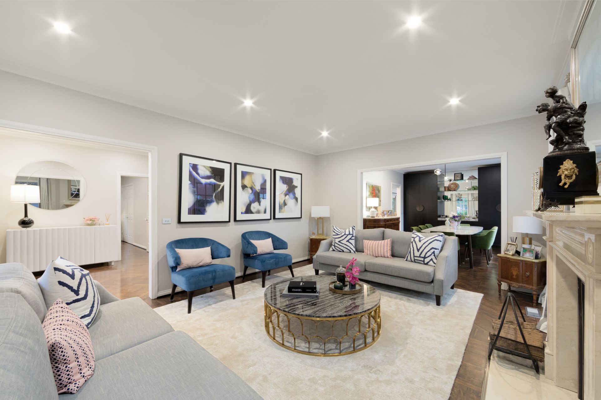 A formal sitting room with a marble fireplace flows to an elegant dining room with both offering a seamless setting for refined gatherings, served by a luxury kitchen lined with Alba marble that highlights a suite of Miele appliances (induction cooktop, regular/steam ovens), integrated Liebherr fridge/freezer, Vintec wine fridge and a Zip sparkling/chilled/boiling water tap. Further are separate family dining and living rooms (entertainment unit) along with garden aspects and wide bi-fold doors.