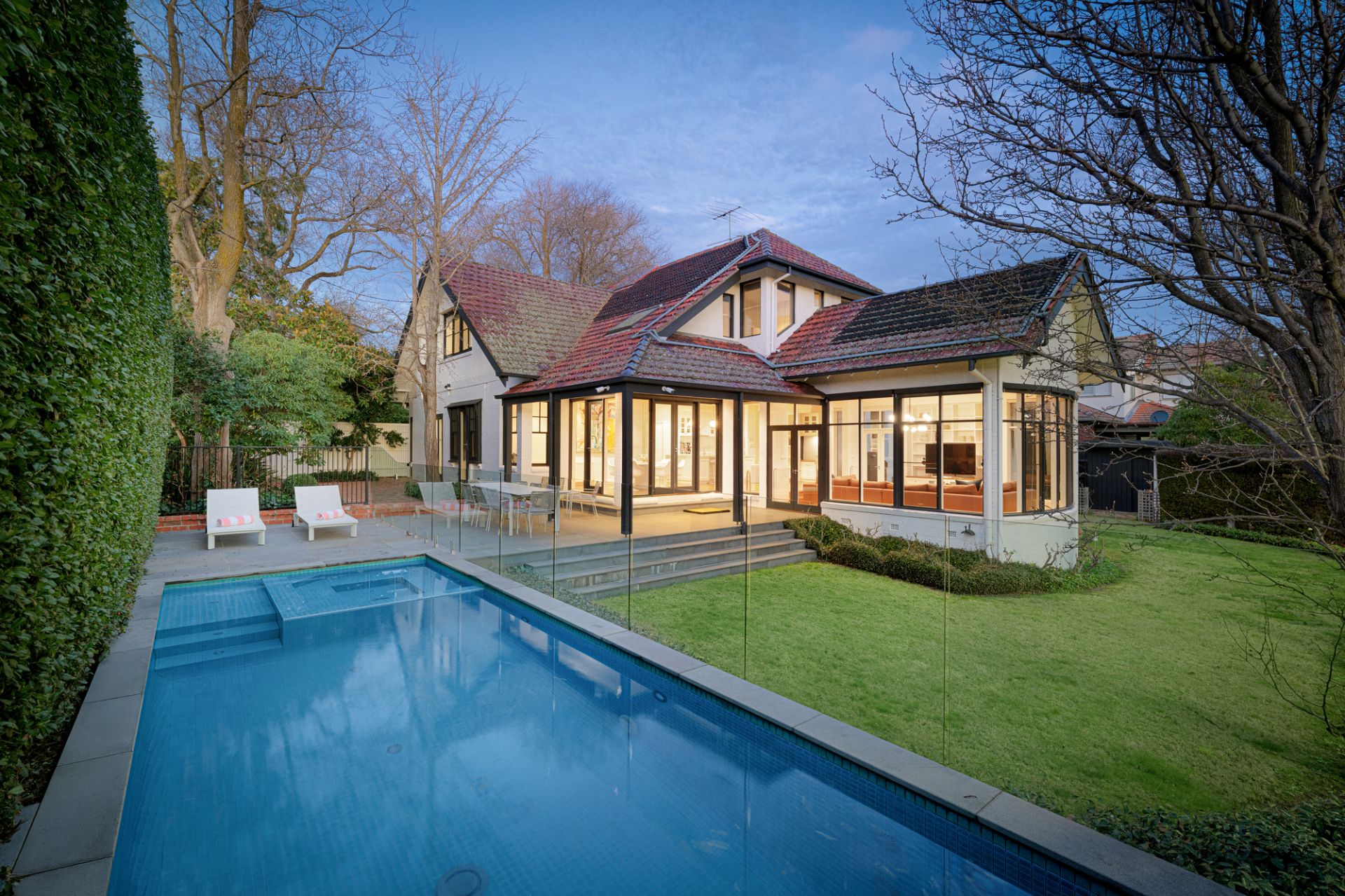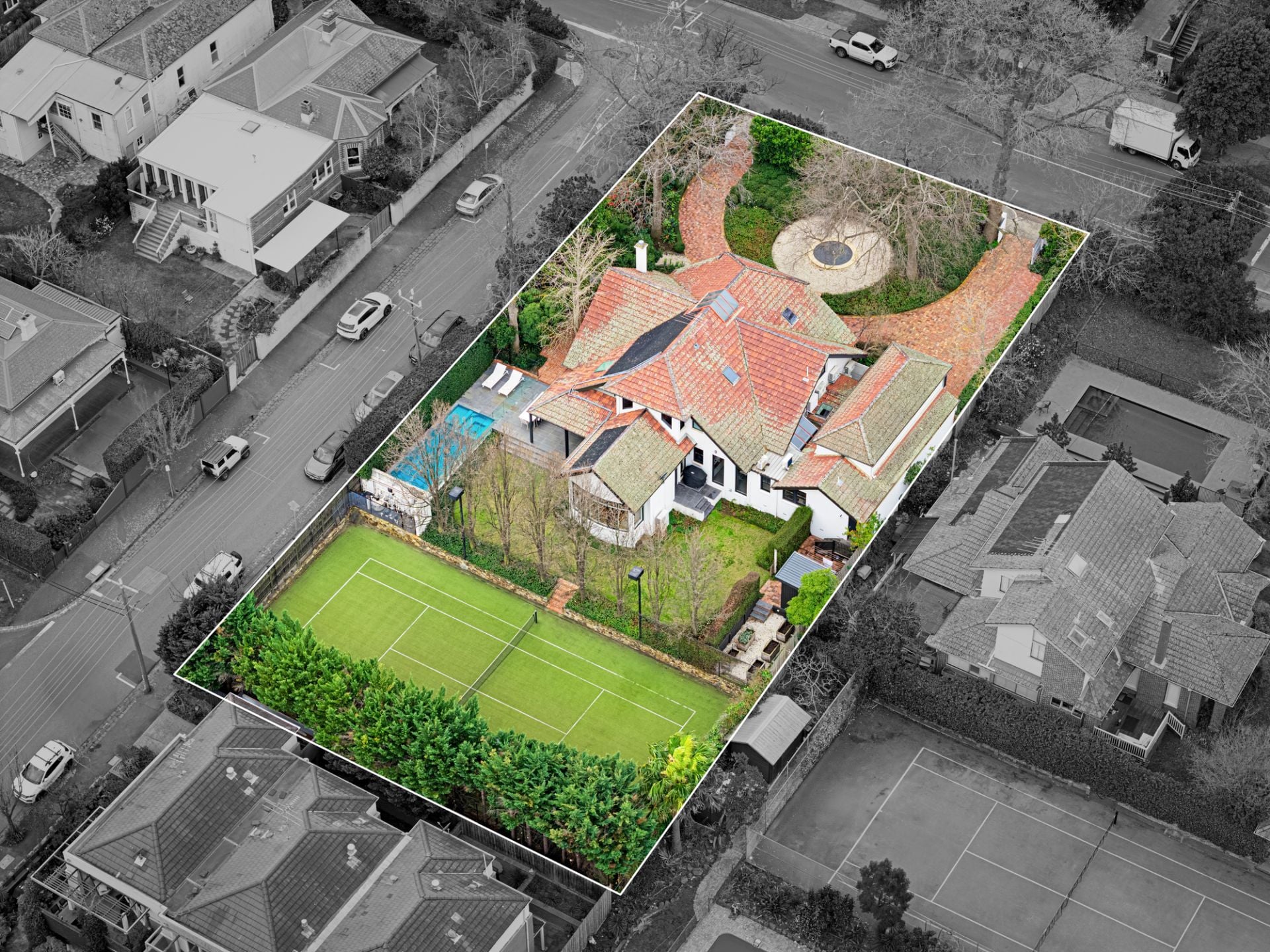 Leafy Paul Bangay landscaped garden with a circular fountain pond and gated return driveway creates a beautiful private setting opposite Carey Grammar School for this substantial five bedroom and study residence on a 1864 sqm approx. corner allotment in the esteemed Sackville Ward. A sanctuary of space and serenity, this attractive two-level home offers an idyllic family lifestyle blending extensive accommodation with expansive outdoor entertaining including a tennis court, pool and spa. Engaging with leafy surroundings at every turn, connecting formal lounge (gas fireplace) and dining rooms showcase elegance and refinement with solid polished floorboards extending across to a glorious ground-floor main suite featuring a spacious bedroom, built-in robes, a walk-in robe and a large ensuite. Further is a fitted study and chic ensuite, while a first-floor children’s wing offers four bedrooms, an ensuite, a dual-vanity bathroom, powder room and a superb lounge/retreat. Situated above a remote-control internal garage is a wonderful movie room with gold-class equipment, then back downstairs at the rear are flowing yet designated family dining and living spaces overlooking the garden complemented by a stunning Miele-appointed kitchen (induction cooktop, steam oven) with a breakfast waterfall island. Multiple doors link seamlessly outside to a covered terrace, self-cleaning saltwater pool/spa (gas/solar heating) and a N/S floodlit, mod-grass tennis court. A secluded and sun-drenched oasis for the ultimate in family alfresco enjoyment and entertaining guests, this magnificent residence also includes a big laundry (drying cupboard), a third powder room, mudroom, wine cellar, abundant storage, CCTV surveillance, alarm system, valet intercom, hydronic heating, split-system air-conditioning and ducted vacuum, along with vegetable boxes, a garden shed and automatic irrigation system. Located on a substantial Sackville Ward landholding with the tennis court fronting Fitzwilliam Street, this grand Kew property with no heritage overlay is perfectly poised for now and the future in a prestigious pocket near a selection of Melbourne’s premier private schools, parklands, Burke and Cotham Roads’ trams and a range of shopping precincts including Camberwell Junction, Glenferrie Road and Auburn Village.