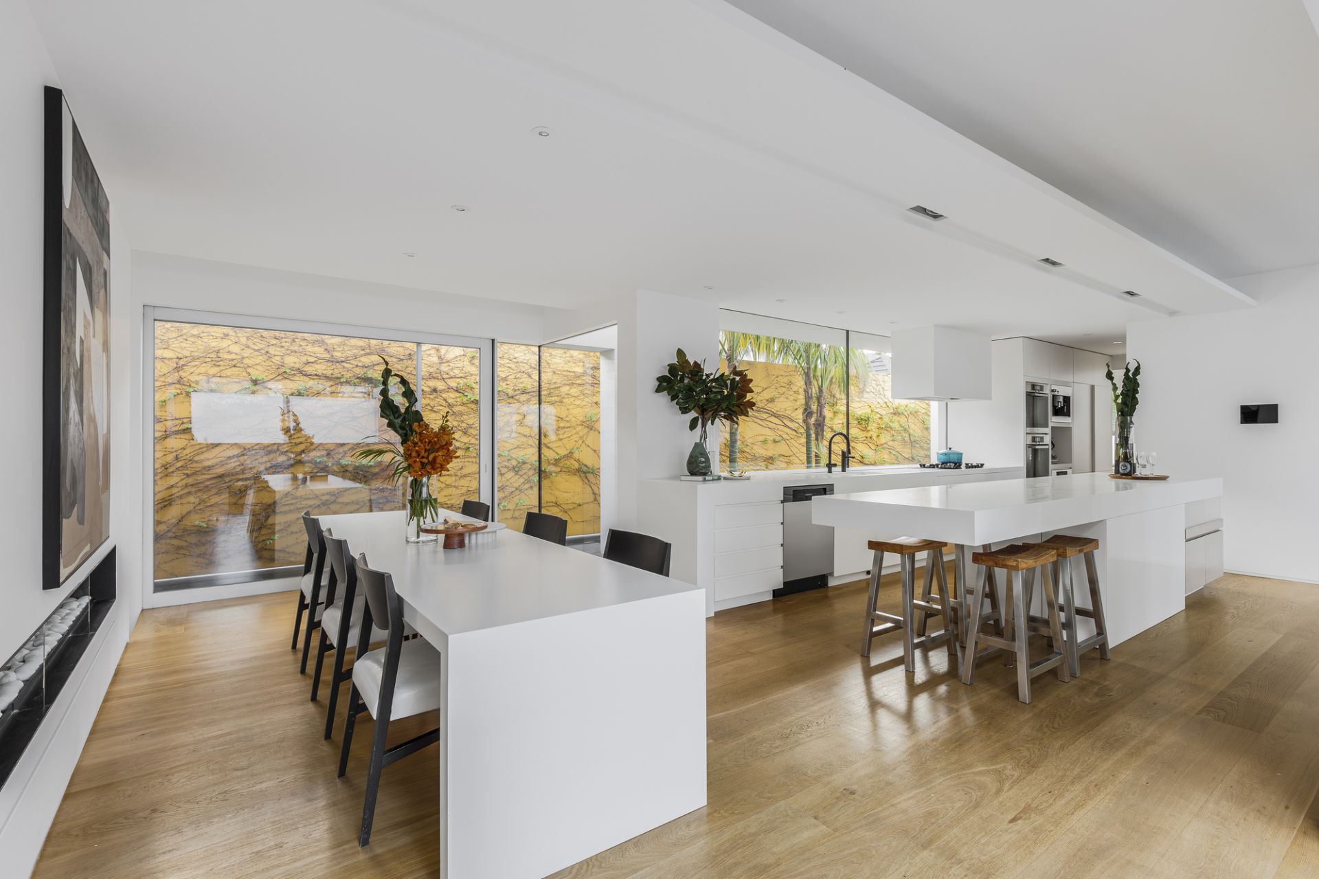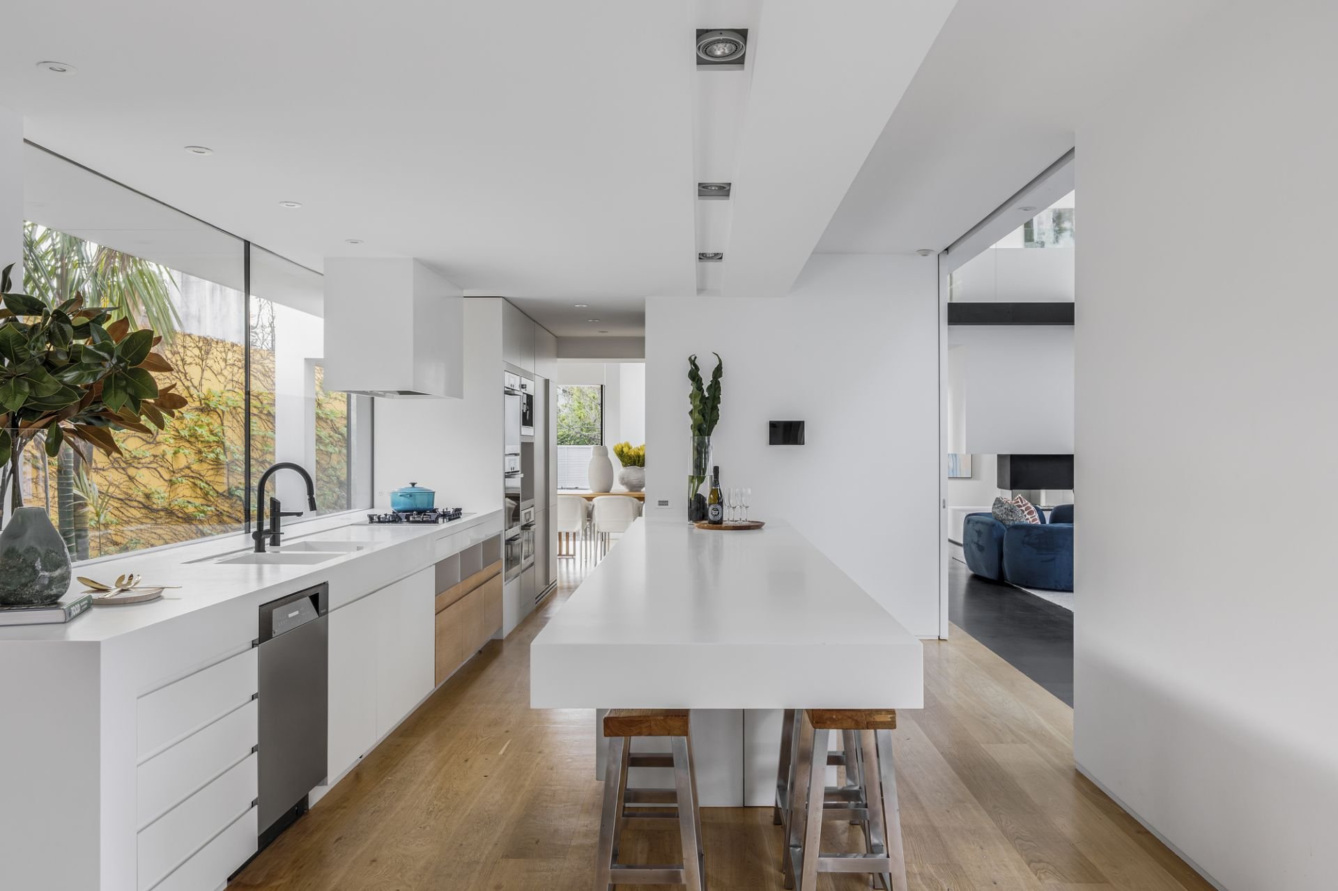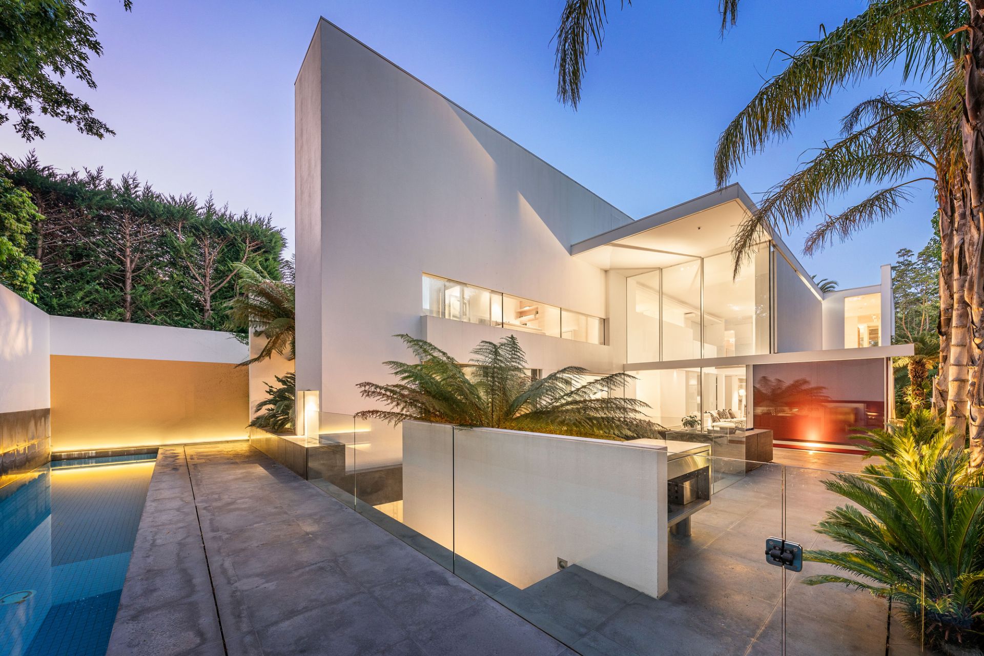 The open-plan living and dining zone, anchored by a statement gas fireplace, extends through frameless bifold doors to an entertainer’s terrace with built-in BBQ and a self-cleaning, heated lap pool. The state-of-the-art kitchen impresses with a marble island, walk-in pantry, Liebherr fridge/freezer, Miele coffee machine, and double ovens.