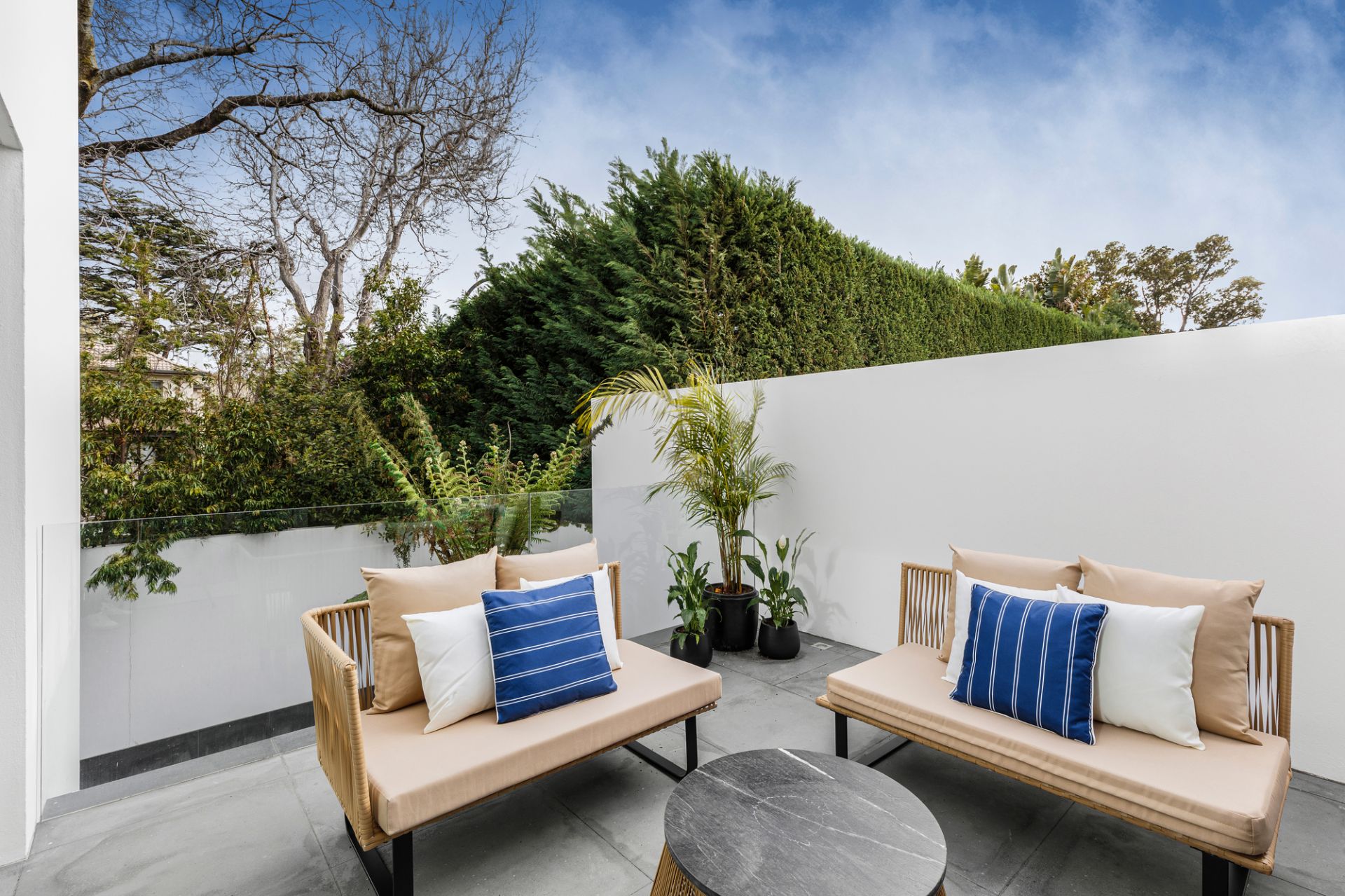 Upstairs, a central study complements three spacious bedrooms, each with private ensuite, built-in robes, balcony access, and large enough to comfortably accommodate double beds. The main suite is a sanctuary of its own — featuring a bespoke dressing room, designer ensuite, private office, and a rooftop terrace with panoramic views.