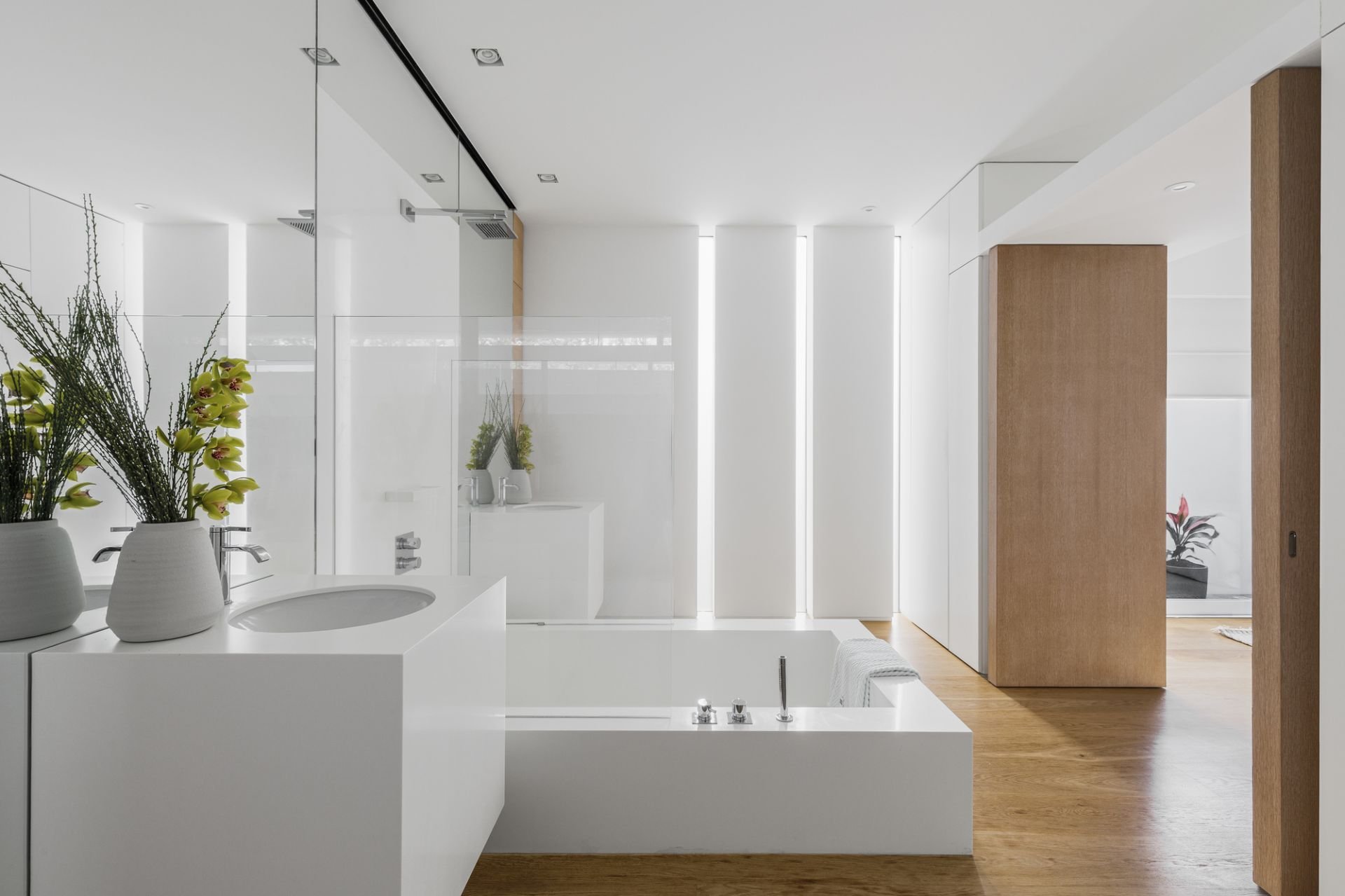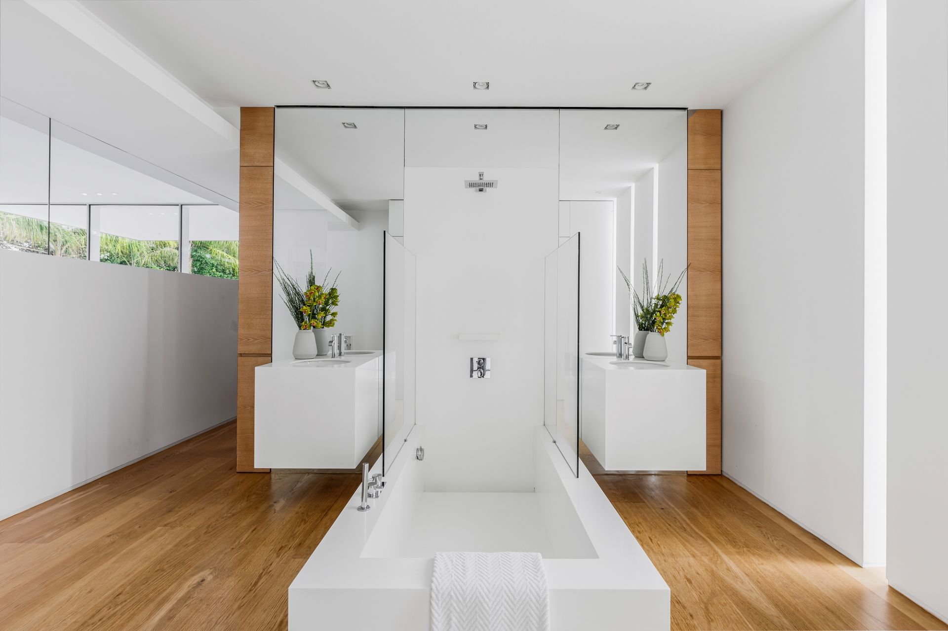 Set amid 360-degree landscaped gardens, the home’s bold façade and interior design showcase soaring voids, expansive glass walls, and seamless indoor-outdoor flow, creating a perfect balance of light, space, and privacy. Every detail speaks of precision and quality — from Basaltina stone and Russian white oak floors (crafted from a single tree) to lambswool insulation, double glazing, and a solid-cast concrete second floor, underscoring exceptional build integrity.