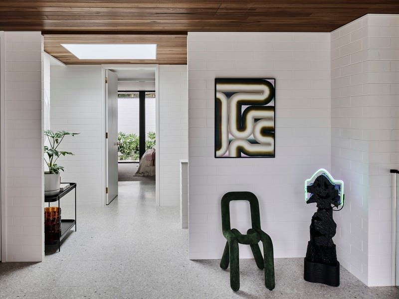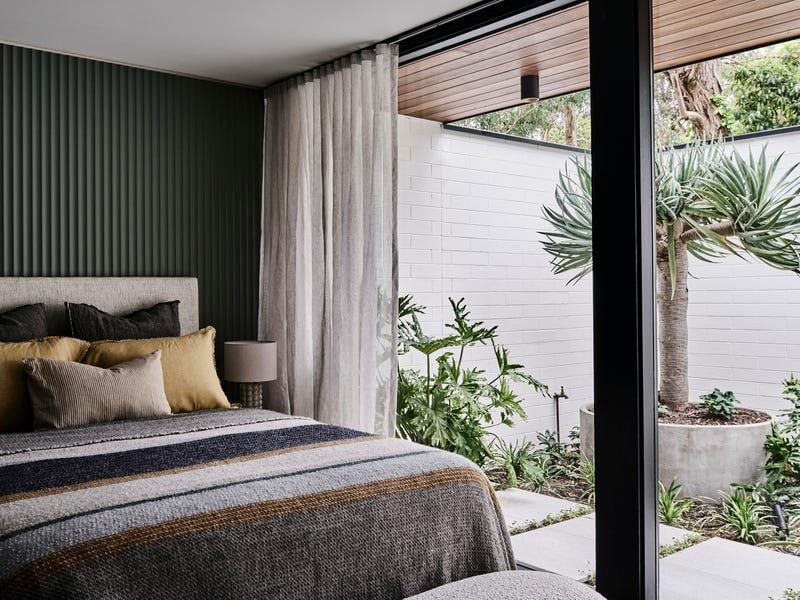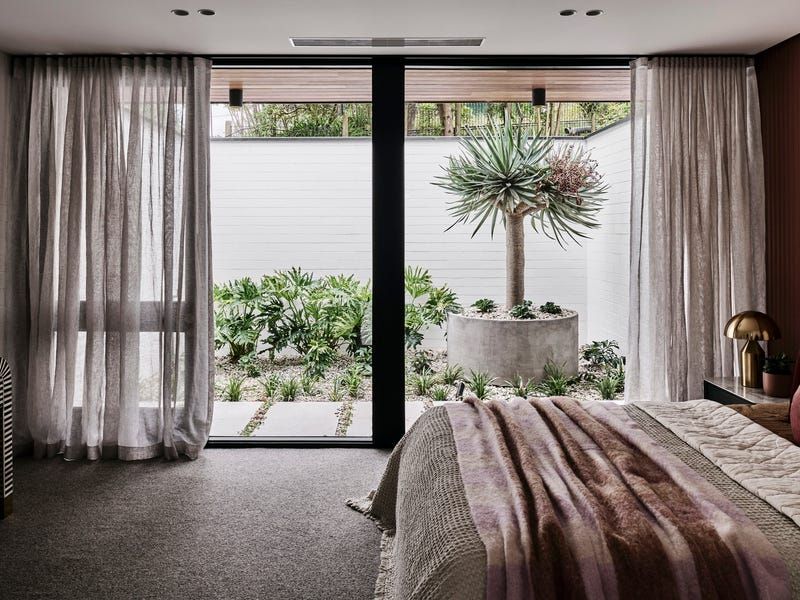 Opening to a series of private north-facing courtyards, the split-level layout seamlessly unfolds from an entrance hall to a beautiful main bedroom with a custom-built walk-in robe and stunning marble-lined ensuite. Further are three great-sized bedrooms (built-in robes, desks) complemented by a sensational bathroom with a freestanding handmade concrete bath and frameless shower. Additionally, a flexible large home office, gym or extra bedroom includes an ensuite, storeroom and a wine cellar.