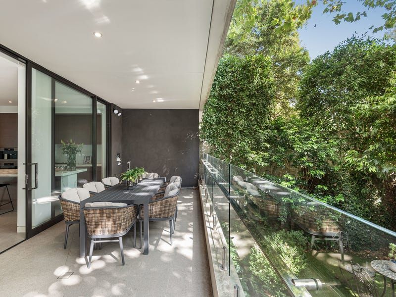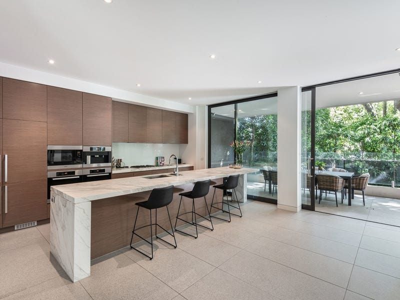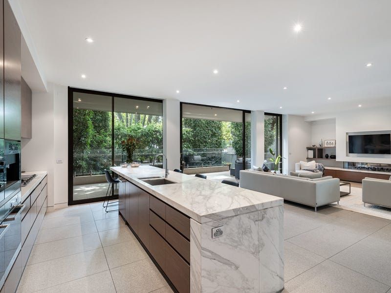 The exceptional scale of the north/west facing living and dining space with gas pebble fireplace is further accentuated with an open plan design and floor-to-ceiling glass sliding doors with a leafy outlook. These flow onto a landscaped private terrace and lower courtyard which provide a relaxed spot for entertaining family or friends.