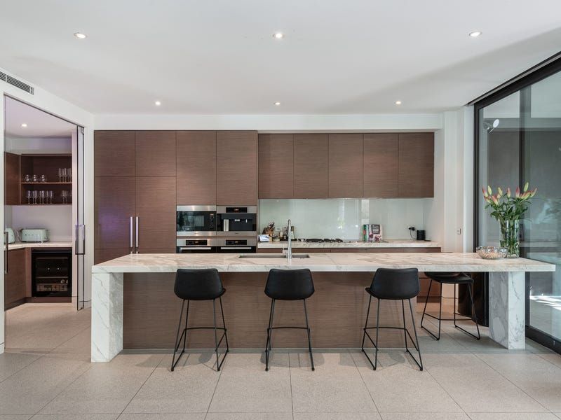 The state-of-the-art gourmet kitchen is a chef's dream with an oversized Calacatta marble island bench with waterfall edges, a full suite of Miele appliances including a double oven and coffee maker and an integrated fridge/freezer. An adjacent butler's pantry is also impeccably equipped with abundant storage and a second sink and Miele dishwasher.