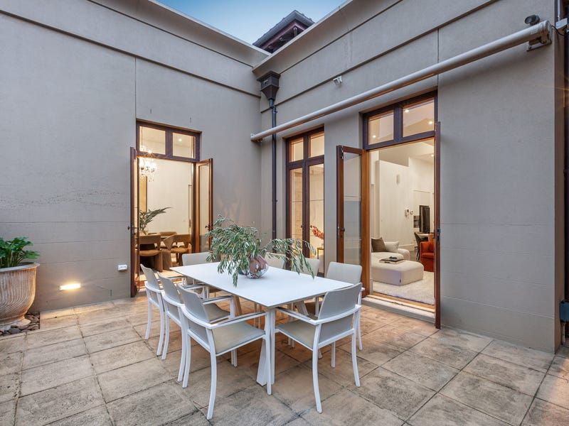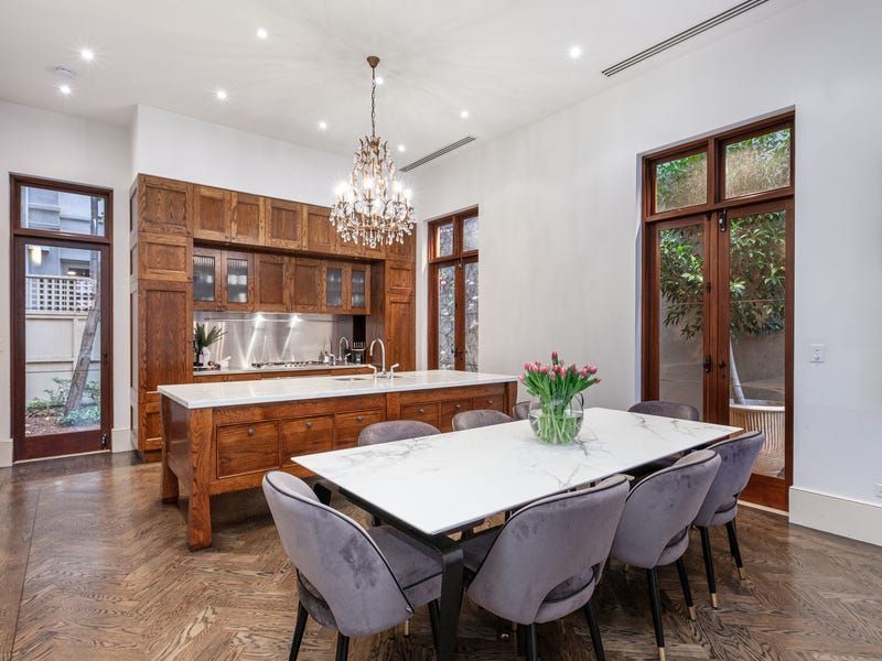 The kitchen overlooks the dining and living area which is flooded in northern light thanks to a double-height void and the multiple French doors, which open up the space to the appealing European-style courtyard.