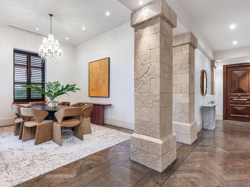 Stepping into the home through the ornate loggia, the soaring ceilings, gorgeous American Oak parquetry flooring and sandstone features hint at the meticulous attention to detail and refined European interiors within.