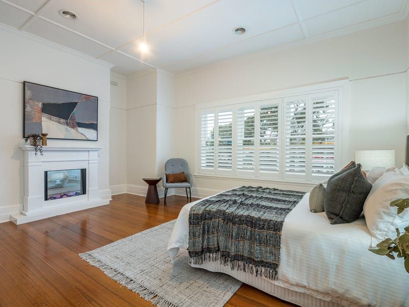 An enormously proportioned main bedroom comprises of electric fireplace, ample built-in robe space, with a second large bedroom presenting ample natural light, a clean and crisp bathroom and separate powder room. Additional appointments include ducted heating, freshly painted interior, , original wooden floors throughout and Plantation shutters installed in the home.