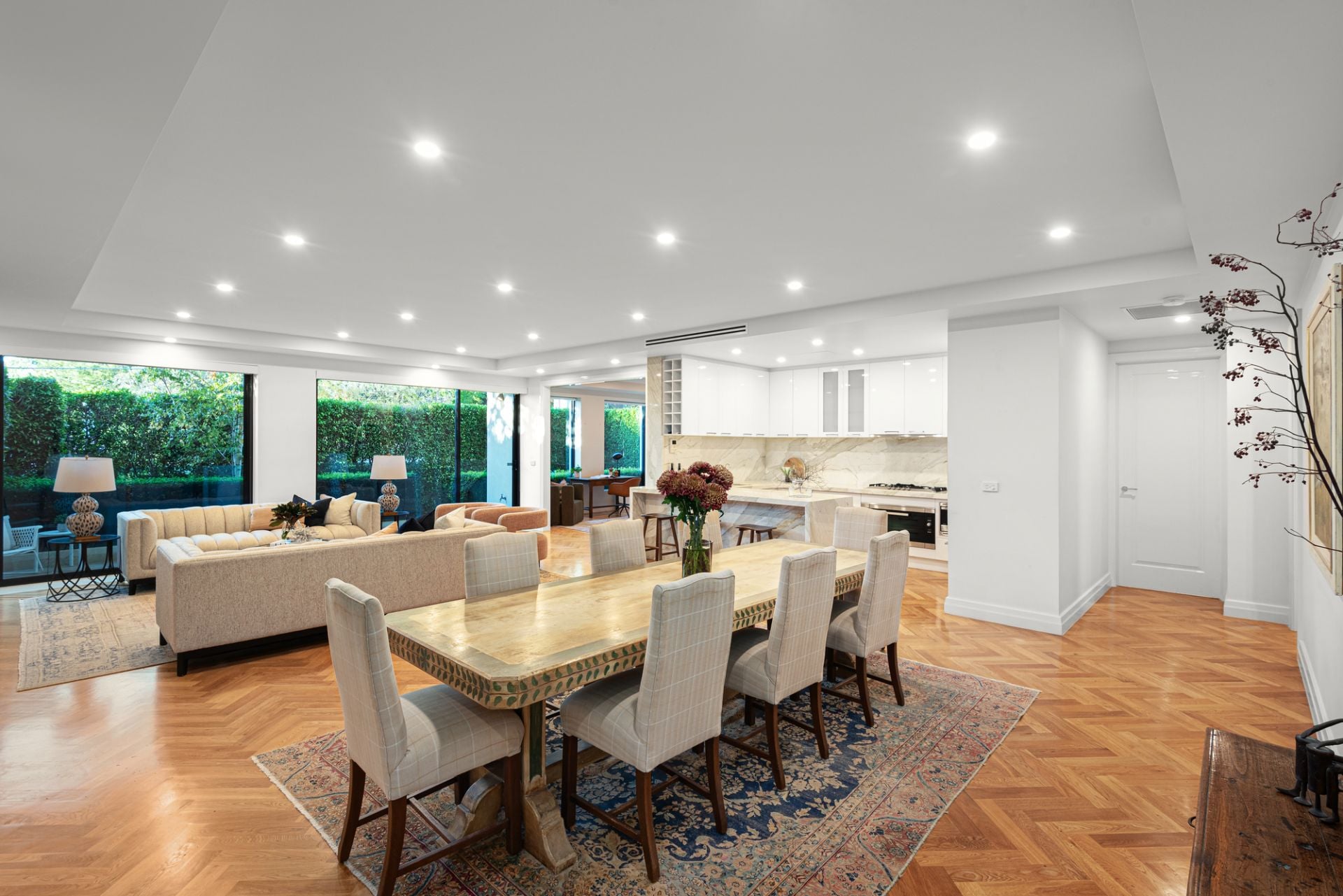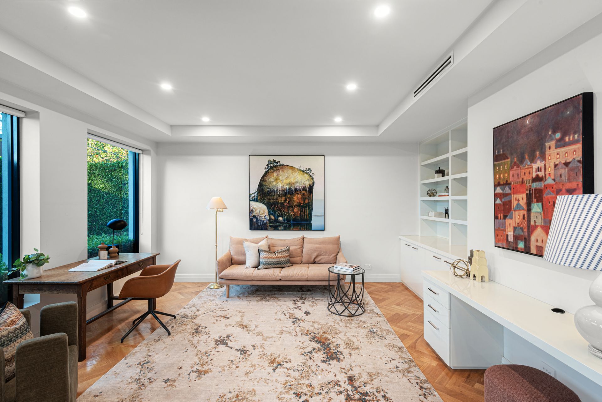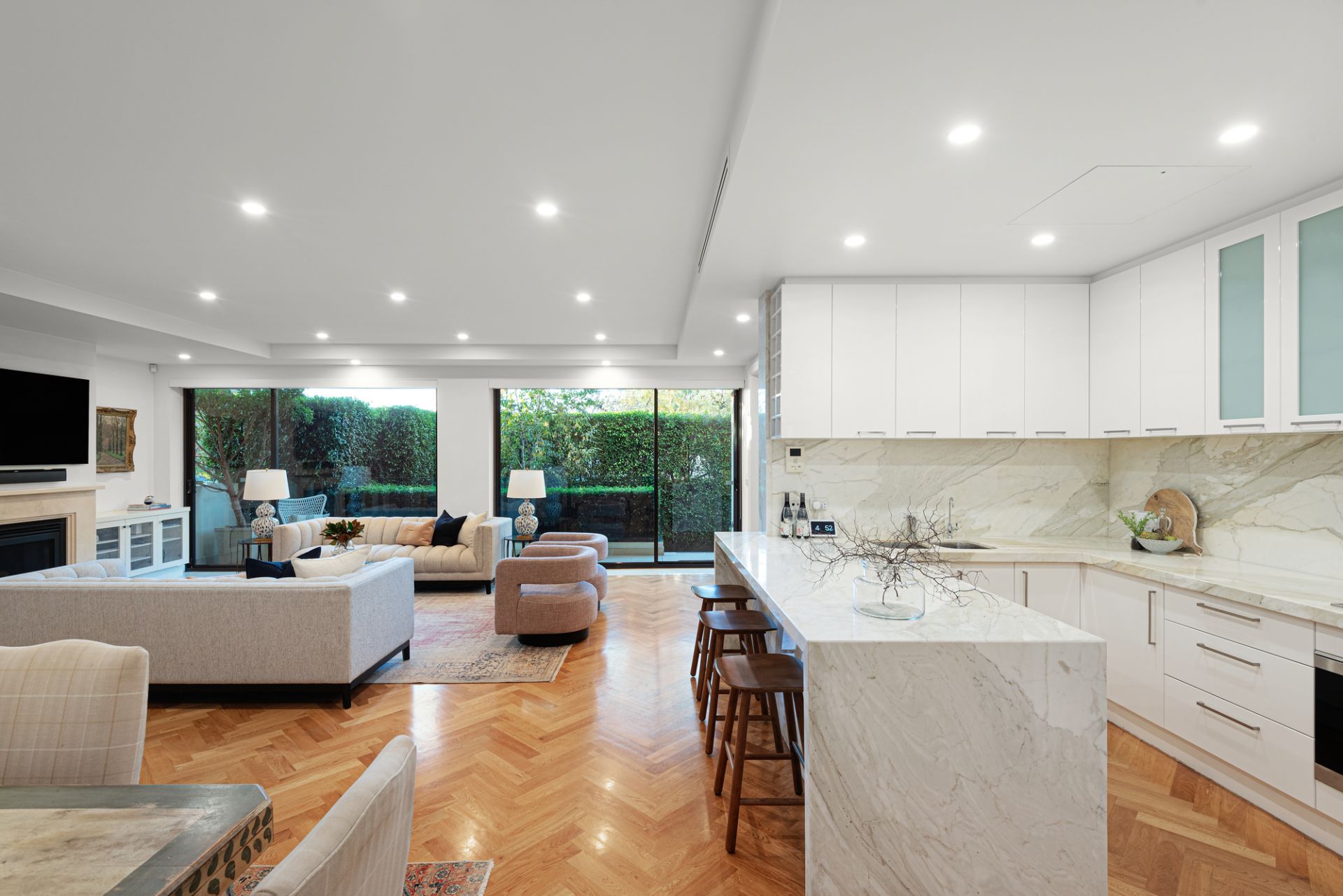 Placed discreetly and securely behind a front yard’s sculpted box hedges, a tranquil interior is a haven of low-maintenance luxury, with high ceilings, herringbone parquetry, and all-day northern sunlight creating an ambiance of airiness and distinction. An open-plan layout sees substantial living, dining, and sitting/study spaces collaborate when it comes time to entertain, flanking a first-class kitchen certain to excite the enthusiastic cook. Highlighting the home’s outstanding proportions, main and guest bedrooms access travertine-laced ensuites and a completely private southern courtyard spanning the home’s entire width, while other features include swathes of marble, upscale Miele appliances, extensive cabinetry, and a waterfall breakfast bar to the kitchen, full-height sliding shutters, plush carpets, walk-in and built-in robes, reverse-cycle heating and cooling, a living-room gas fire, alarm, video intercom, oversized laundry, powder room/third WC, and secure basement parking for two cars.
