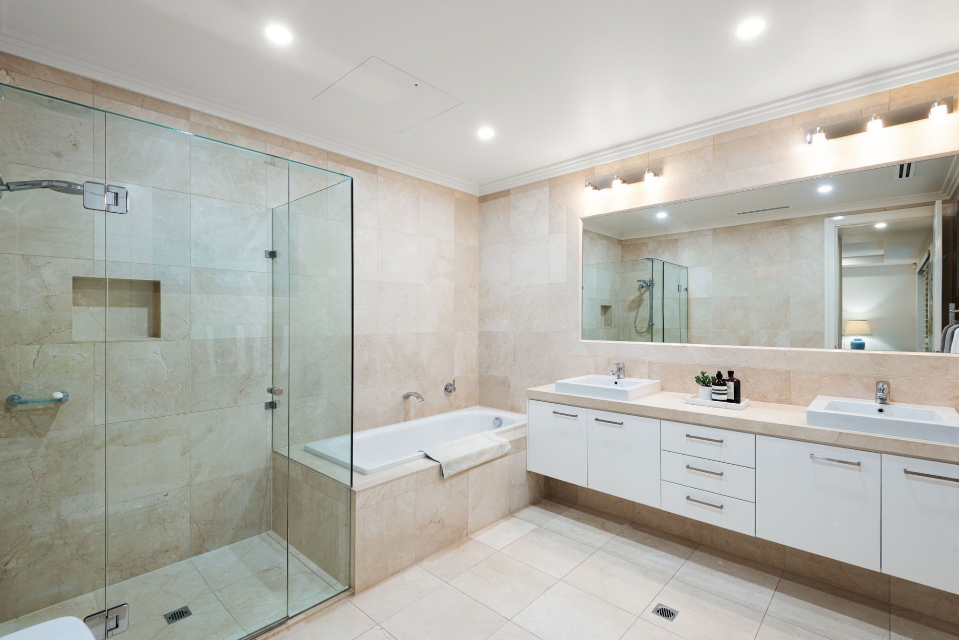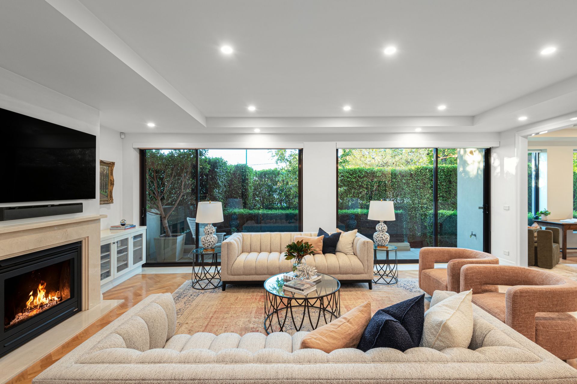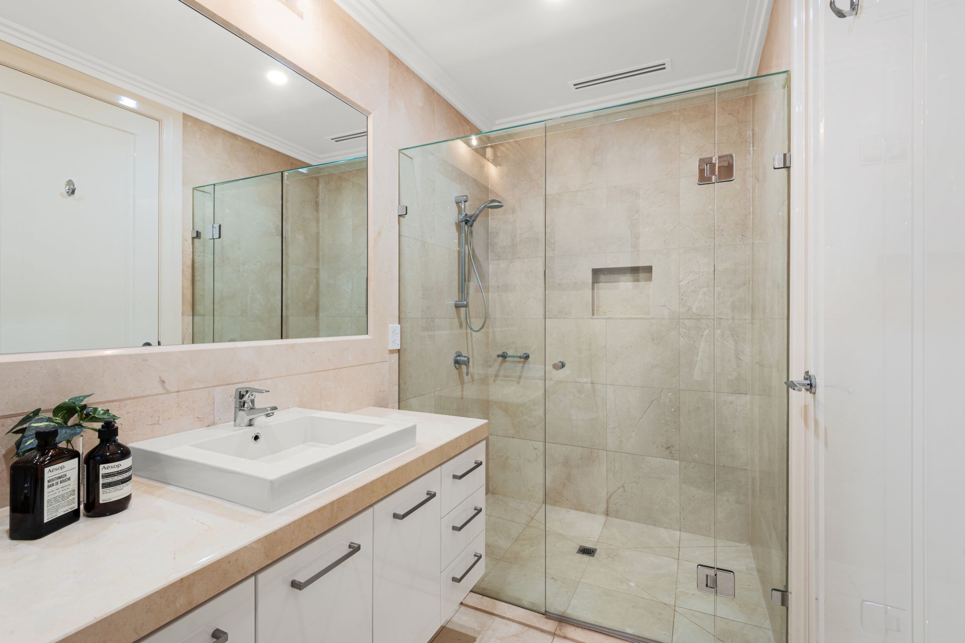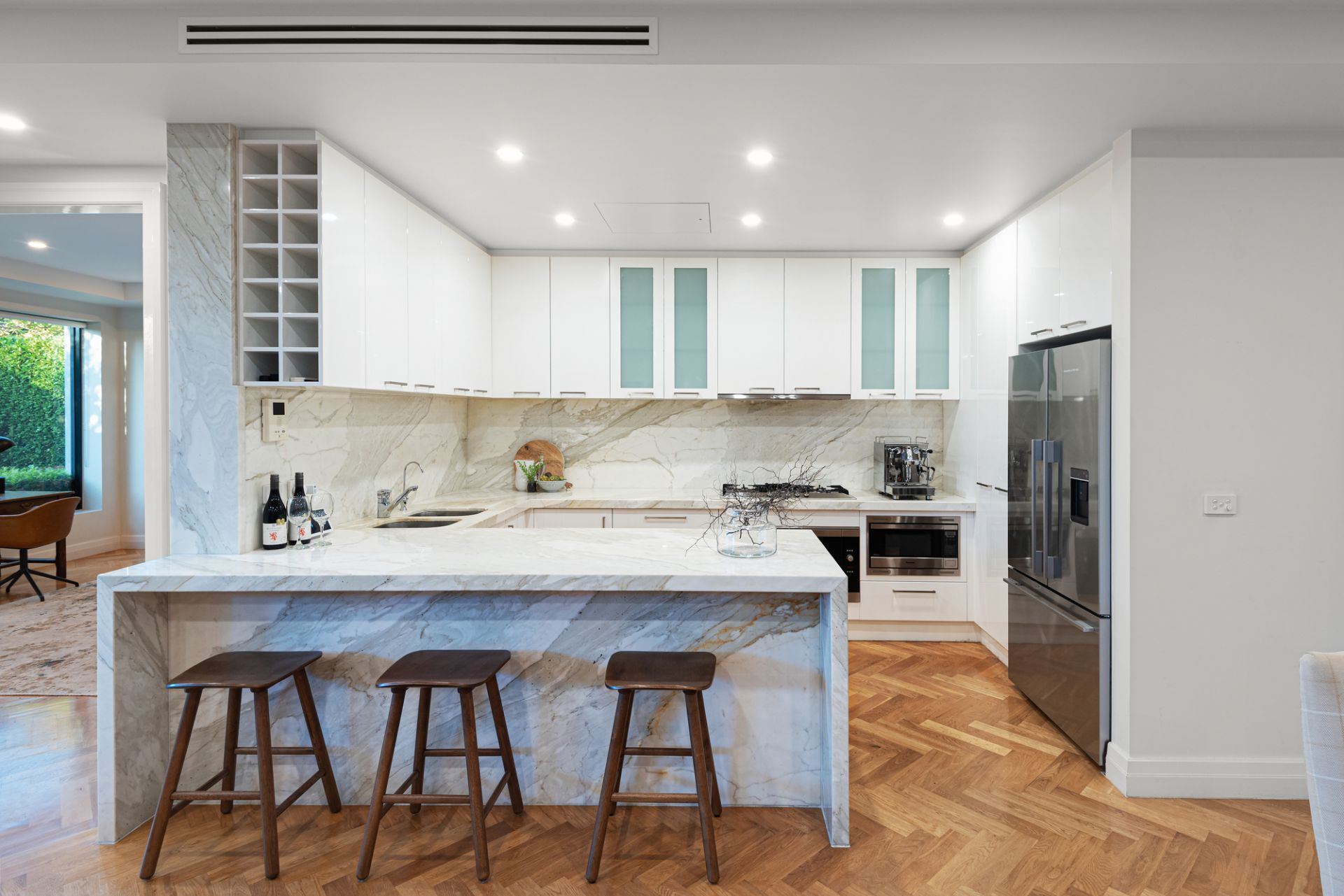 Placed discreetly and securely behind a front yard’s sculpted box hedges, a tranquil interior is a haven of low-maintenance luxury, with high ceilings, herringbone parquetry, and all-day northern sunlight creating an ambiance of airiness and distinction. An open-plan layout sees substantial living, dining, and sitting/study spaces collaborate when it comes time to entertain, flanking a first-class kitchen certain to excite the enthusiastic cook. Highlighting the home’s outstanding proportions, main and guest bedrooms access travertine-laced ensuites and a completely private southern courtyard spanning the home’s entire width, while other features include swathes of marble, upscale Miele appliances, extensive cabinetry, and a waterfall breakfast bar to the kitchen, full-height sliding shutters, plush carpets, walk-in and built-in robes, reverse-cycle heating and cooling, a living-room gas fire, alarm, video intercom, oversized laundry, powder room/third WC, and secure basement parking for two cars.