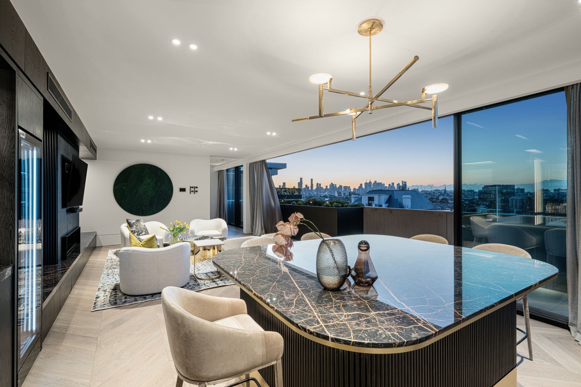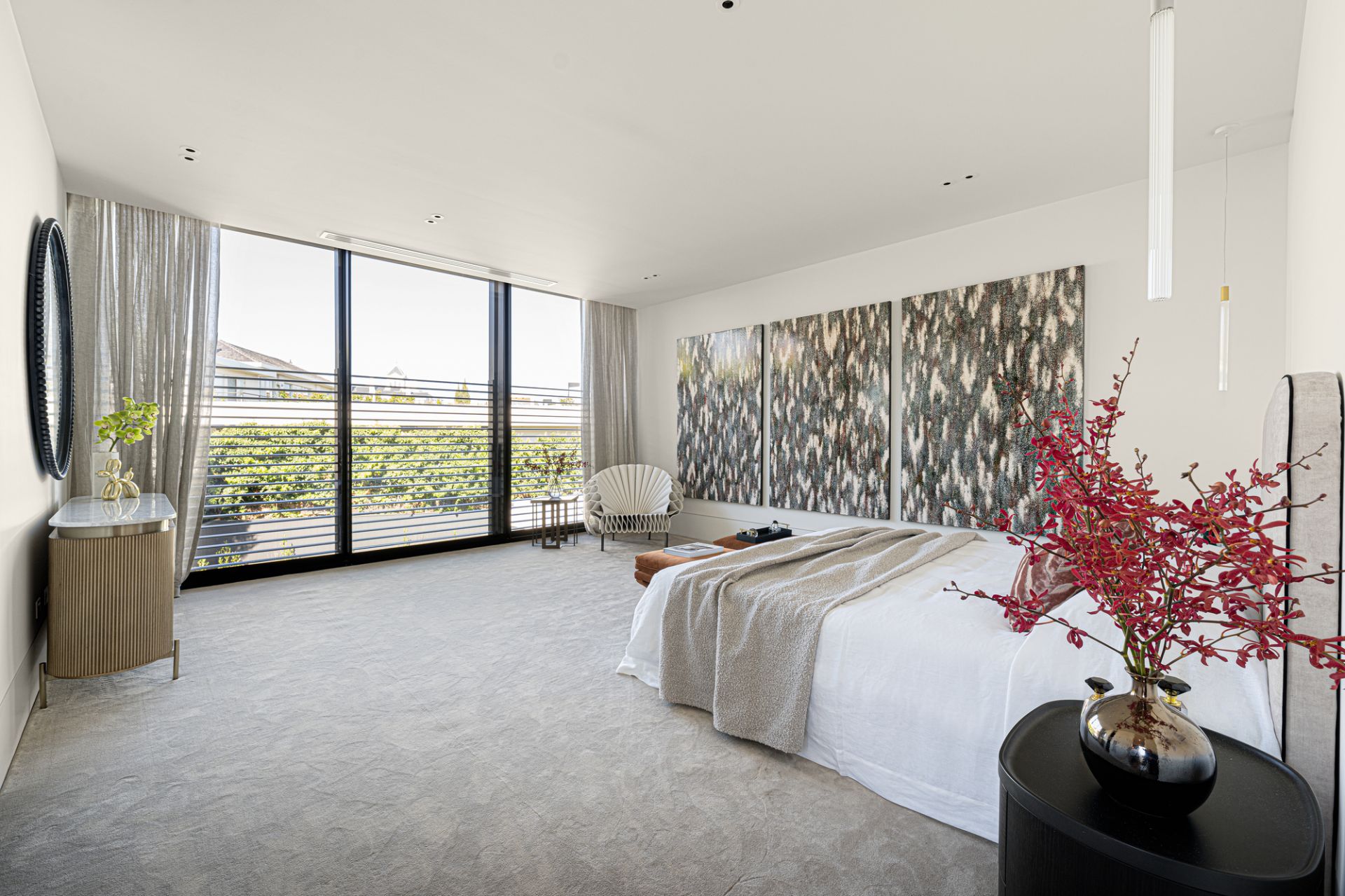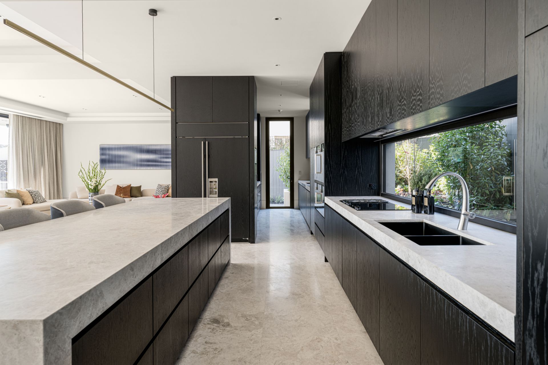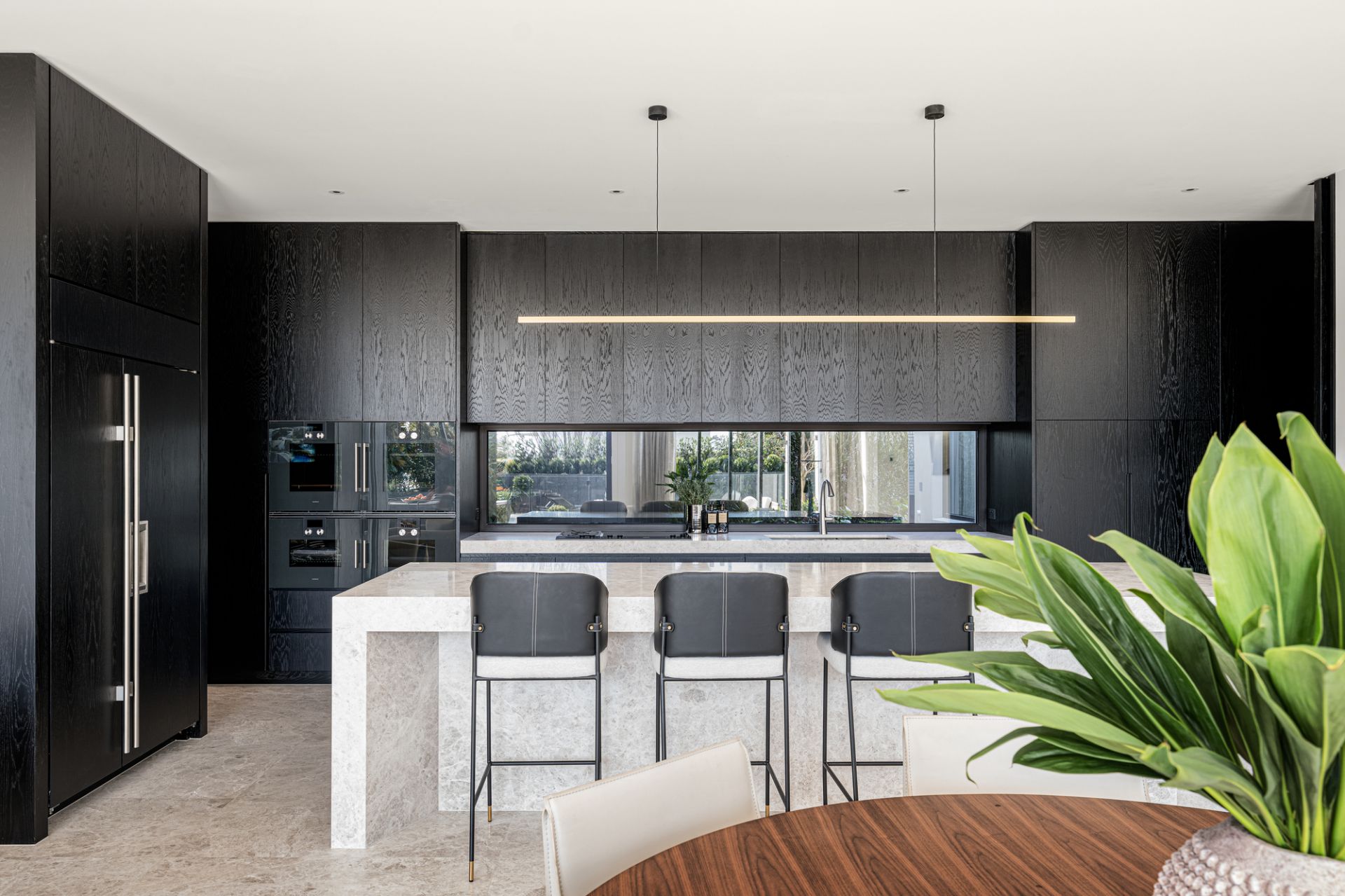 The voluminous living, dining and kitchen area is an impressive centrepiece with the gourmet kitchen pairing an oversized Galassia marble island and dramatic black American oak veneer cabinetry with premium Gaggenau appliances and a Sub-Zero fridge freezer. A butler's pantry with Miele appliances adds to the considered amenity.
