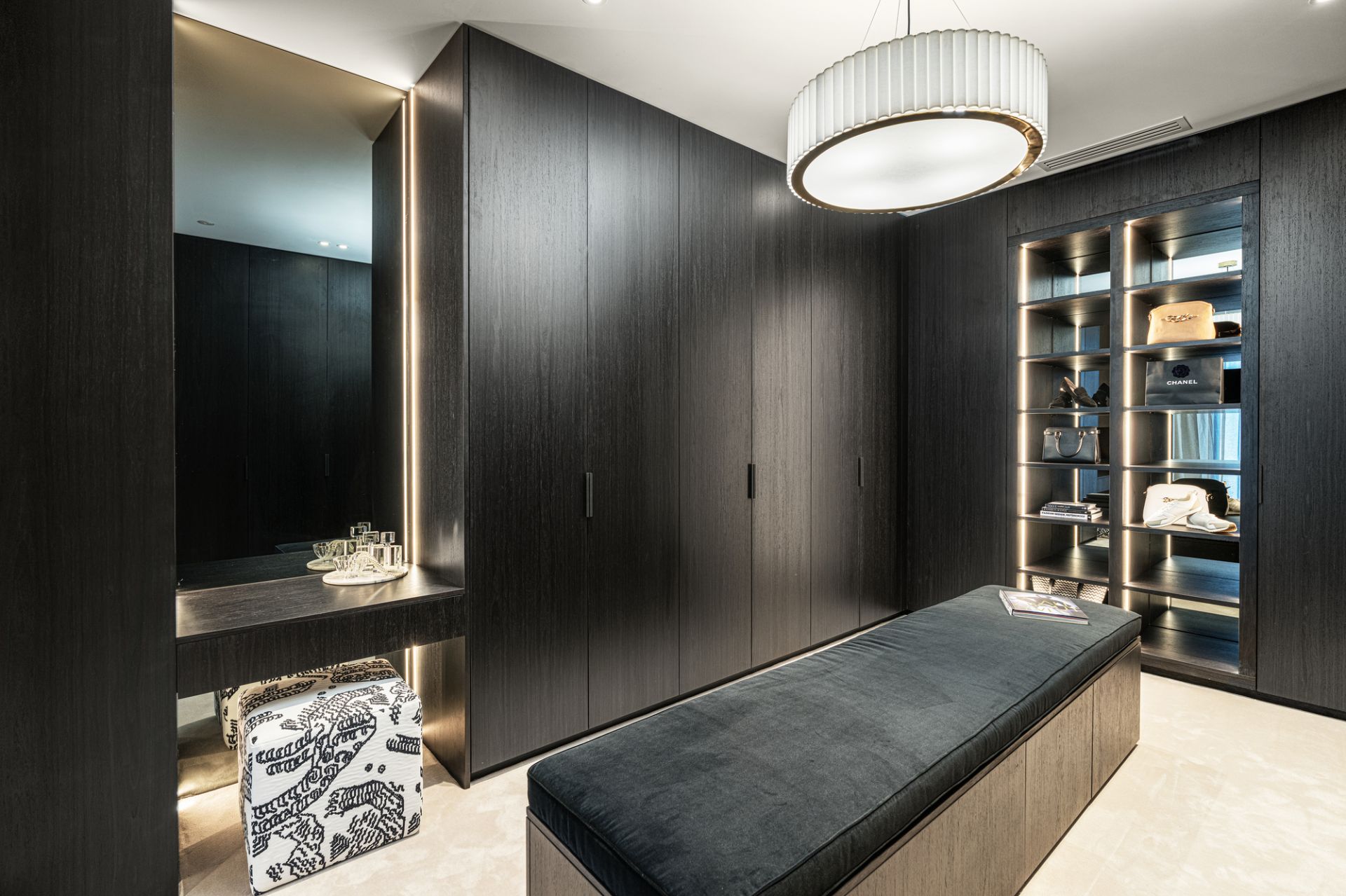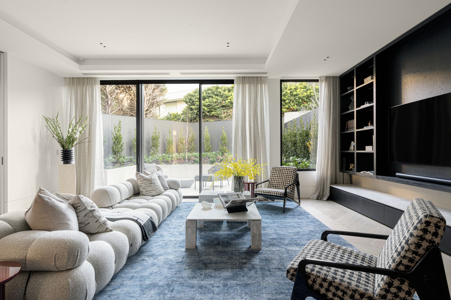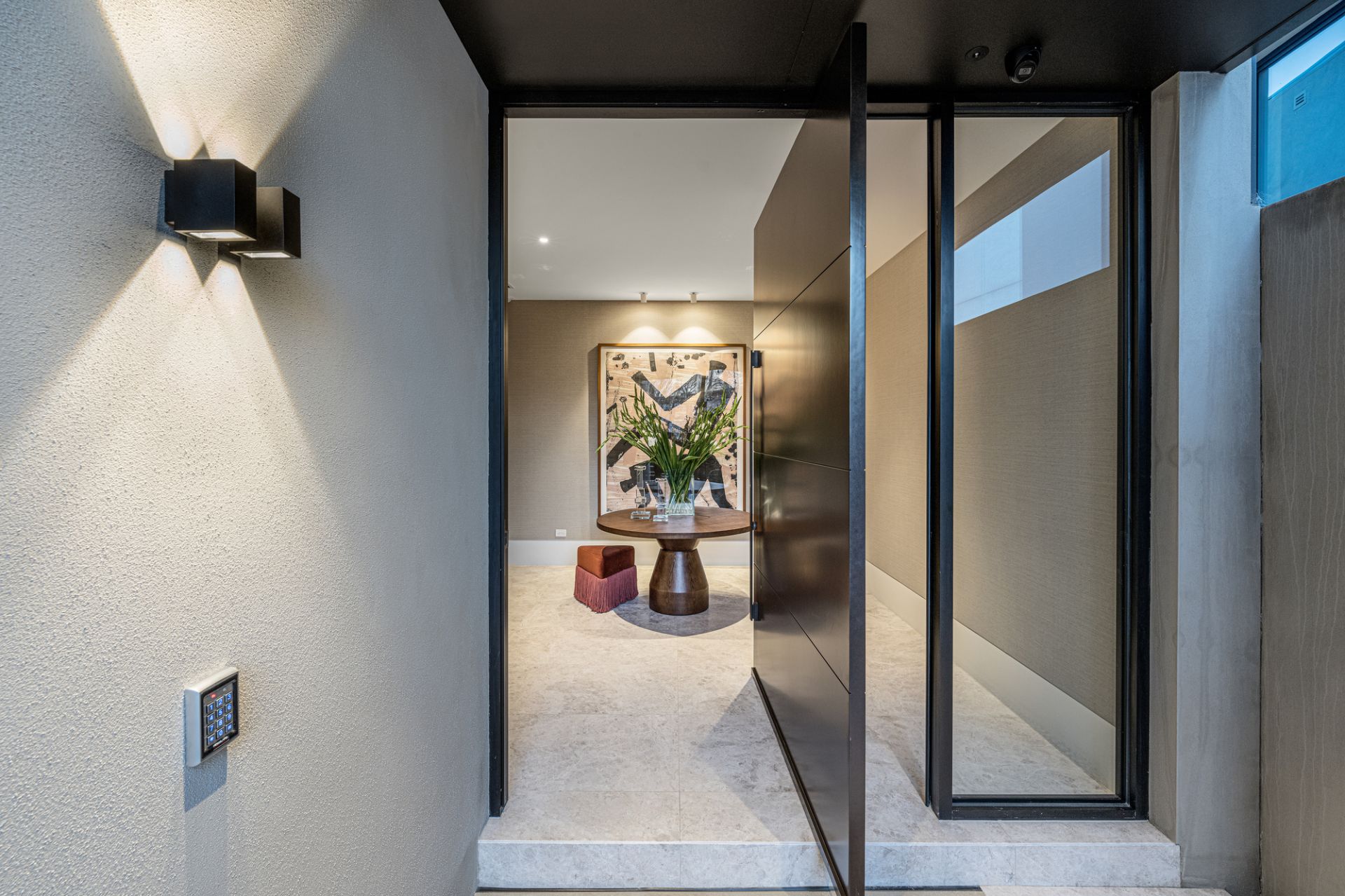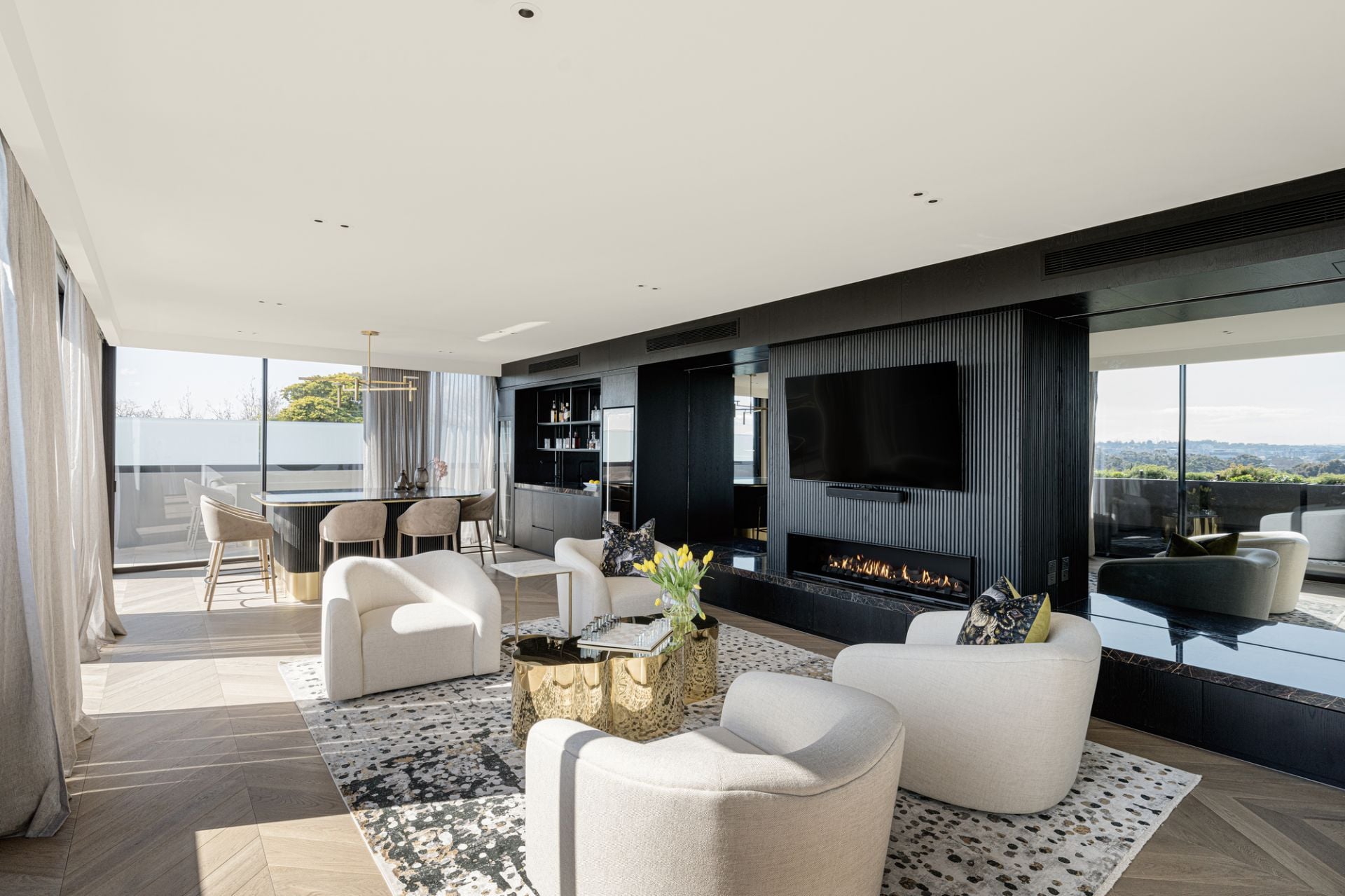 The voluminous living, dining and kitchen area is an impressive centrepiece with the gourmet kitchen pairing an oversized Galassia marble island and dramatic black American oak veneer cabinetry with premium Gaggenau appliances and a Sub-Zero fridge freezer. A butler's pantry with Miele appliances adds to the considered amenity.